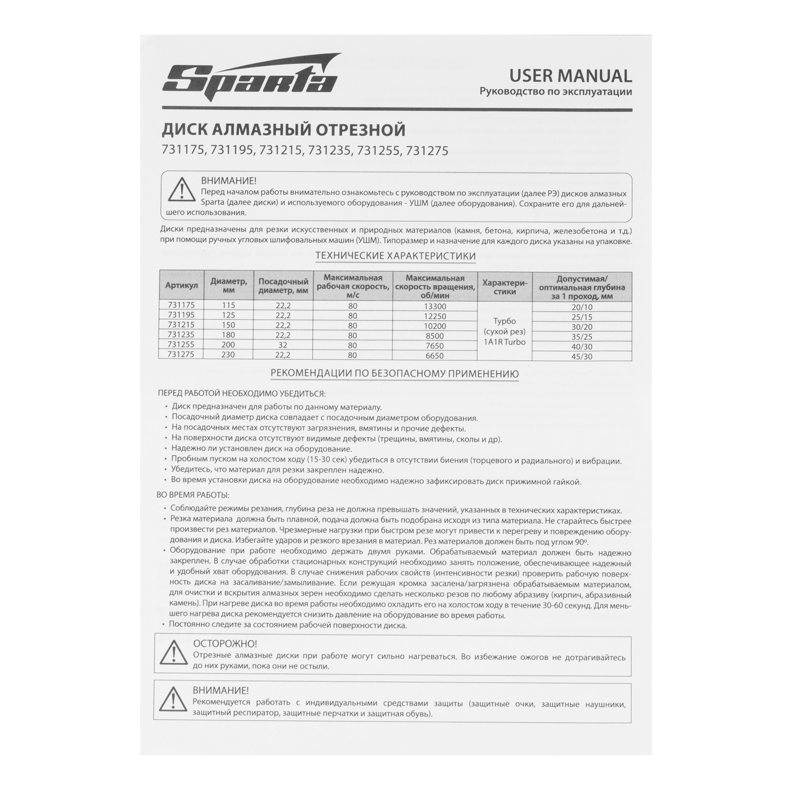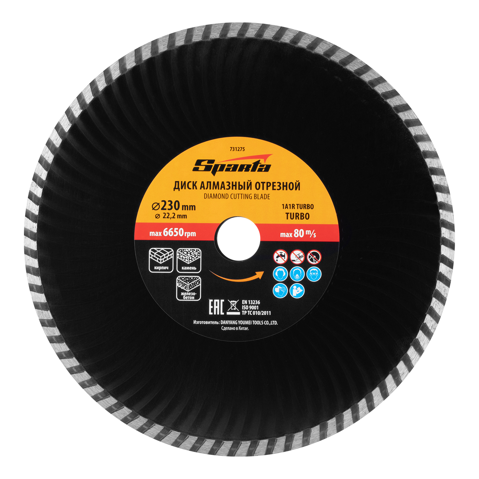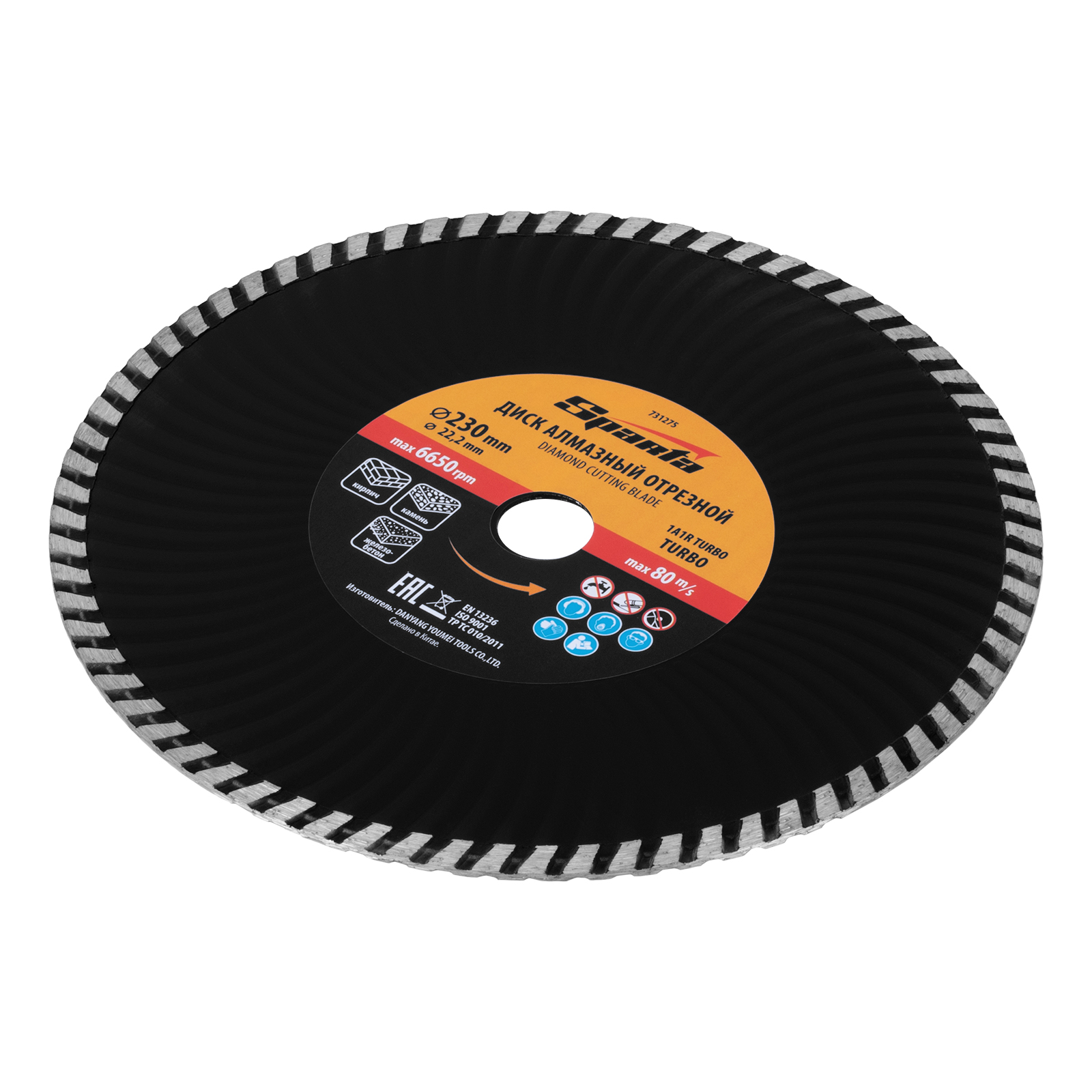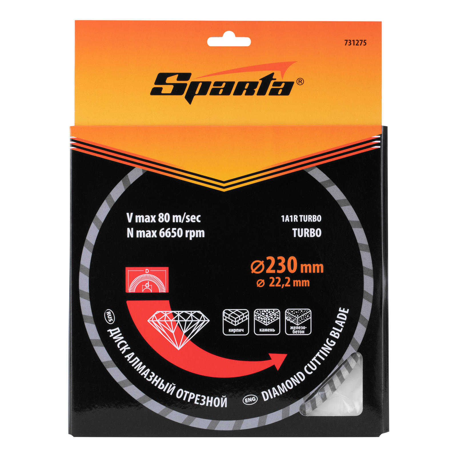 Алмазный отрезной диск Sparta Turbo 731275 для сухой резки, 230 х 22,2 мм, устанавливается на углошлифовальные машинки и предназначен для использования в быту. Он позволяет резать твердые материалы - бетон, железобетон, камень, песчаник.ПреимуществаТурбированная рабочая часть эффективно отводит тепло и шлам, поэтому диск можно использовать для быстрой сухой резки без водяного охлаждения.Диск изготовлен методом холодного прессования, за счет чего успешно противостоит высоким нагрузкам.Алмазный слой шириной 6 мм обеспечивает хорошее качество реза.