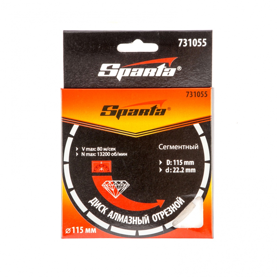Диск алмазный отрезной сегментный Sparta 731055, 115 х 22,2 мм, применяется для сухой резки бетона, камня, шлакоблока, тротуарной плитки и кирпича. Устанавливается на углошлифовальные машины с посадочным диаметром 22,2 мм. Оптимален для решения бытовых задач. Благодаря высокому рабочему ресурсу диск подходит для интенсивной работы.ПреимуществаСегментное строение диска способствует активному отведению тепла и пыли, поэтому водяное охлаждение не требуется.Режущая кромка шириной 7 мм обеспечивает хорошее качество и скорость реза.Рабочий слой нанесен методом холодного прессования, благодаря чему диск характеризуется износостойкостью.