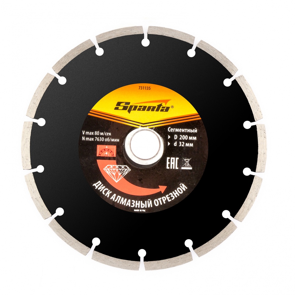 Диск алмазный отрезной сегментный Sparta 731135, 200 х 32 мм, применяется для сухой резки бетона, камня, шлакоблока, тротуарной плитки и кирпича. Устанавливается на углошлифовальные машины с посадочным диаметром 32 мм. Оптимален для решения бытовых задач. Благодаря высокому рабочему ресурсу диск подходит для интенсивной работы.ПреимуществаСегментное строение диска способствует активному отведению тепла и пыли, поэтому водяное охлаждение не требуется.Режущая кромка шириной 7 мм обеспечивает хорошее качество и скорость реза.Рабочий слой нанесен методом холодного прессования, благодаря чему диск характеризуется износостойкостью.
