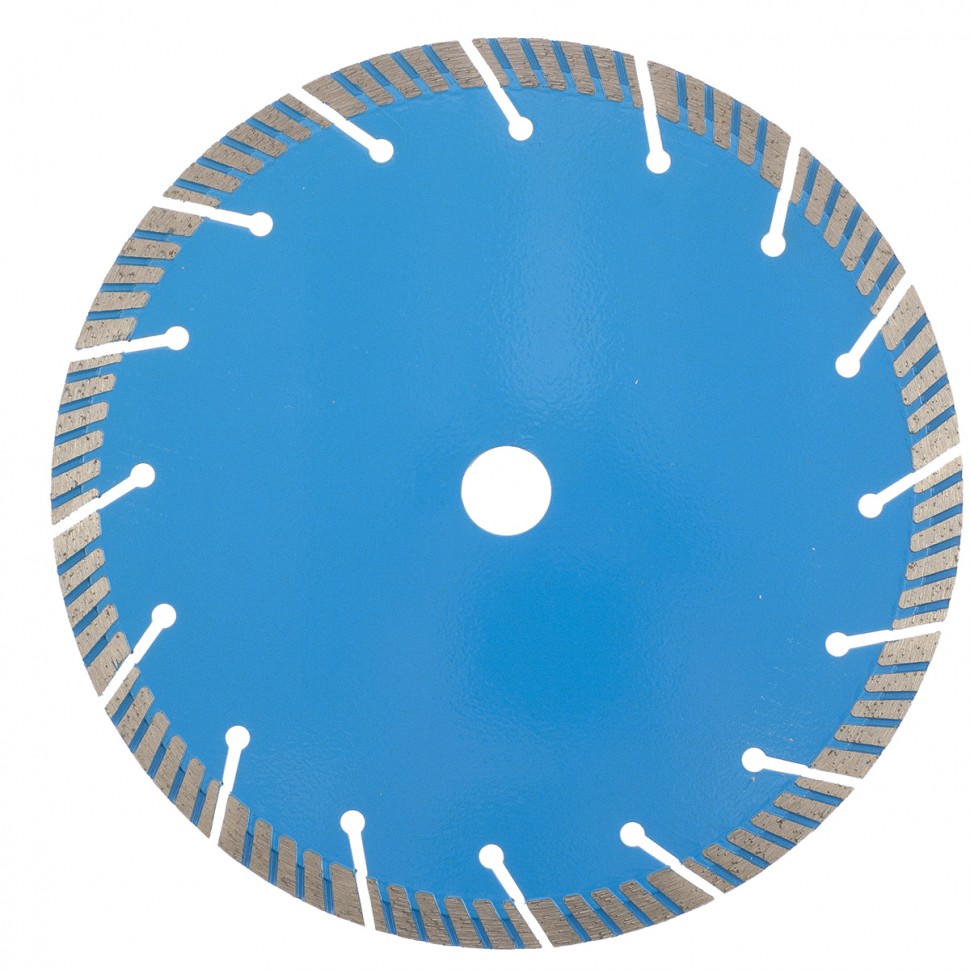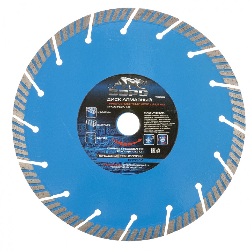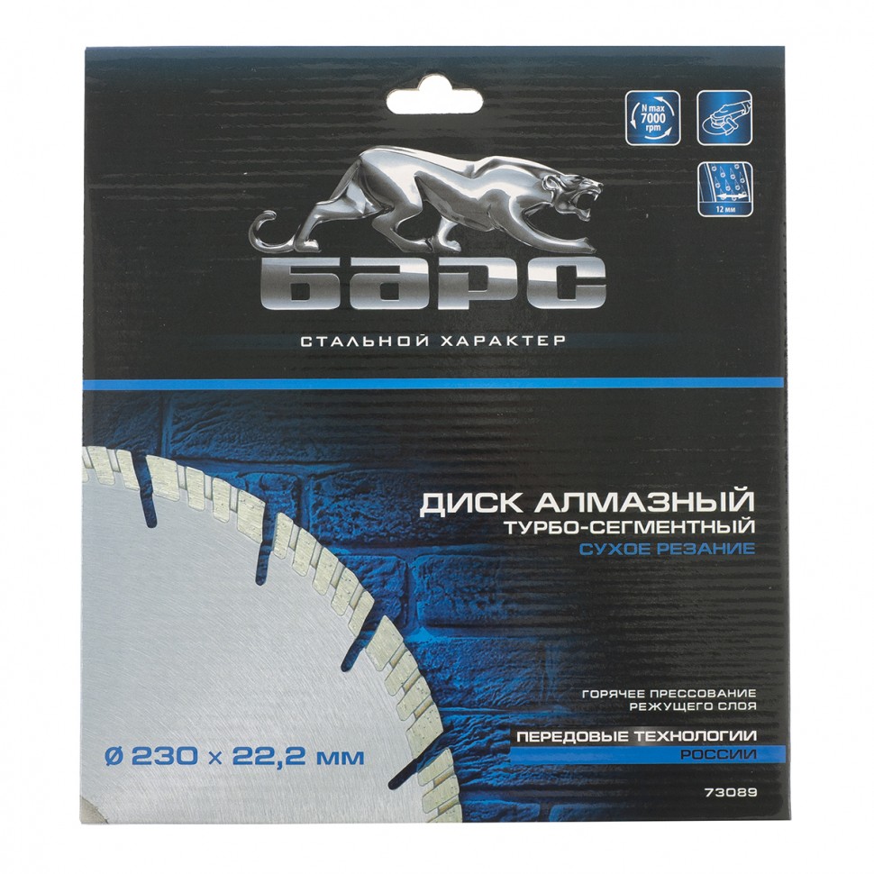 Турбо-сегментный алмазный диск Барс 73089 диаметром 230 х 22,2 мм устанавливается на УШМ и позволяет проводить сухое резание твердых материалов: камня, песчаника, кирпича, гранита, бетона, в т.ч. свежего и среднеармированного. Благодаря турбо-сегментной конструкции диск не требует водяного охлаждения и позволяет успешно решать поставленные задачи. Преимущества Эффективное охлаждение — благодаря турбированным рабочим кромкам диск выдерживает интенсивное использование. Износостойкость — режущий слой состоит из высококачественных синтетических алмазов плотной концентрации, его ширина увеличена до 12 мм. Продуманная конструкция — прорези заужены и расположены под углом, что исключает потерю алмазного слоя и поломку диска при соприкосновении с арматурой. Надежность — диск изготовлен по технологии горячего прессования, оптимально подобранная связка повышает теплостойкость, позволяя работать с высокой скоростью. Прочность и коррозионная стойкость — корпус диска изготовлен из инструментальной стали 65Mn и покрыт защитной краской.