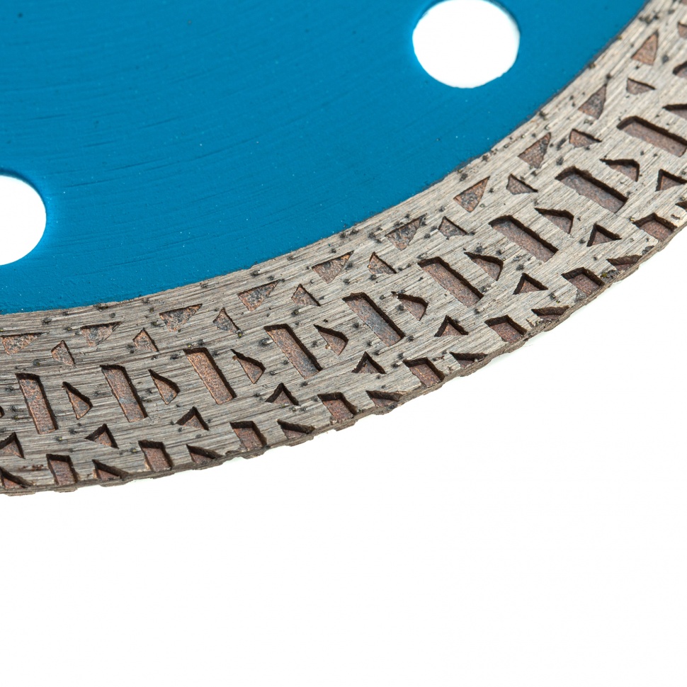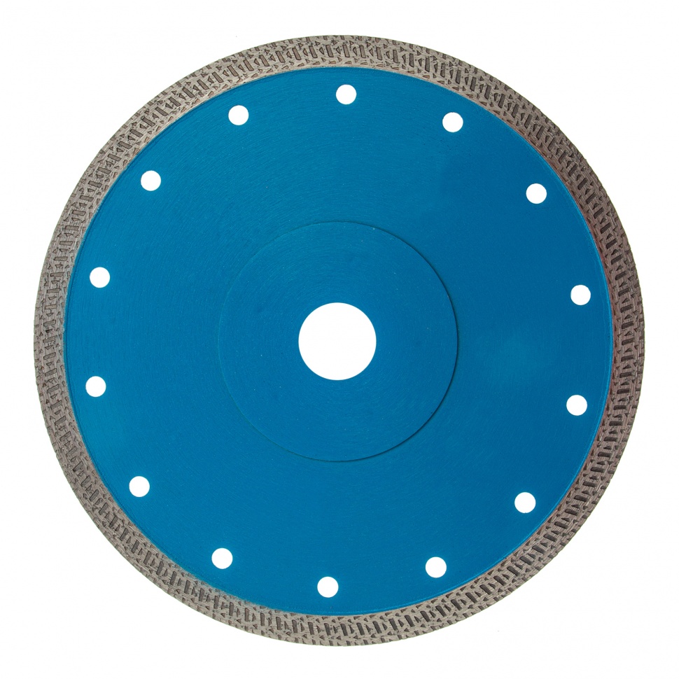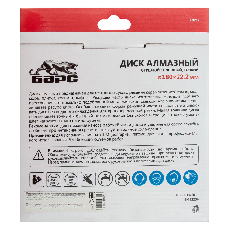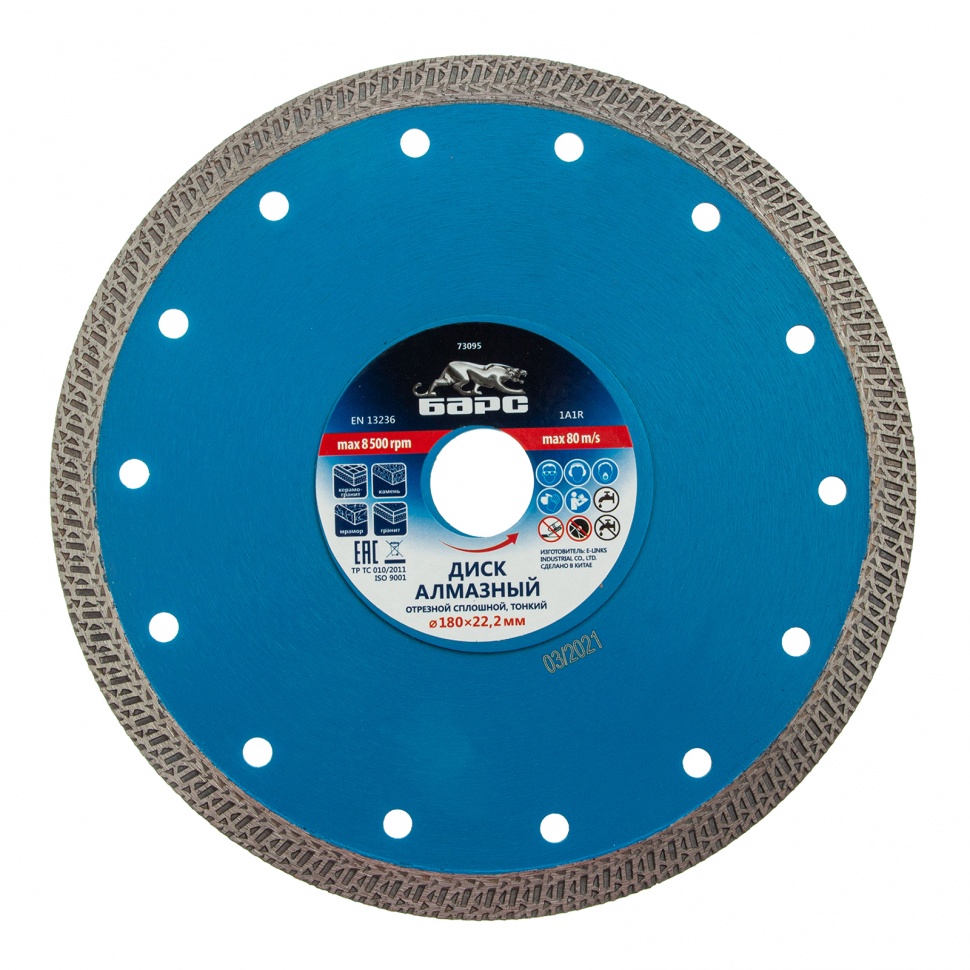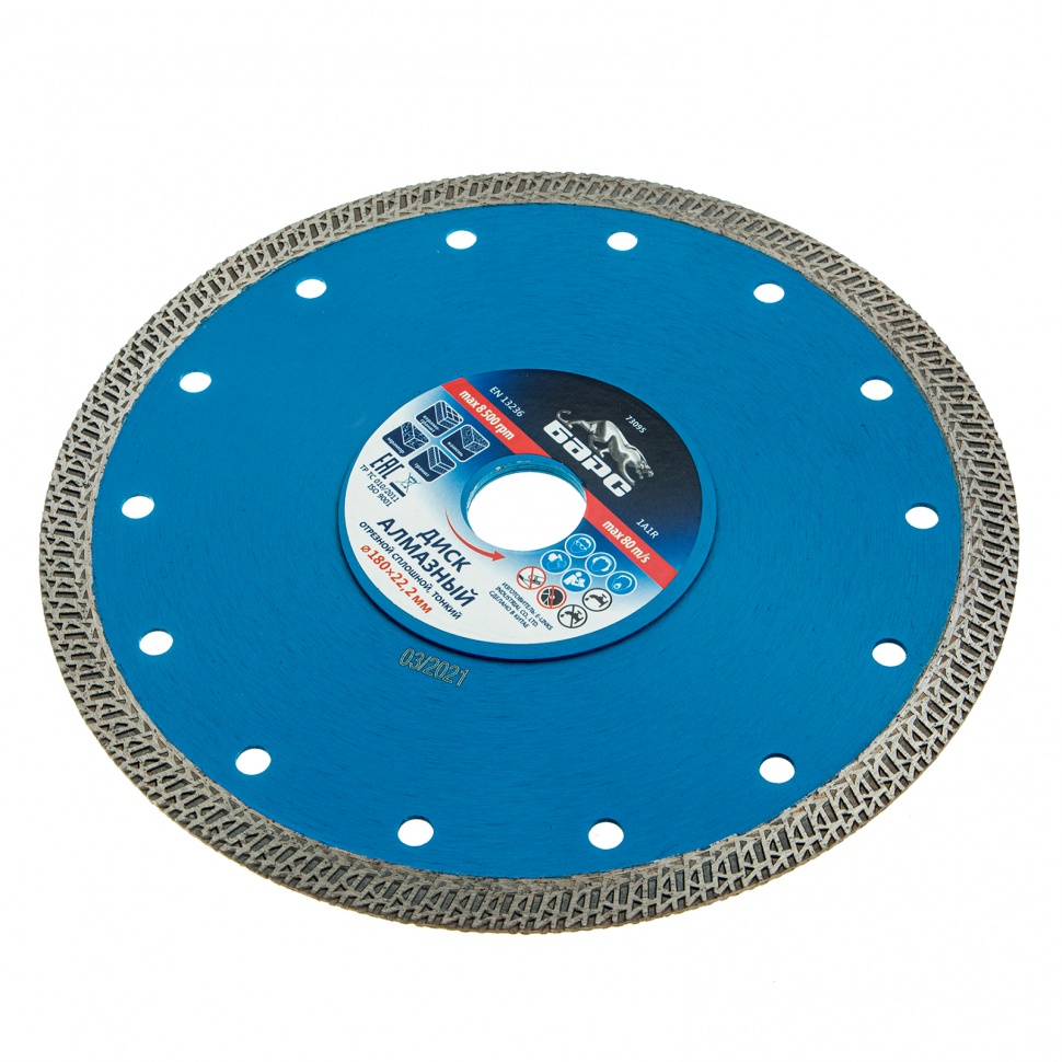 Тонкий сплошной алмазный диск Барс 73095 диаметром 180 х 22,2 мм с особой формой рабочей части применяется как для сухого, так и «мокрого» резания гранита и керамогранита, плитки, кафеля, мрамора, искусственного и натурального камня с помощью УШМ или плиткореза. Обеспечивает быстрый качественный рез без сколов. Уменьшенная толщина диска позволяет снизить нагрузку на рабочий инструмент при резке керамогранита и других твердых материалов. Диск предназначен для профессиональной эксплуатации. Использование водяного охлаждения увеличивает ресурс диска и повышает качество реза. Преимущества Устойчивость к перегреву — в состав специально подобранной под тип диска связки включены тугоплавкие соединения металлов. Высокая производительность — режущая кромка шириной 10 мм отличается плотной концентрацией алмазов. Прочная конструкция — диск изготовлен по технологии горячего прессования, зона рядом с посадочным отверстием усилена специальными накладками. Эффективное охлаждение — рабочая часть имеет вид сетчатого орнамента, что позволяет уменьшить трение во время резания.