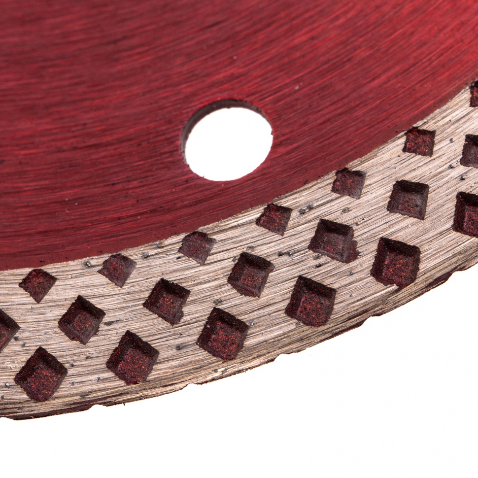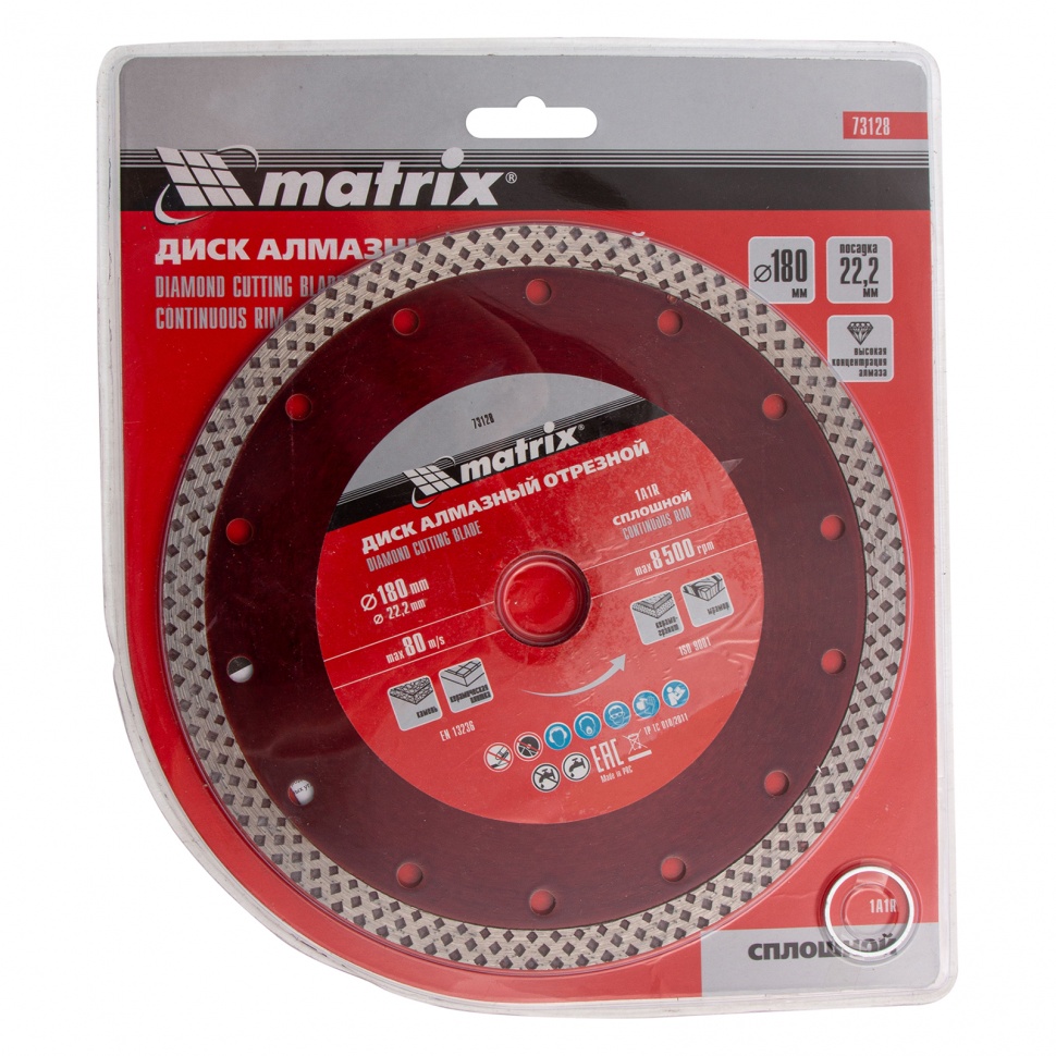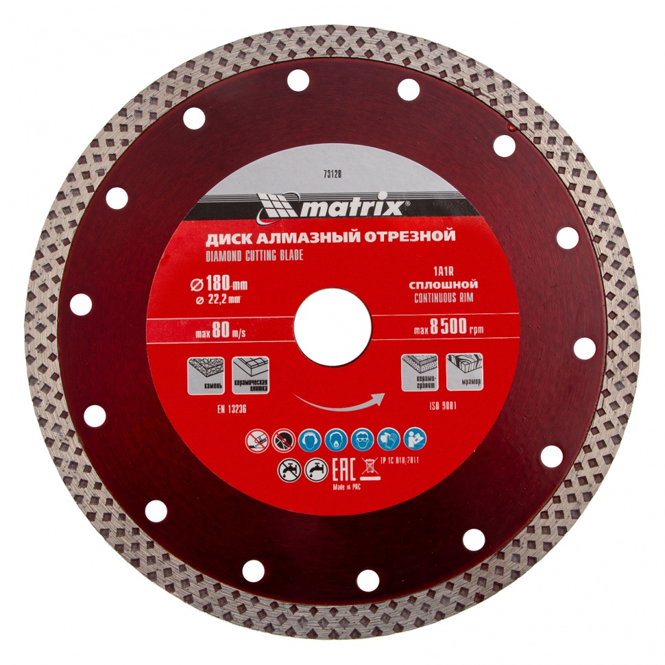 Отрезной алмазный диск Matrix 73128, сплошной, 180 мм - оснастка для болгарок и плиткорезов с диаметром вала 22,2 мм. Он применяется для резки мрамора, искусственного и натурального камня, керамогранитной и керамической плитки. Использование без подачи воды расширяет возможности инструмента. Диск предназначен для бытового применения. Рекомендуется использовать водяное охлаждение для увеличения ресурса диска.ПреимуществаБлагодаря высокой концентрации алмазов срез получается чистым и ровным.Режущая кромка шириной 10 мм способствует повышению производительности.Отверстия в корпусе диска способствуют активному охлаждению, что позволяет использовать диск для сухой резки.Диск выполнен нанесен методом холодного прессования, поэтому устойчив к механическим нагрузкам.