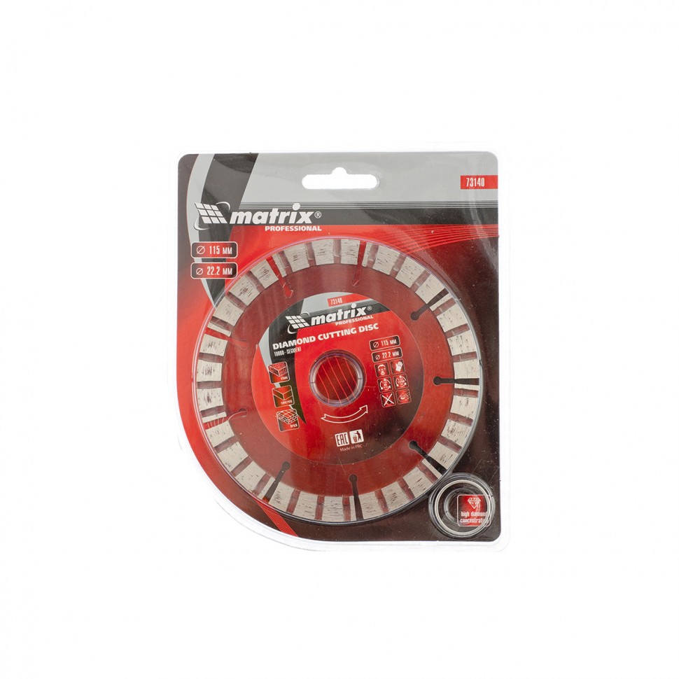 Турбо-сегментный отрезной алмазный диск Matrix 73140, 115 х 22,2 мм, предназначен для сухой резки бетона различной прочности, камня, кирпича, тротуарной плитки, шлакоблока. Он устанавливается на углошлифовальные машины с посадочным отверстием 22,2 мм. Благодаря специально подобранной металлической связке диск демонстрирует высокие результаты работы даже при резке слабоармированного железобетона.ПреимуществаЗа счет турбированной поверхности сегментов отрезной круг не нагревается, сохраняет высокую производительность и не требует водяного охлаждения.Ширина рабочего слоя 10 мм и увеличенная концентрация алмазов обеспечивают повышенный ресурс оснастки.Диск устойчив к нагрузкам, изготовлен методом холодного прессования.Диск оптимально подходит для бытового применения, рассчитан на долгую службу.