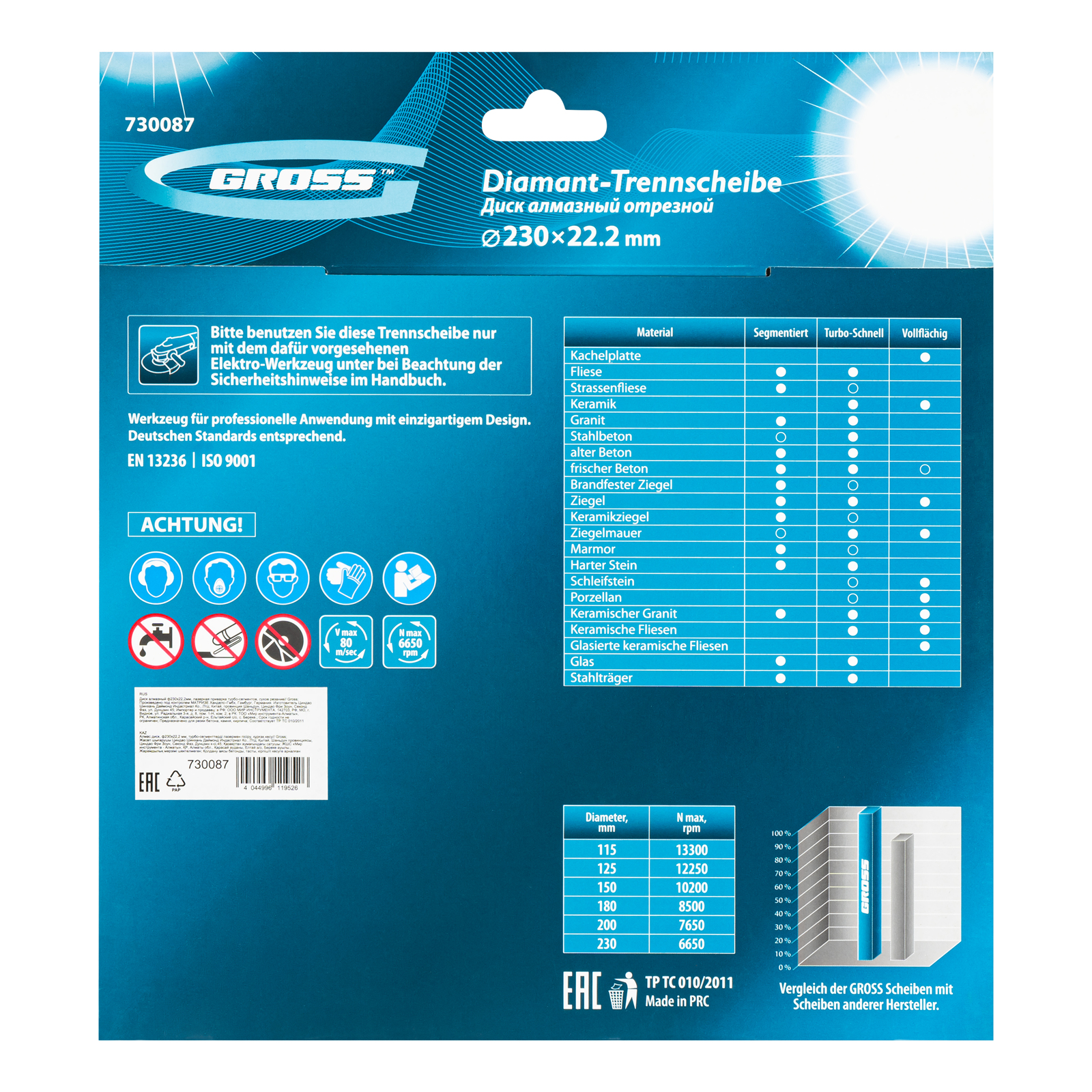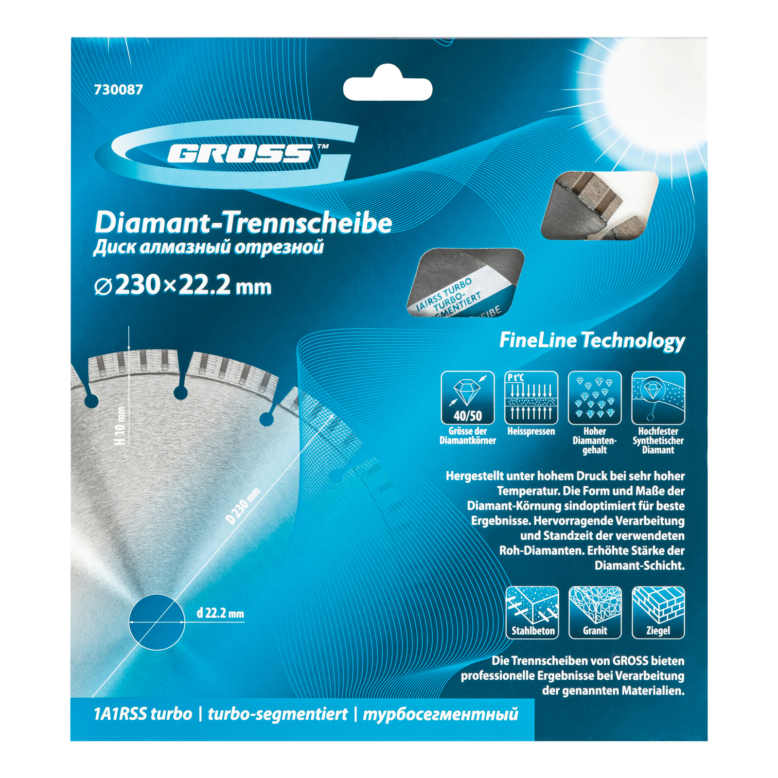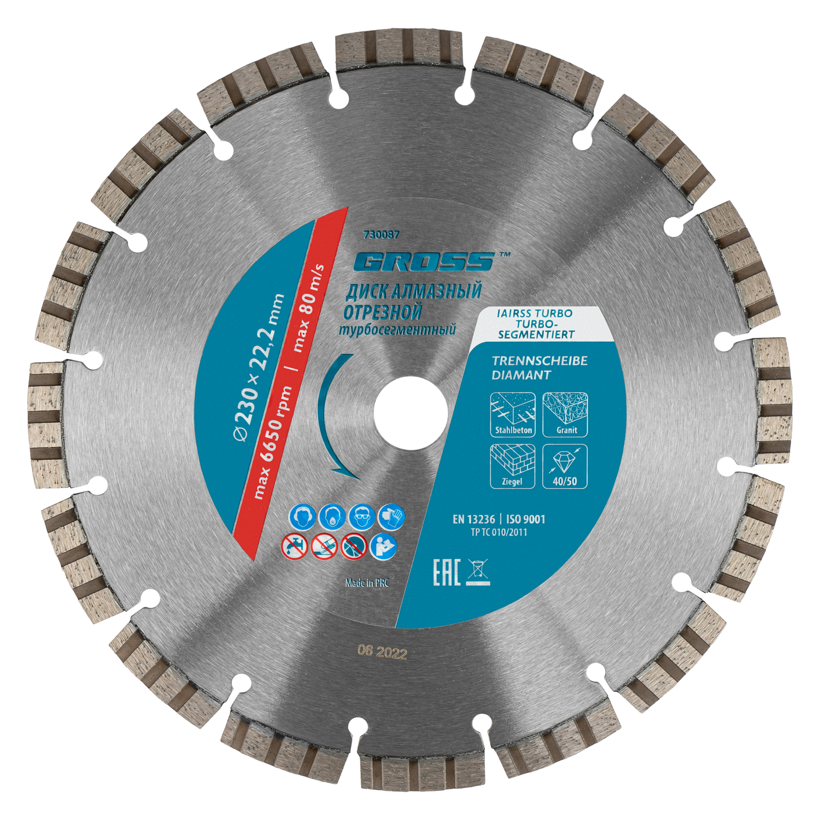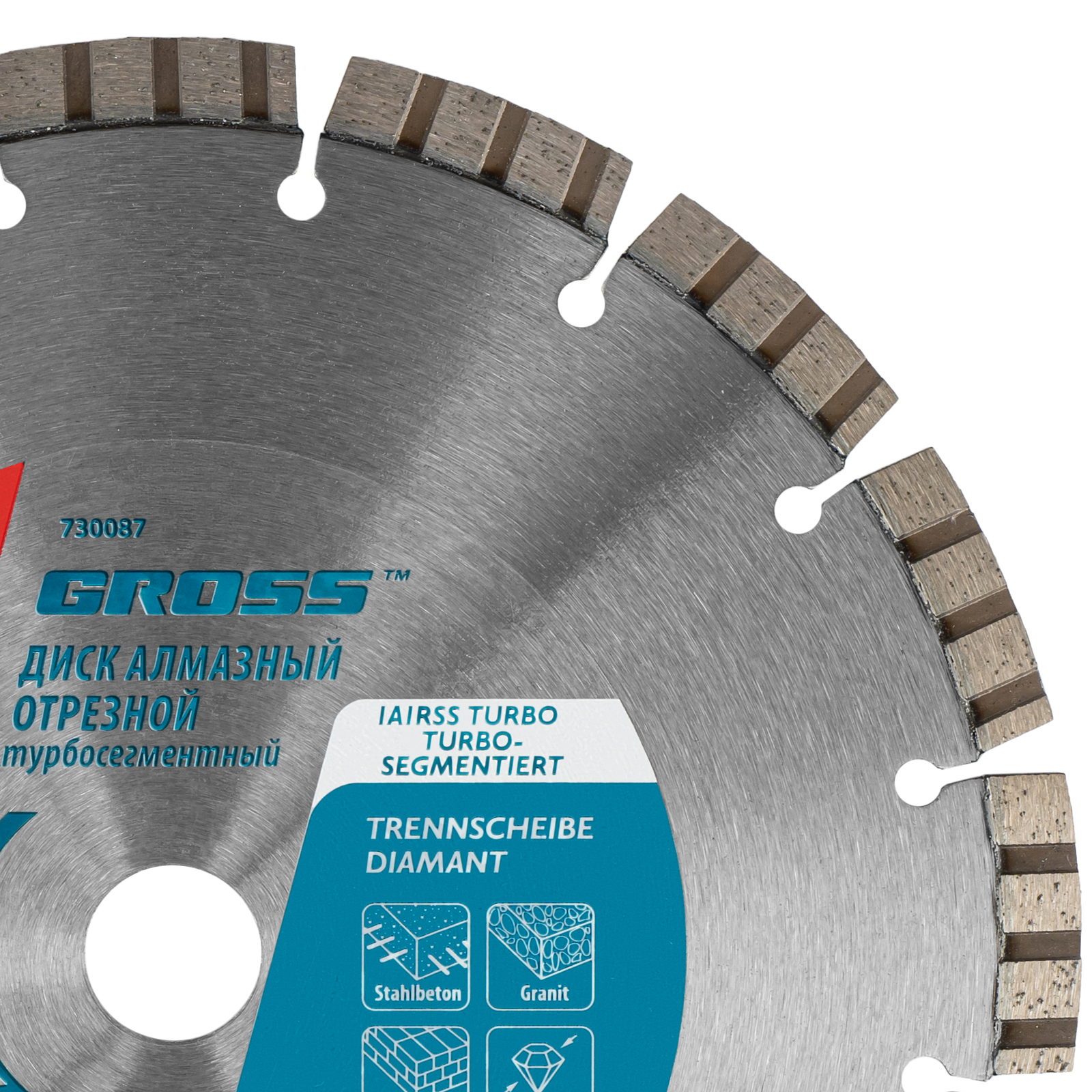 Алмазный диск Gross 730087 диаметром 230 х 22,2 мм с лазерной приваркой турбо-сегментов предназначен для сухого резания бетона, в том числе свежего, слабоармированного железобетона, кирпича, песчаника и гранита. Посадочный диаметр 22,2 мм позволяет использовать диск в качестве оснастки для УШМ. Турбо-сегментное строение обеспечивает быстрое сухое резание без необходимости водяного охлаждения. Благодаря оптимально подобранной связке диск выдерживает высокие нагрузки при выполнении большого объема работ. Подходит как для интенсивного бытового, так и для профессионального применения. Преимущества Прочность — диск из стали 65Mn способен быстро резать различные материалы, в т.ч. слабоармированный бетон, без риска деформации. Надежная фиксация алмазного слоя — лазерная приварка сегментов обеспечивает диску высокую стойкость к нагрузкам. Повышенная производительность — режущий слой состоит из алмазов размером 40-50 мкм, его ширина составляет 10 мм. Высокий рабочий ресурс — металлическая связка, в составе которой серебро, кобальт и другие высококачественные компоненты, надежно удерживает алмазные зерна, обеспечивает равномерный износ и своевременное обновление режущего слоя. Коррозионная стойкость — корпус покрыт защитным бесцветным лаком. Гарантированное качество — диск изготовлен на современном оборудовании с соблюдением строго технологического контроля.