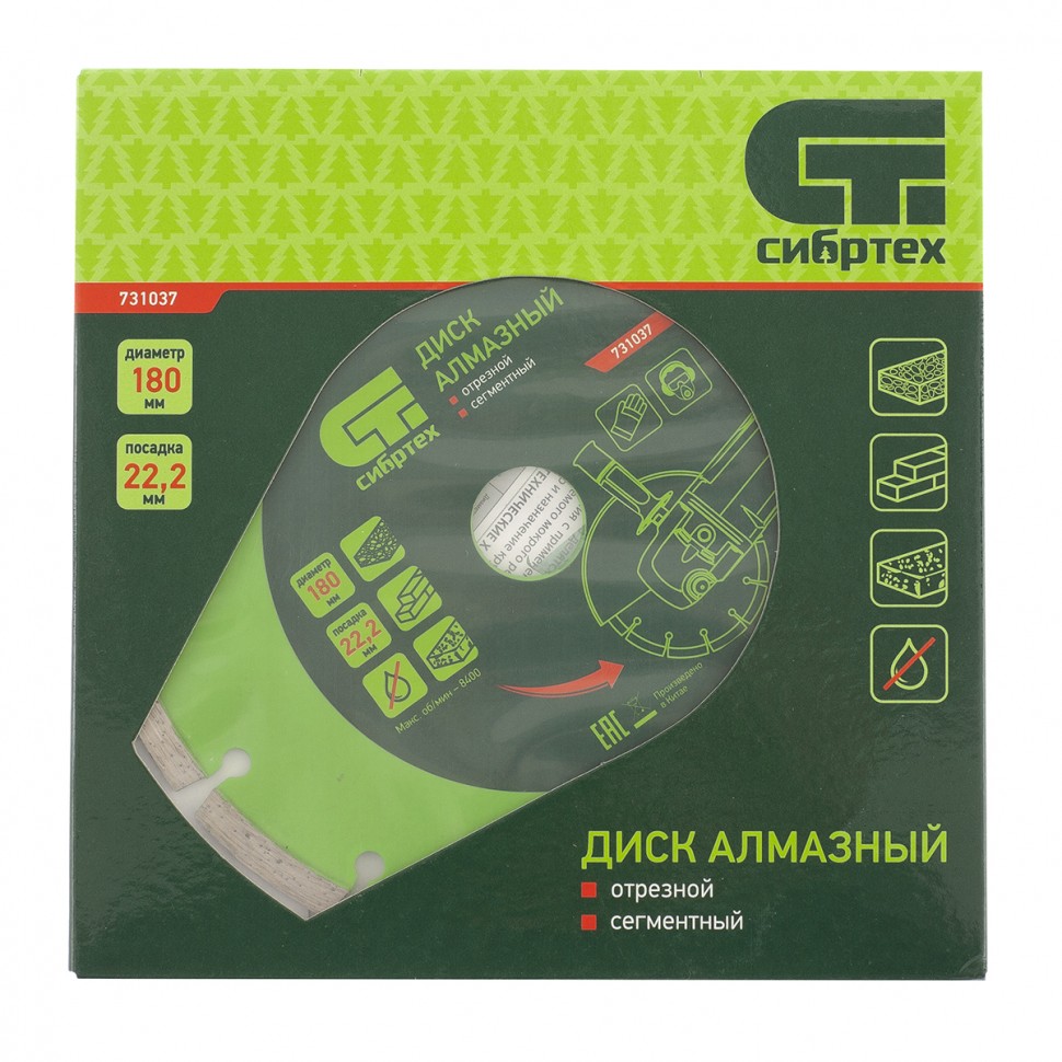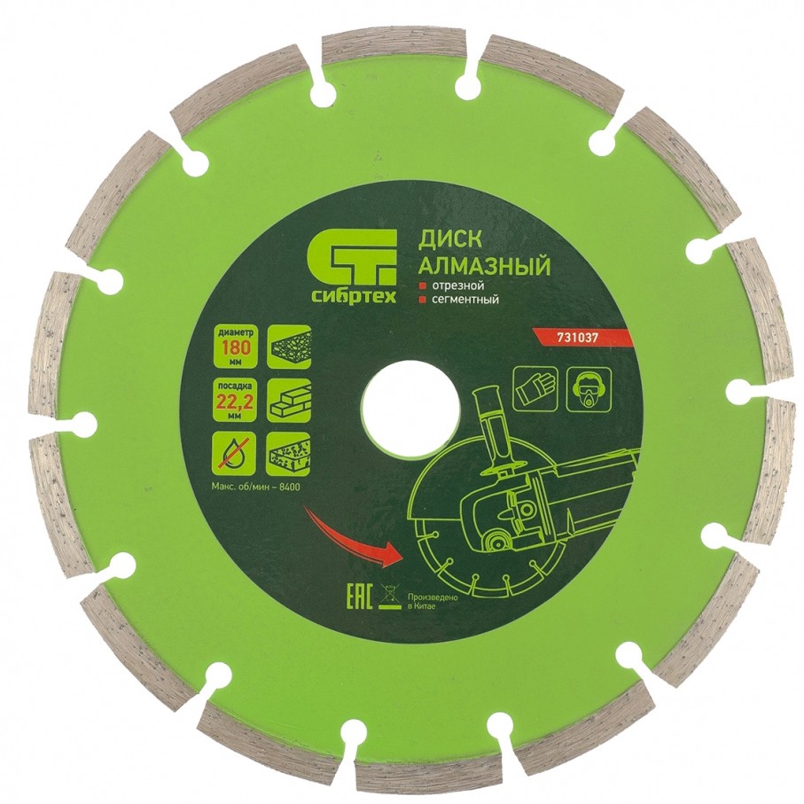 Диск алмазный отрезной сегментный Сибртех 731037, 180 х 22,2 мм, применяется для сухой резки бетона, камня, шлакоблока, тротуарной плитки и кирпича. Устанавливается на углошлифовальные машины с посадочным диаметром 22,2 мм. Оптимален для решения бытовых задач. Благодаря высокому рабочему ресурсу диск подходит для интенсивной работы.ПреимуществаСегментное строение диска способствует активному отведению тепла и пыли, поэтому водяное охлаждение не требуется.Режущая кромка шириной 7 мм обеспечивает хорошее качество и скорость реза.Рабочий слой нанесен методом холодного прессования, благодаря чему диск характеризуется износостойкостью.
