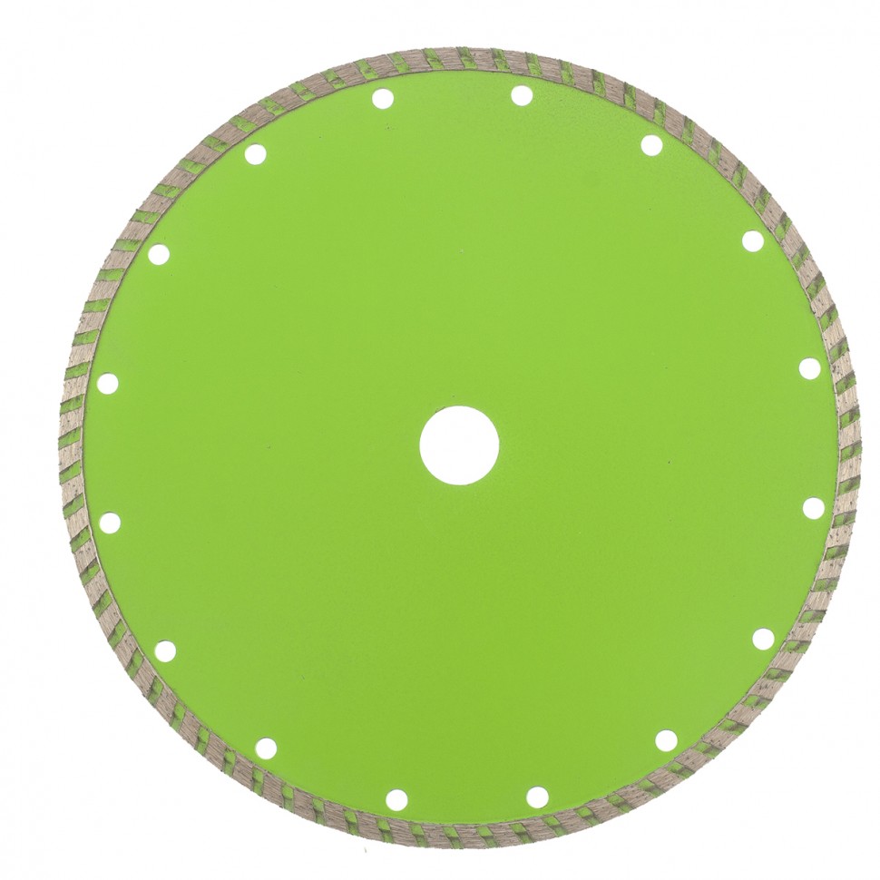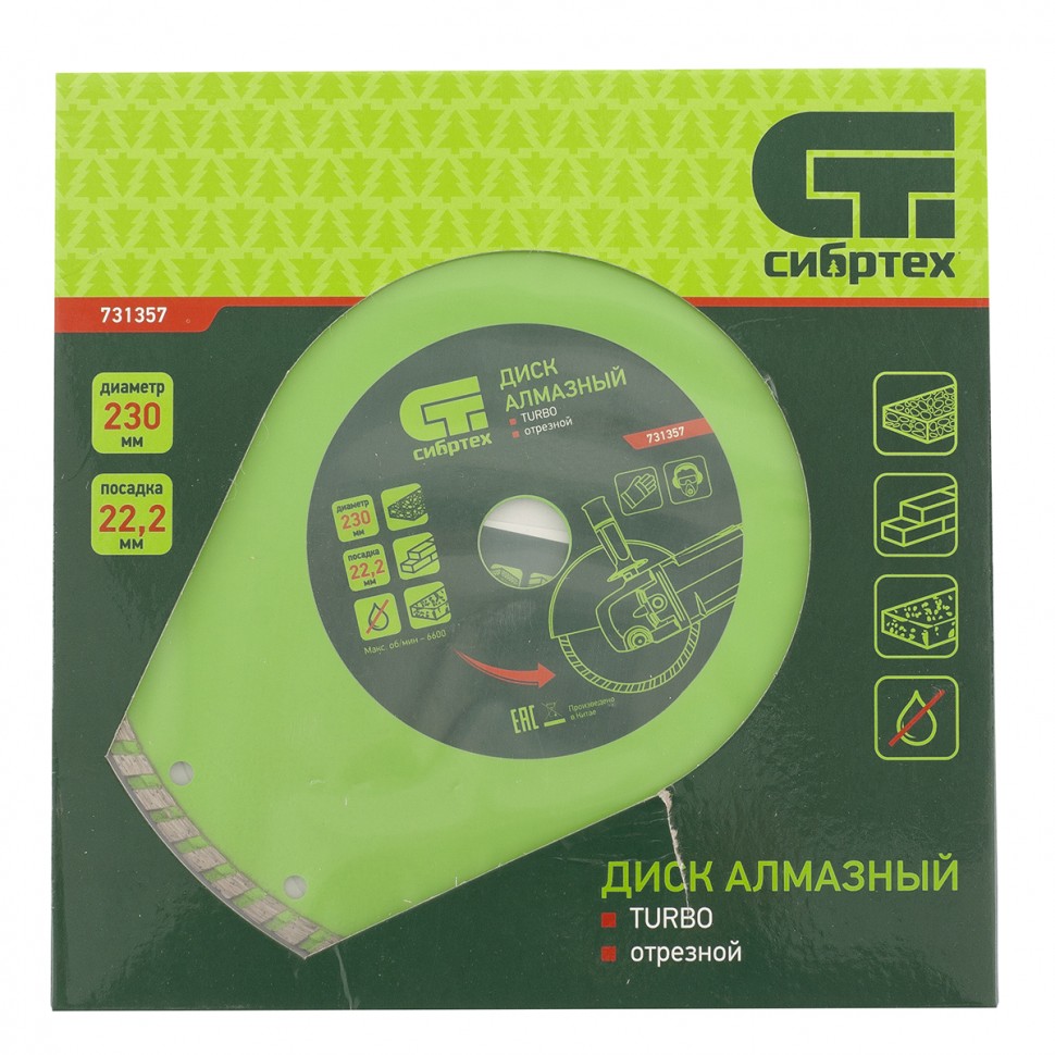 Алмазный отрезной диск Сибртех Turbo 731357 для сухой резки, 230 х 22,2 мм, устанавливается на углошлифовальные машинки и предназначен для использования в быту. Он позволяет резать твердые материалы - бетон, железобетон, камень, песчаник.ПреимуществаТурбированная рабочая часть с перфорацией эффективно отводит тепло и шлам, поэтому диск можно использовать для быстрой сухой резки без водяного охлаждения.Диск изготовлен методом холодного прессования, за счет чего успешно противостоит высоким нагрузкам.Алмазный слой шириной 7 мм обеспечивает хорошее качество реза.