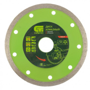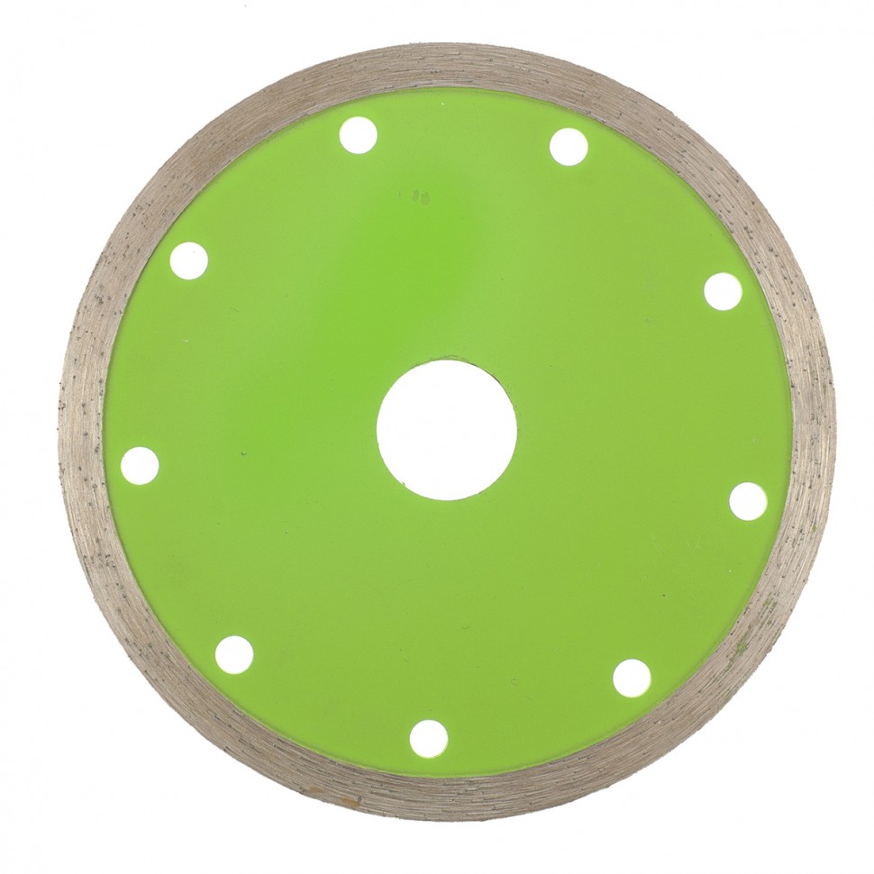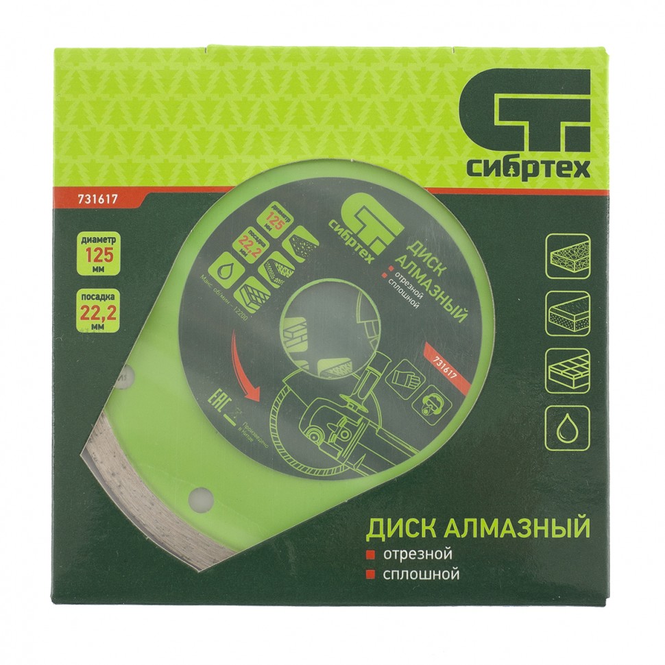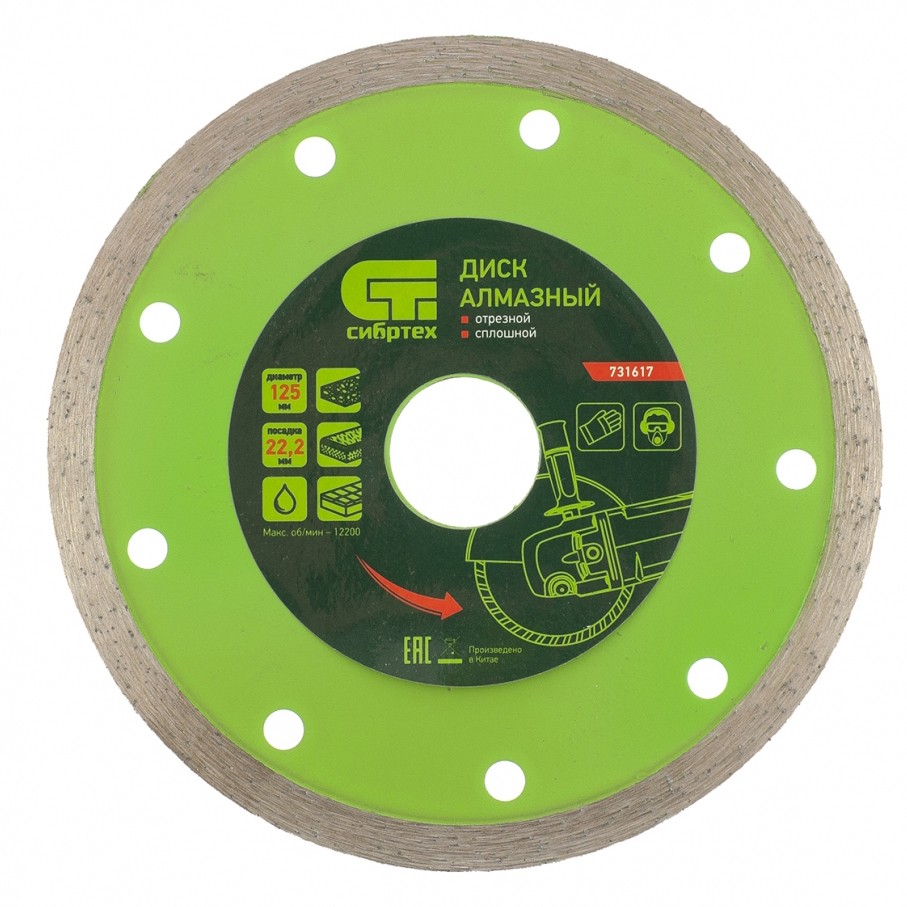 Диск алмазный отрезной сплошной Сибртех 731617, 125 х 22,2 мм, применяется для мокрой резки керамогранитной, керамической плитки, а также мрамора и камня. Он используется в качестве оснастки для болгарок и плиткорезов с посадочным диаметром 22,2 мм. рез материалов необходимо проводить с водяным охлаждением. Диск обладает хорошим рабочим ресурсом и рассчитан на долгую службу.ПреимуществаСплошная режущая часть обеспечивает ровный и чистый срез без сколов.Высококачественные алмазы надежно удерживаются металлической связкой, поэтому производительность диска остается неизменной.Ширина рабочей части 6 мм позволяет успешно использовать диск в быту.Перфорация обеспечивает более качественное охлаждение диска и стабильность реза.Основание диска выполнено из стали 65MnE, а потому выдерживает резку твердых материалов без риска деформации.