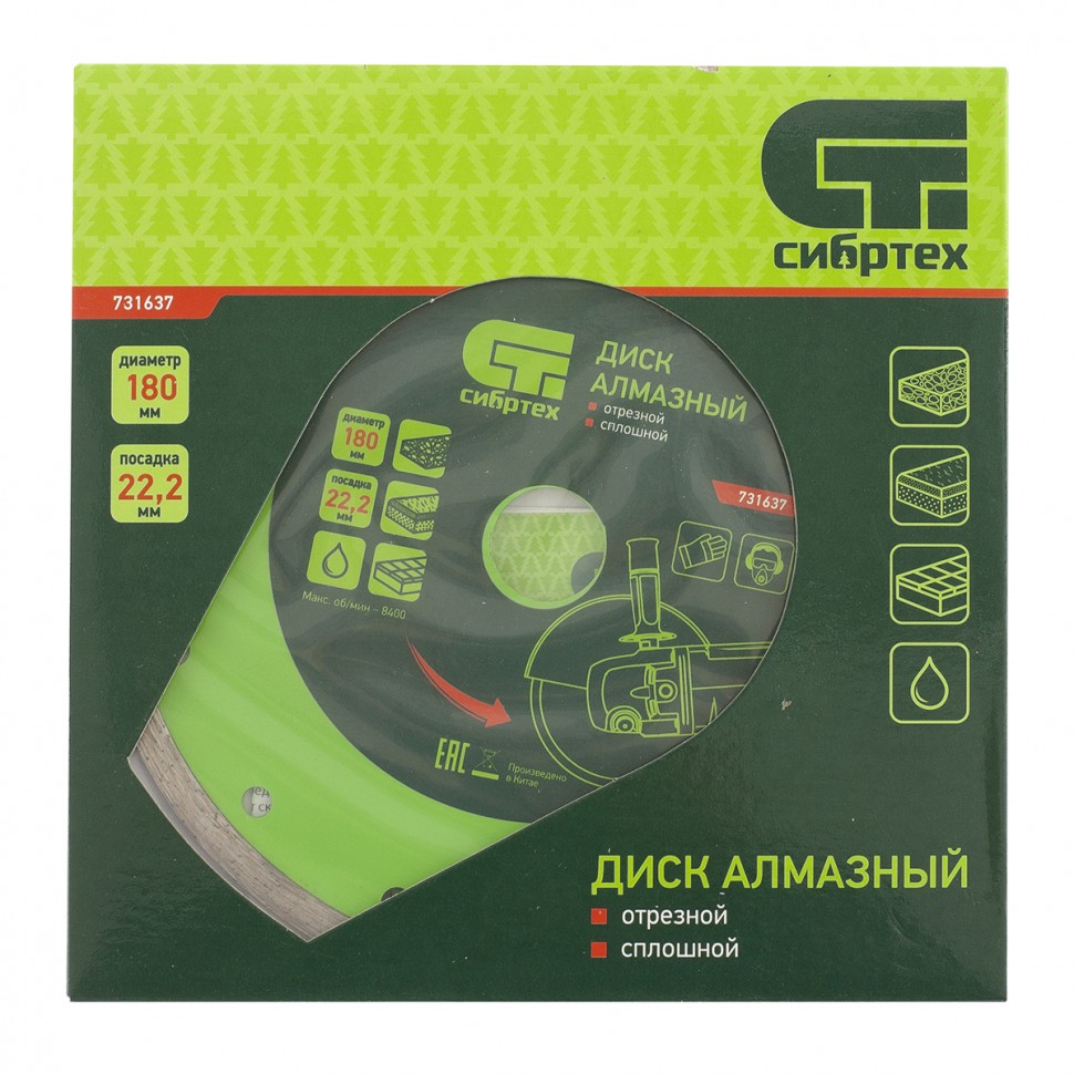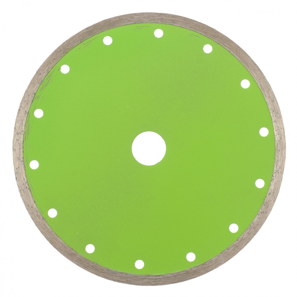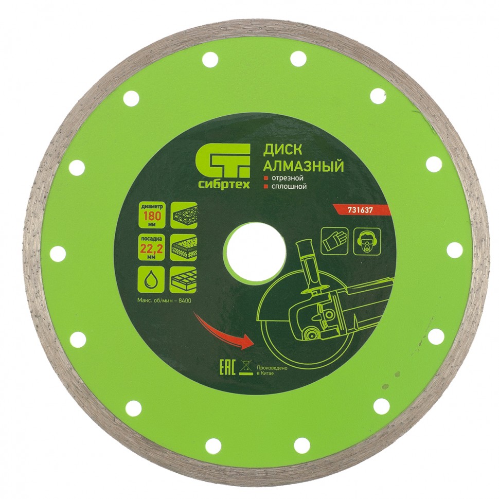 Диск алмазный отрезной сплошной Сибртех 731637, 180 х 22,2 мм, применяется для мокрой резки керамогранитной, керамической плитки, а также мрамора и камня. Он используется в качестве оснастки для болгарок и плиткорезов с посадочным диаметром 22,2 мм. рез материалов необходимо проводить с водяным охлаждением. Диск обладает хорошим рабочим ресурсом и рассчитан на долгую службу.ПреимуществаСплошная режущая часть обеспечивает ровный и чистый срез без сколов.Высококачественные алмазы надежно удерживаются металлической связкой, поэтому производительность диска остается неизменной.Ширина рабочей части 6 мм позволяет успешно использовать диск в быту.Перфорация обеспечивает более качественное охлаждение диска и стабильность реза.Основание диска выполнено из стали 65MnE, а потому выдерживает резку твердых материалов без риска деформации.