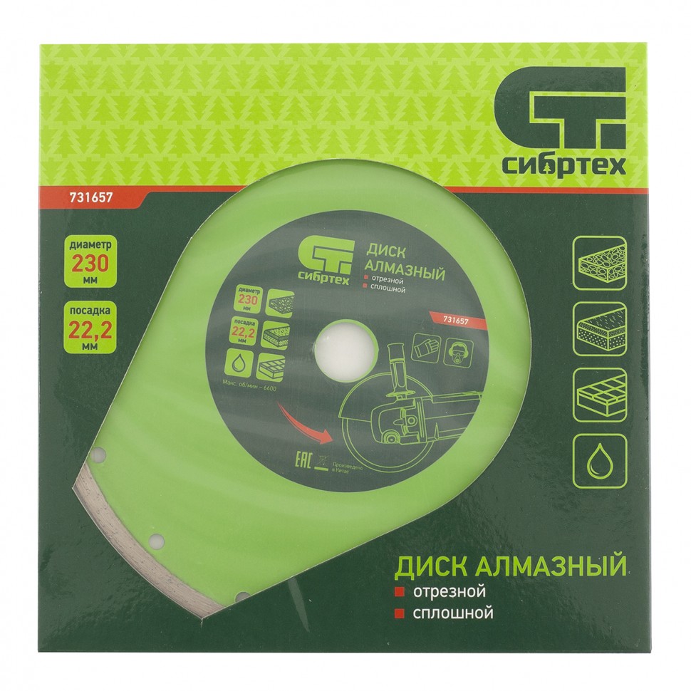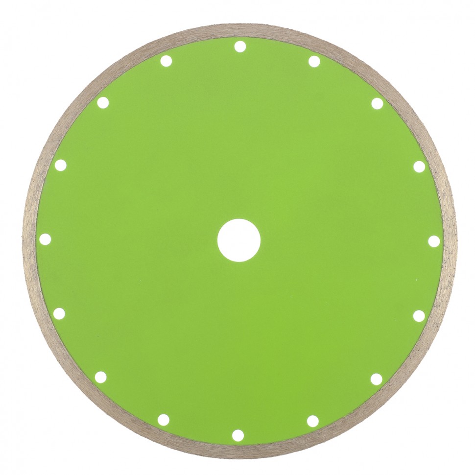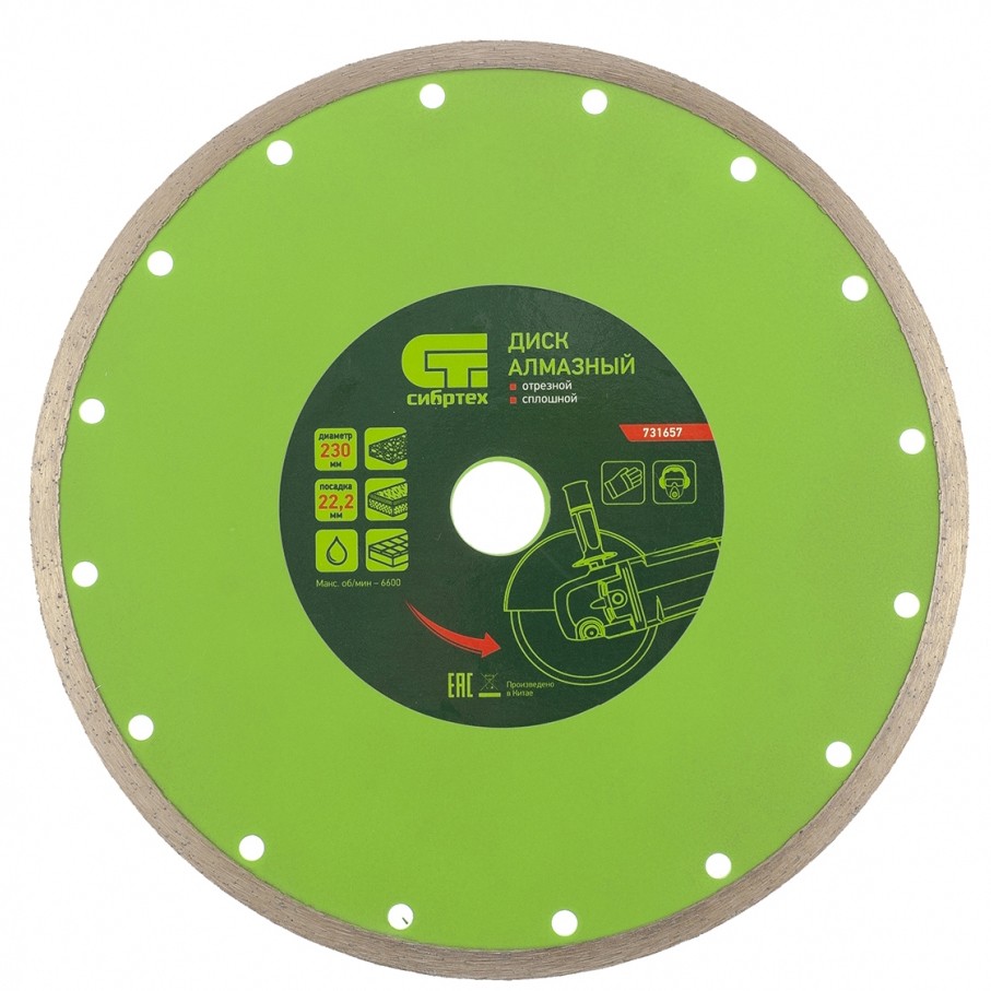 Диск алмазный отрезной сплошной Сибртех 731657, 230 х 22,2 мм, применяется для мокрой резки керамогранитной, керамической плитки, а также мрамора и камня. Он используется в качестве оснастки для болгарок и плиткорезов с посадочным диаметром 22,2 мм. рез материалов необходимо проводить с водяным охлаждением. Диск обладает хорошим рабочим ресурсом и рассчитан на долгую службу.ПреимуществаСплошная режущая часть обеспечивает ровный и чистый срез без сколов.Высококачественные алмазы надежно удерживаются металлической связкой, поэтому производительность диска остается неизменной.Ширина рабочей части 6 мм позволяет успешно использовать диск в быту.Перфорация обеспечивает более качественное охлаждение диска и стабильность реза.Основание диска выполнено из стали 65MnE, а потому выдерживает резку твердых материалов без риска деформации.
