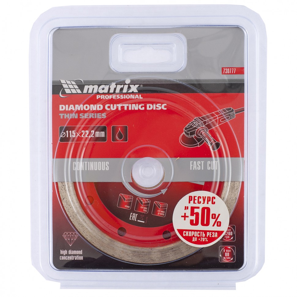Отрезной сплошной алмазный диск Matrix ф115х22,2 мм 730777, тонкий, обеспечивает мокрое резание плотных материалов: керамогранита, керамической и кафельной плитки, мрамора, натурального и искусственного камня. Он устанавливается на УШМ или плиткорезы и используется с применением водяного охлаждения. Диск увеличивает производительность на 20% благодаря небольшой толщине 1,4 мм и снижению нагрузки на инструмент.ПреимуществаСплошная форма и перфорированный корпус позволяют добиться высокого качества реза и предотвращают появление сколов.Режущая часть шириной 10 мм с высокой концентрацией алмазов способствуют увеличению рабочего ресурса диска на 50%.Высокий ресурс и износостойкость рабочей части достигается за счет металлической связки.Метод ускоренного горячего прессования улучшает сопротивление режущей части нагрузкам и делает мокрое резание более качественным.Диск может использоваться в бытовых целях и профессионально.