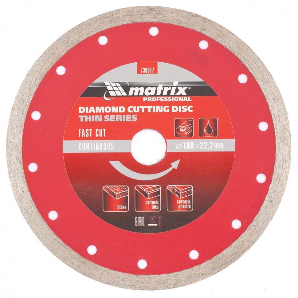 Отрезной сплошной алмазный диск Matrix ф180х22,2 мм 730817, тонкий, обеспечивает мокрое резание плотных материалов: керамогранита, керамической и кафельной плитки, мрамора, натурального и искусственного камня. Он устанавливается на УШМ или плиткорезы и используется с применением водяного охлаждения. Диск увеличивает производительность на 20% благодаря небольшой толщине 2 мм и снижению нагрузки на инструмент.ПреимуществаСплошная форма и перфорированный корпус позволяют добиться высокого качества реза и предотвращают появление сколов.Режущая часть шириной 10 мм с высокой концентрацией алмазов способствуют увеличению рабочего ресурса диска на 50%.Высокий ресурс и износостойкость рабочей части достигается за счет металлической связки.Метод ускоренного горячего прессования улучшает сопротивление режущей части нагрузкам и делает мокрое резание более качественным.Диск может использоваться в бытовых целях и профессионально.