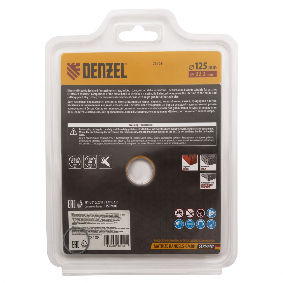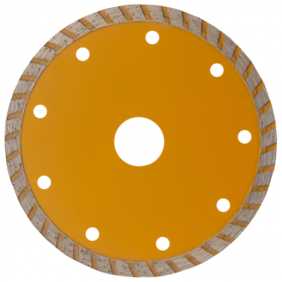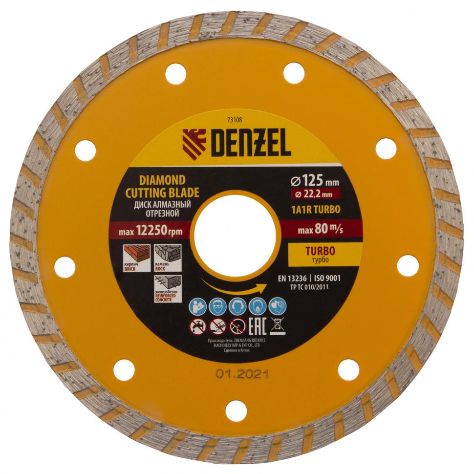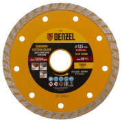 Отрезной алмазный диск Denzel Турбо ф125 х 22,2 мм 73108 рассчитан на сухое резание камня, кирпича, свежего и затвердевшего бетона, железобетона. Он используется в качестве оснастки на УШМ с посадочным отверстием 22,2 мм при проведении бытовых и профессиональных отрезных работ. Турбо диск режет снижает ударную нагрузку при резании материалов и не требует водяного охлаждения.ПреимуществаКачественная металлическая связка обеспечивает эффективность работы с плотными материалами, т.к. устойчивая к высоким температурам.Режущий слой шириной 7 мм с высокой концентрацией алмазов позволяет увеличить скорость реза и износостойкость диска.Диск изготовлен по технологии холодного прессования, поэтому отличается хорошими режущими свойствами.