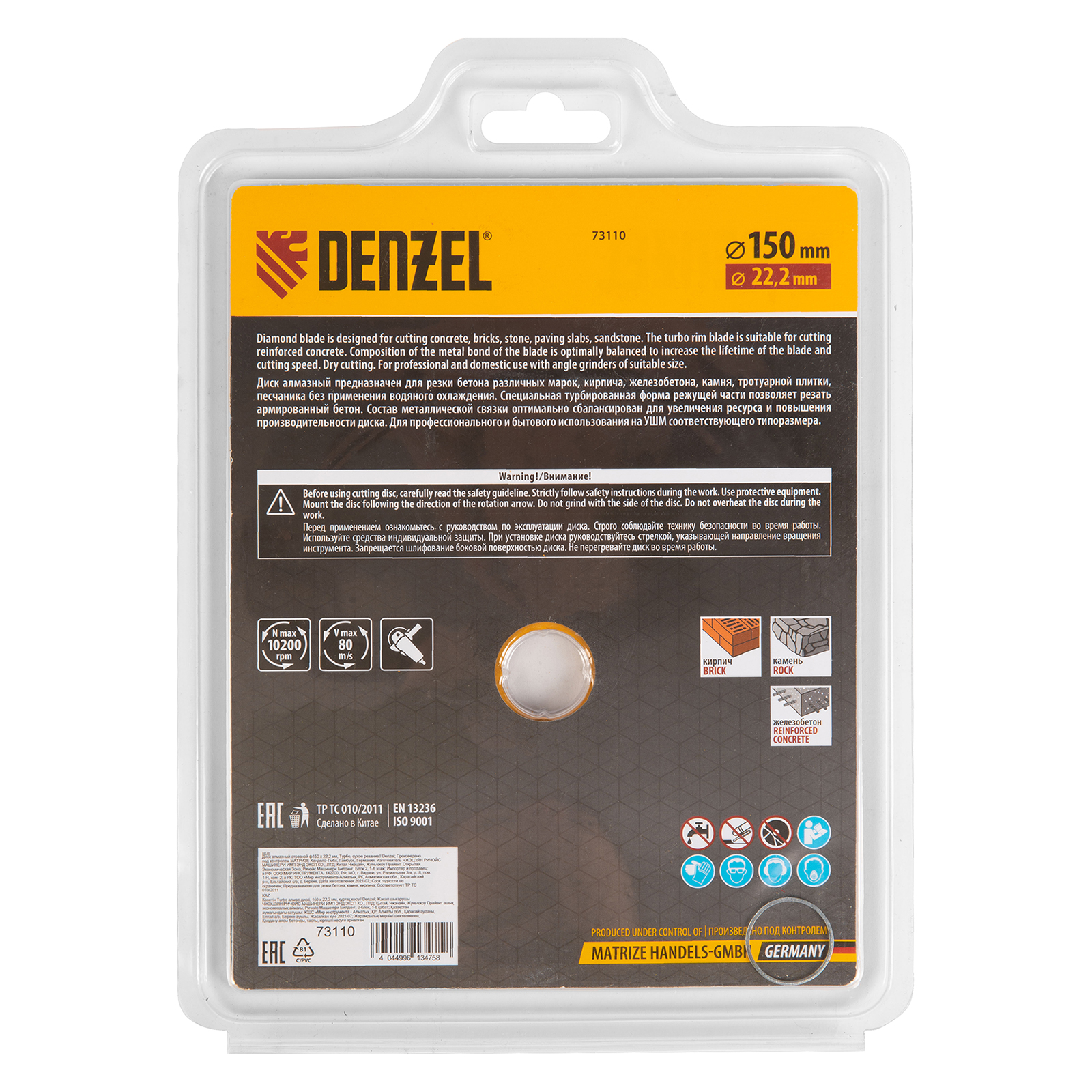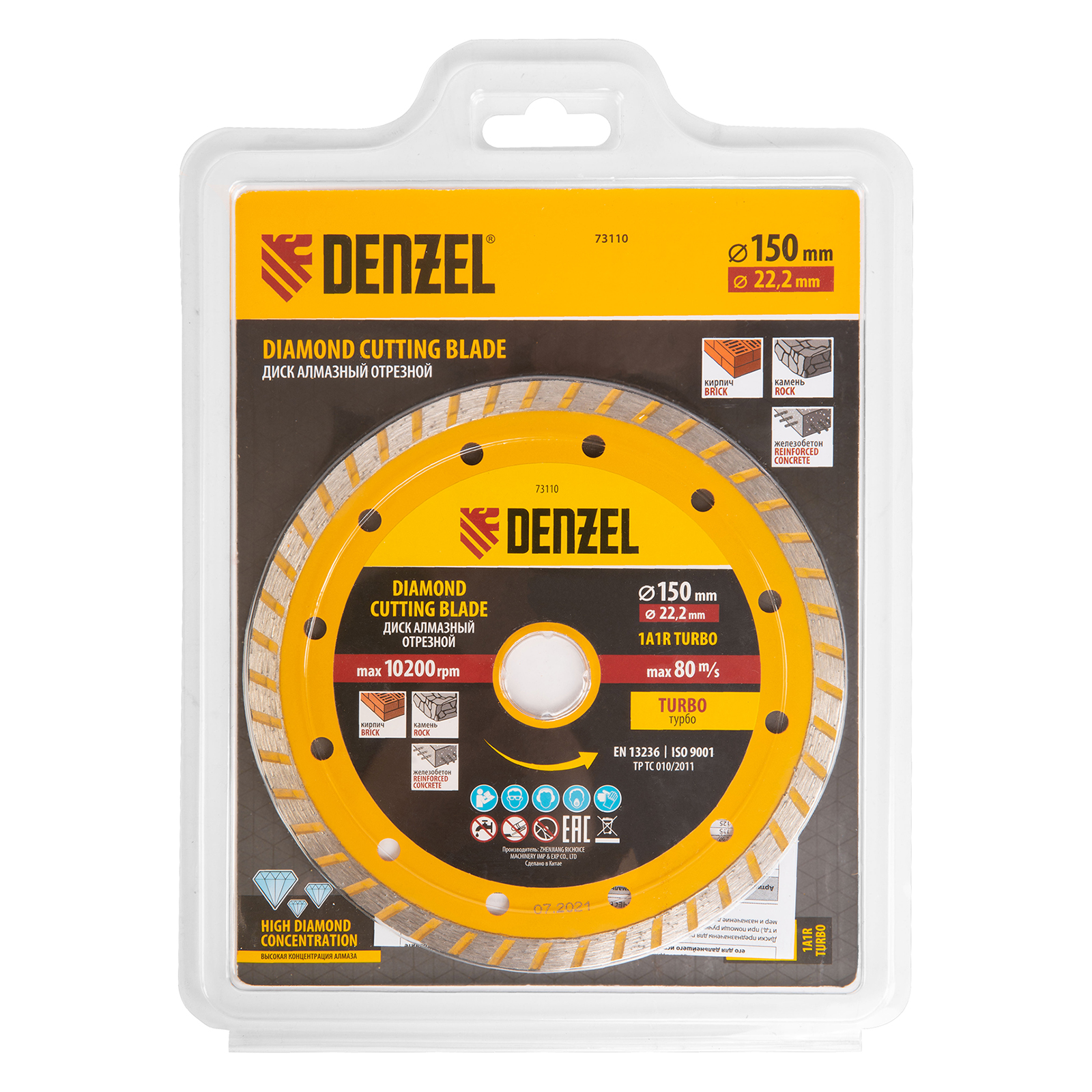 Отрезной алмазный диск Denzel Турбо ф150 х 22,2 мм 73110 рассчитан на сухое резание камня, кирпича, свежего и затвердевшего бетона, железобетона. Он используется в качестве оснастки на УШМ с посадочным отверстием 22,2 мм при проведении бытовых и профессиональных отрезных работ. Турбо диск режет снижает ударную нагрузку при резании материалов и не требует водяного охлаждения.ПреимуществаКачественная металлическая связка обеспечивает эффективность работы с плотными материалами, т.к. устойчивая к высоким температурам.Режущий слой шириной 7 мм с высокой концентрацией алмазов позволяет увеличить скорость реза и износостойкость диска.Диск изготовлен по технологии холодного прессования, поэтому отличается хорошими режущими свойствами.