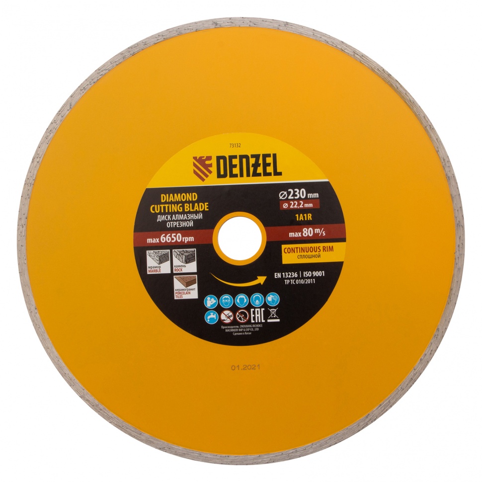 Отрезной алмазный диск Denzel Сплошной 73132, ф230 х 22,2 мм, используется для мокрого резания совместно с углошлифовальными машинами или плиткорезами с посадочным диаметром 22,2 мм. С его помощью режут камень, мрамор, керамогранитную и керамическую плитку. Диск отличается хорошей производительностью за счет высокой скорости реза, поэтому подходит для профессионального применения.ПреимуществаСплошная конструкция обеспечивает эффективное выполнение большого объема работ даже при резании хрупких материалов.Режущая кромка шириной 7 мм позволяет получить аккуратный срез без зазубрин и сколов.Диск обладает высоким рабочим ресурсом благодаря увеличенной концентрации алмазов в рабочем слое.Отрезной диск изготовлен способом холодного прессования.