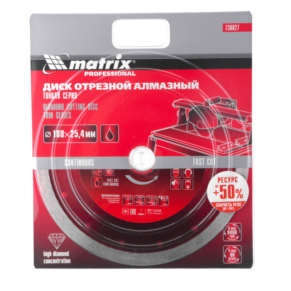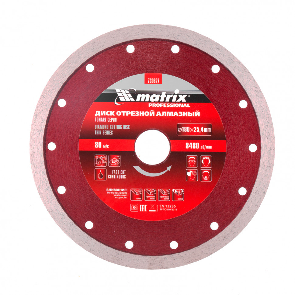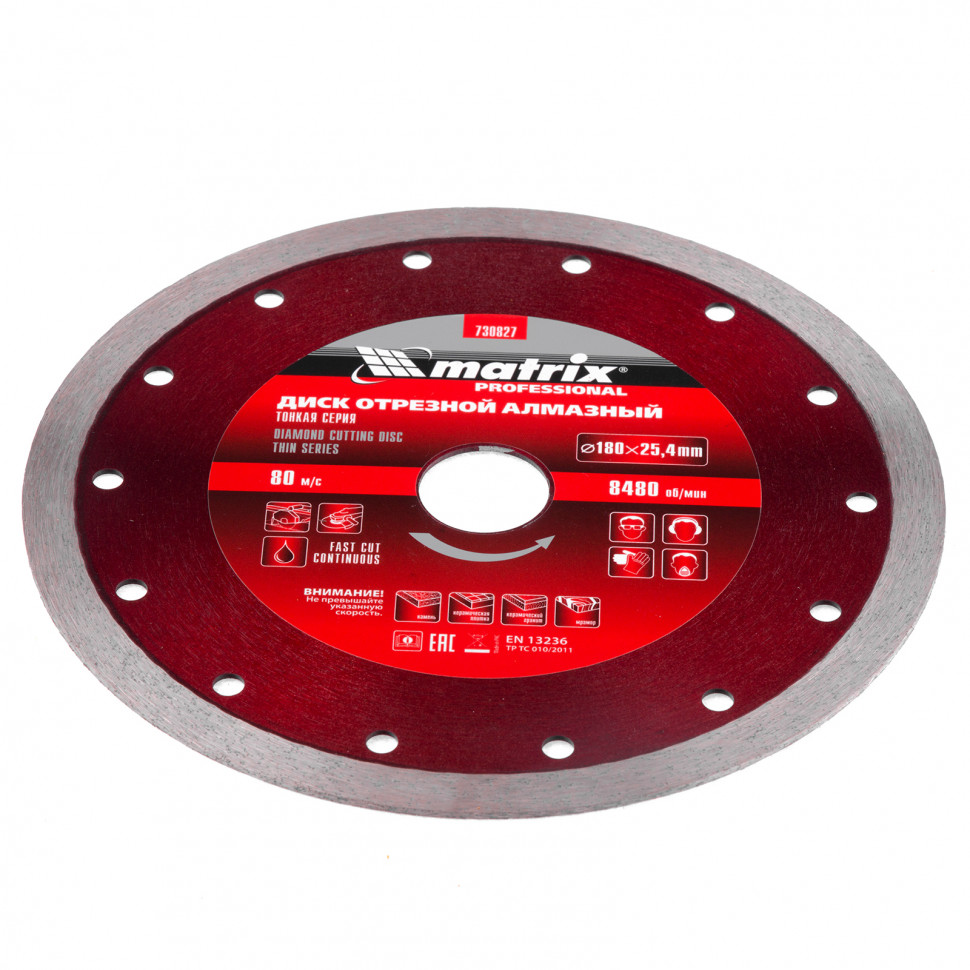 Отрезной сплошной алмазный диск Matrix ф180х25,4 мм 730827, тонкий, обеспечивает мокрое резание плотных материалов: керамогранита, керамической и кафельной плитки, мрамора, натурального и искусственного камня. Он устанавливается на УШМ или плиткорезы и используется с применением водяного охлаждения. Диск увеличивает производительность на 20% благодаря небольшой толщине 2 мм и снижению нагрузки на инструмент.ПреимуществаСплошная форма и перфорированный корпус позволяют добиться высокого качества реза и предотвращают появление сколов.Режущая часть шириной 10 мм с высокой концентрацией алмазов способствуют увеличению рабочего ресурса диска на 50%.Высокий ресурс и износостойкость рабочей части достигается за счет металлической связки.Метод ускоренного горячего прессования улучшает сопротивление режущей части нагрузкам и делает мокрое резание более качественным.Диск может использоваться в бытовых целях и профессионально.