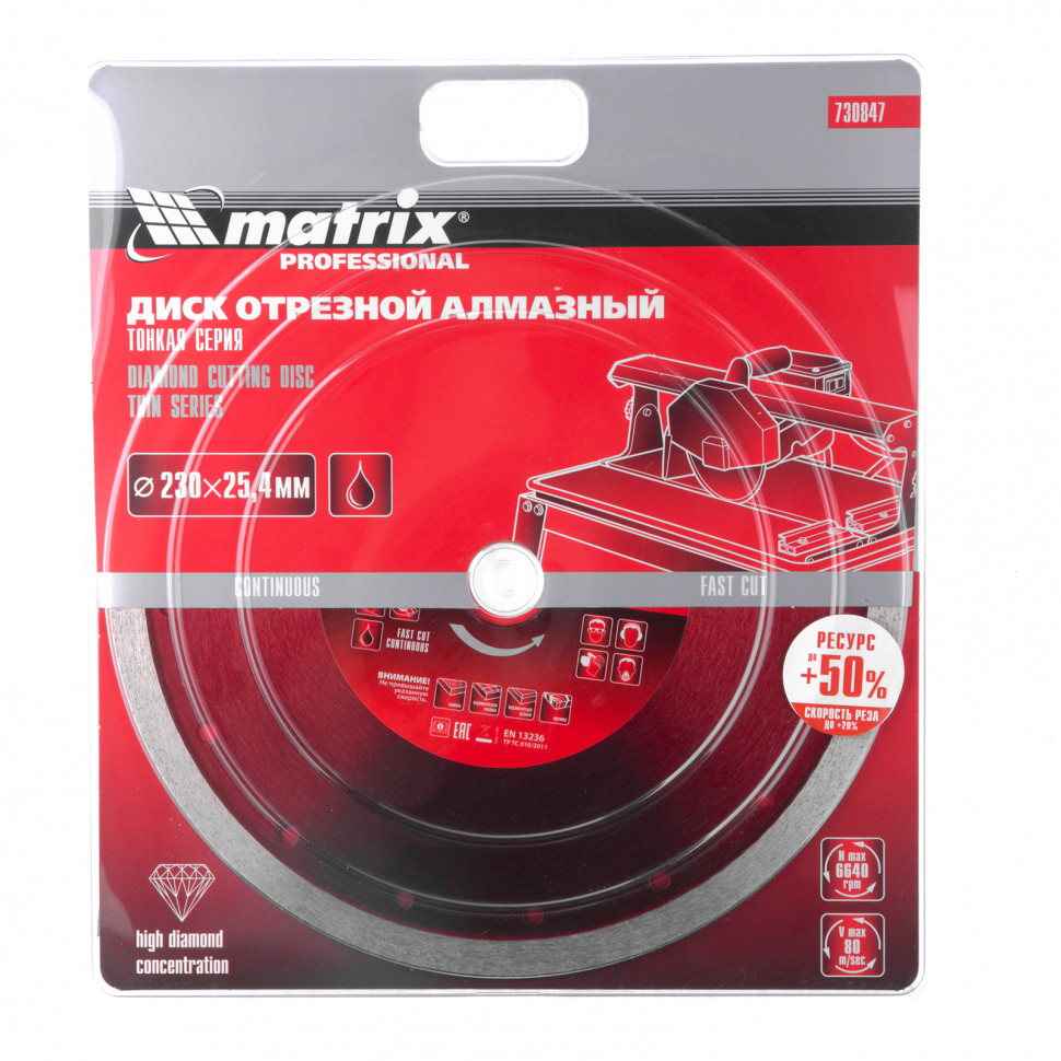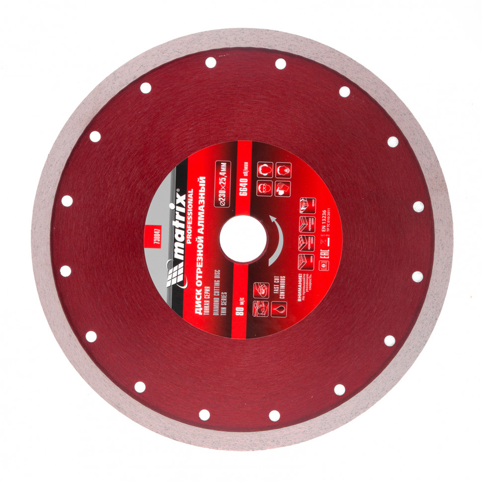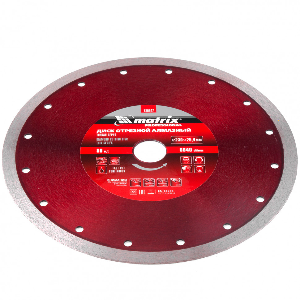 Тонкий сплошной алмазный диск Matrix 230 х 25,4 мм 730847 обеспечивает мокрое резание плотных материалов: керамогранита, керамической и кафельной плитки, мрамора, натурального и искусственного камня. Он устанавливается на УШМ или плиткорезы и используется с применением водяного охлаждения. Диск увеличивает производительность на 20% благодаря небольшой толщине 2,1 мм и снижению нагрузки на инструмент.ПреимуществаСплошная форма и перфорированный корпус позволяют добиться высокого качества реза и предотвращают появление сколов.Режущая часть шириной 10 мм с высокой концентрацией алмазов способствуют увеличению рабочего ресурса диска на 50%.Высокий ресурс и износостойкость рабочей части достигается за счет металлической связки.Метод ускоренного горячего прессования улучшает сопротивление режущей части нагрузкам и делает мокрое резание более качественным.Диск может использоваться в бытовых целях и профессионально.