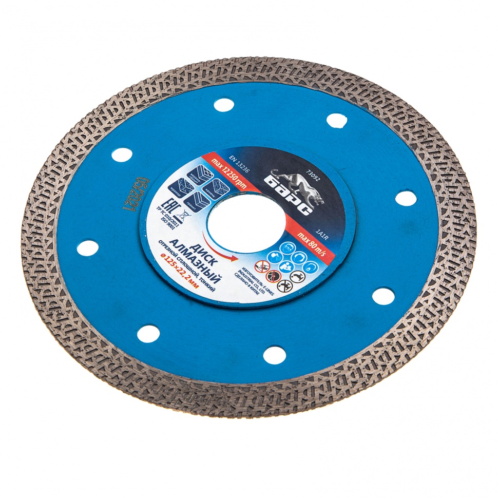 Тонкий сплошной алмазный диск Барс ф125х22,2 мм 73092 с особой формой рабочей части применяется как для сухого, так и мокрого резания гранита и керамогранита, плитки, кафеля, мрамора, искусственного и натурального камня с помощью УШМ или плиткореза. Уменьшенная толщина диска позволяет снизить нагрузку на рабочий инструмент при резке керамогранита и других твердых материалов. Диск предназначен для профессиональной эксплуатации. Использование водяного охлаждения увеличивает ресурс диска и снижает вероятность получения сколов.ПреимуществаСплошная конструкция с перфорацией гарантирует быстрый качественный рез без сколов.В состав специально подобранной под тип диска связки включены тугоплавкие соединения металлов, поэтому диск выдерживает даже высокие температуры.Режущая кромка шириной 10 мм с высокой концентрацией алмазов повышает скорость и производительность работы.Зона рядом с посадочным отверстием дополнена специальными накладками, что увеличивает прочность всей конструкции.Сетчатый орнамент позволяет снизить трение при работе, таким образом диск охлаждается быстрее.Диск отличается надежностью и обладает высоким ресурсом, т.к. изготовлен по технологии горячего прессования.