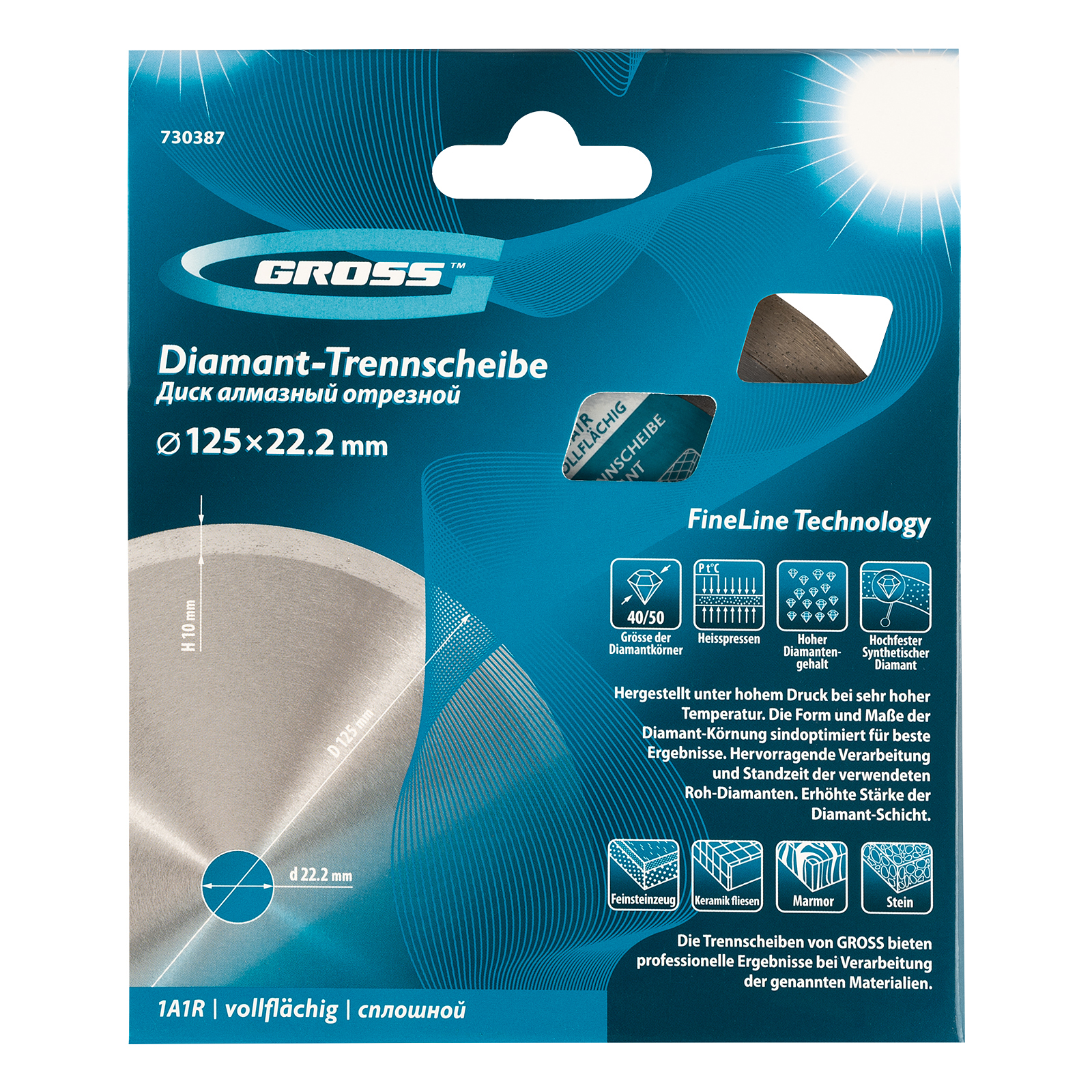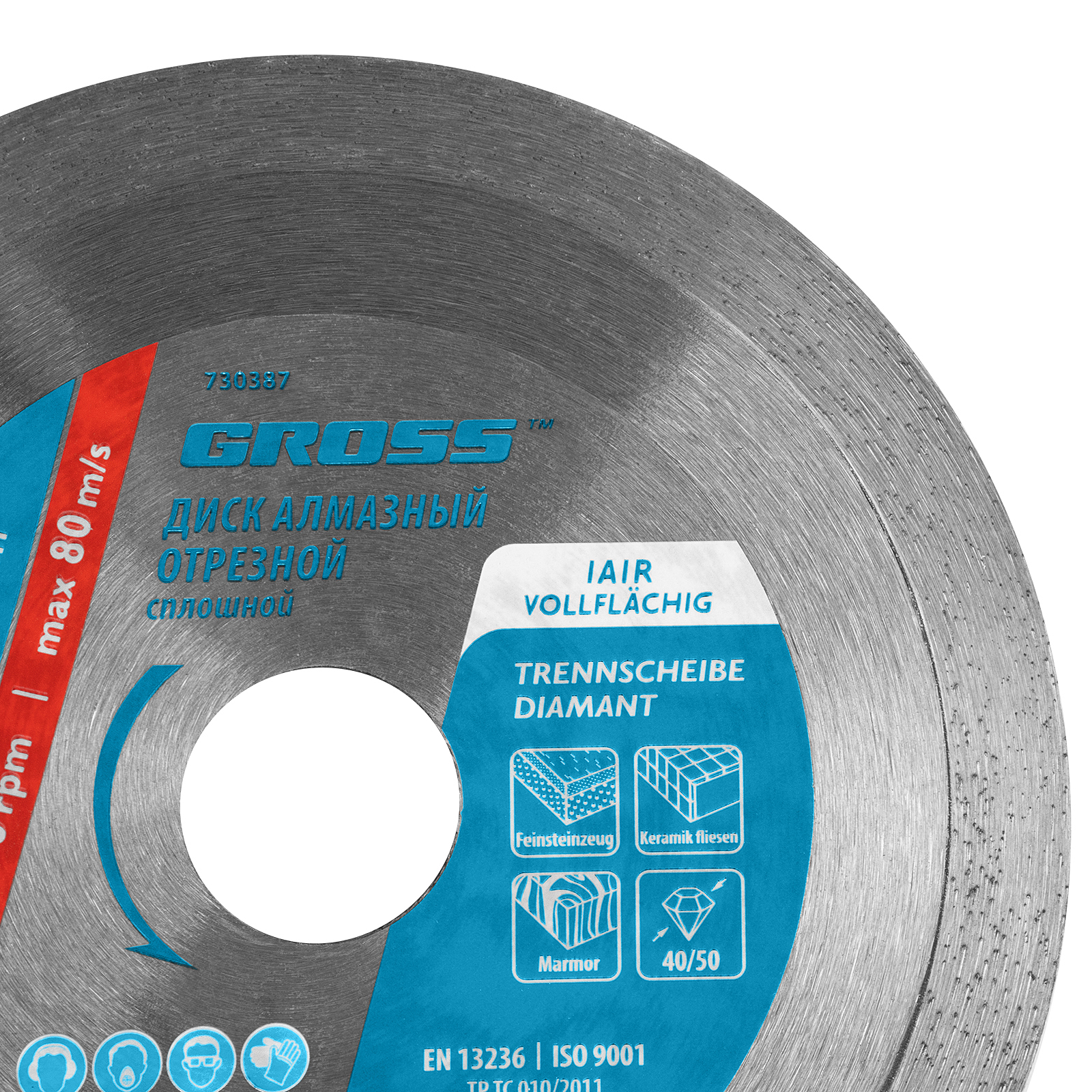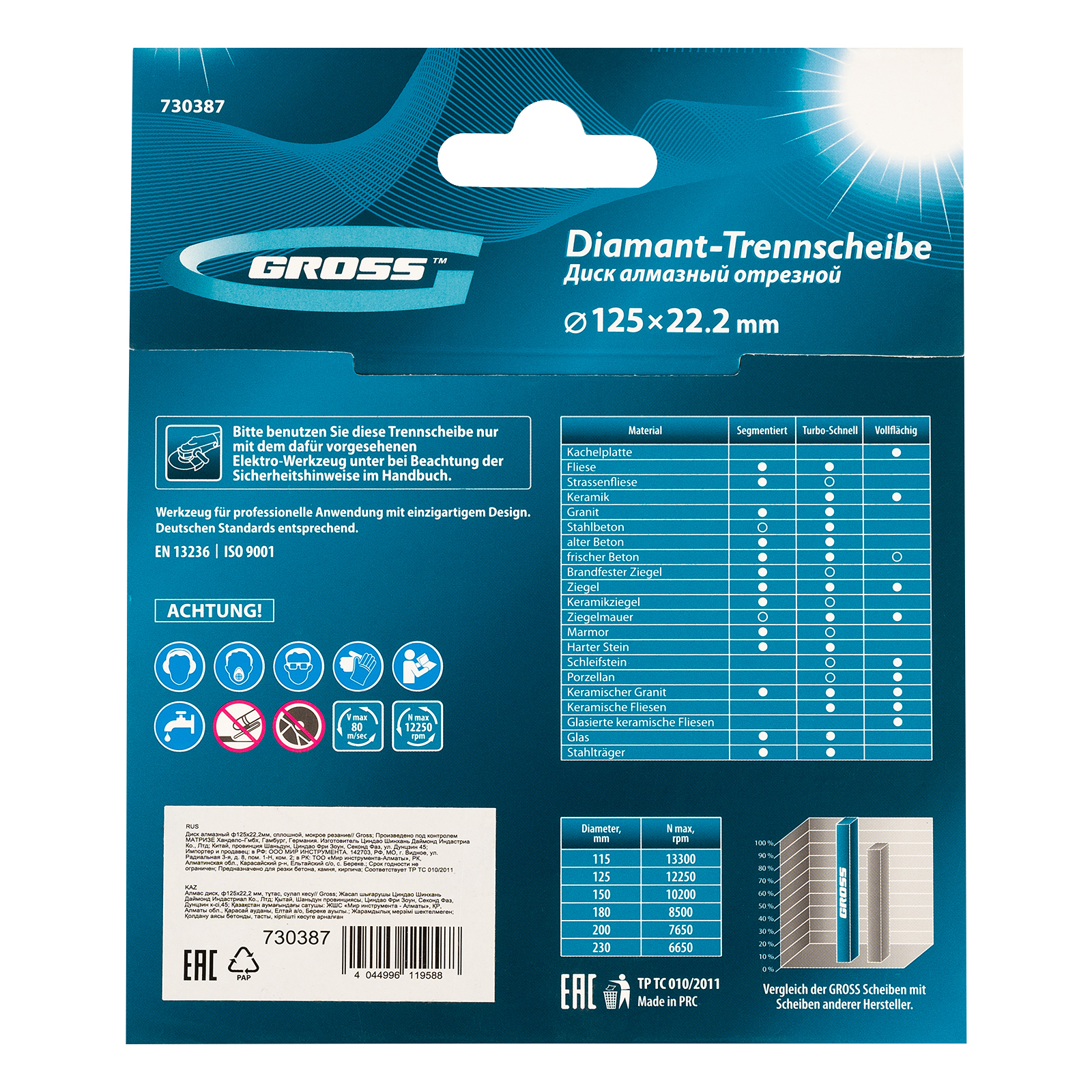 Сплошной алмазный диск Gross ф125х22,2 мм 730387 предназначен для мокрого резания гранита и керамогранита, плитки, мрамора и камня. Он подходит для эксплуатации с профессиональными УШМ или плиткорезами с посадочным диаметром 22,2 мм, рассчитан на большой объем работ. Сплошная конструкция не оставляет трещин на материалах, поэтому срез получается аккуратным и ровным. Алмазную резку рекомендуется проводить с водяным охлаждением диска для защиты от перегрева и качественного отвода пыли.ПреимуществаВысокая надежность - диск изготовлен методом горячего прессования.Эффективность и скорость резки - в качестве режущих сегментов используются крупные синтетические алмазы 40-50 мкм.Широкая рабочая часть 10 мм с высокой концентрацией алмазов - производительность остается на высоком уровне даже при быстром резе.Сопротивление перегреву и перегрузкам - металлическая связка изготовлена из качественных компонентов (кобальта, серебра и др.).Корпус из стали 65Mn с добавкой марганца - хорошие пружинные свойства предотвращают деформацию и поломку диска.Антикоррозионная защита - корпус покрыт бесцветным лаком.