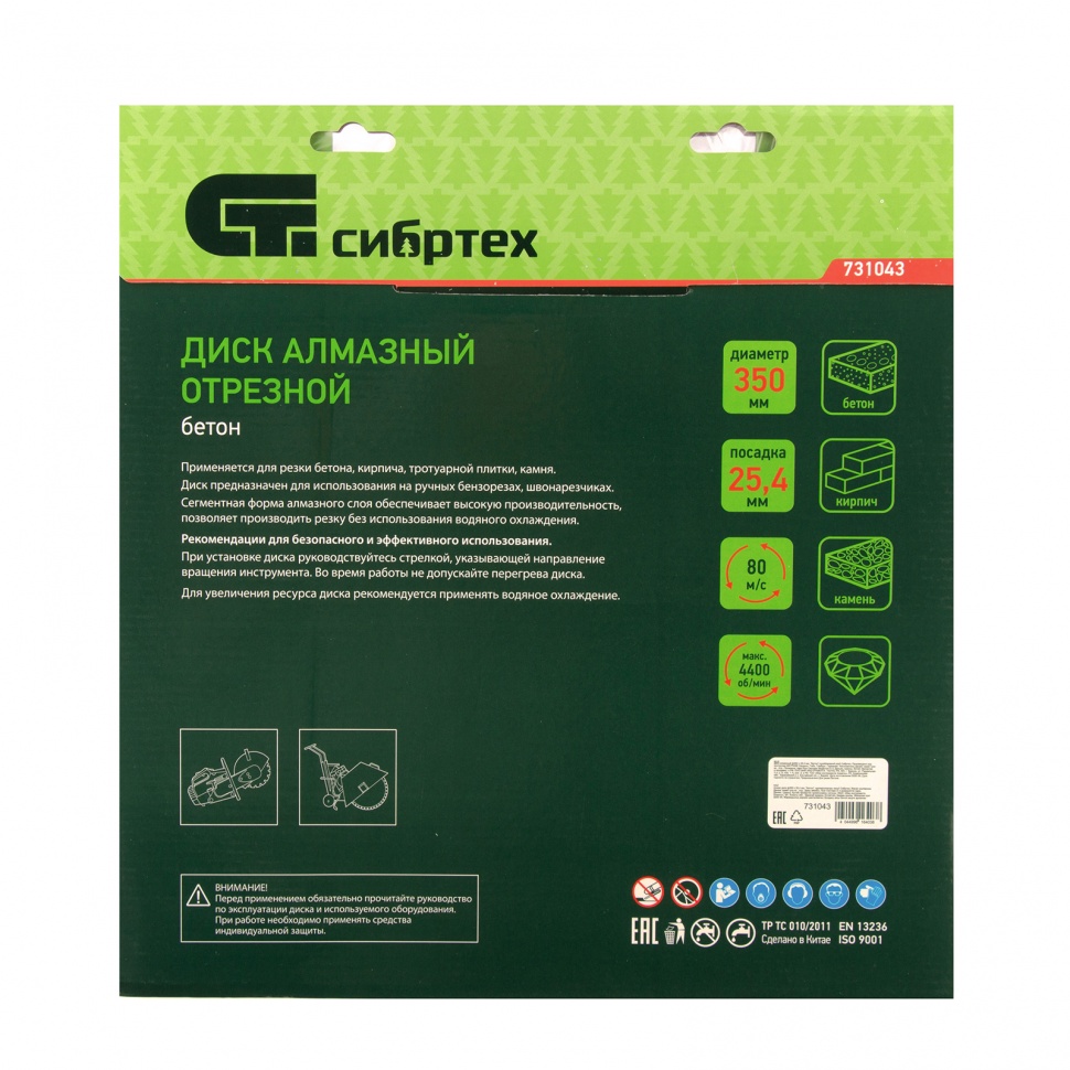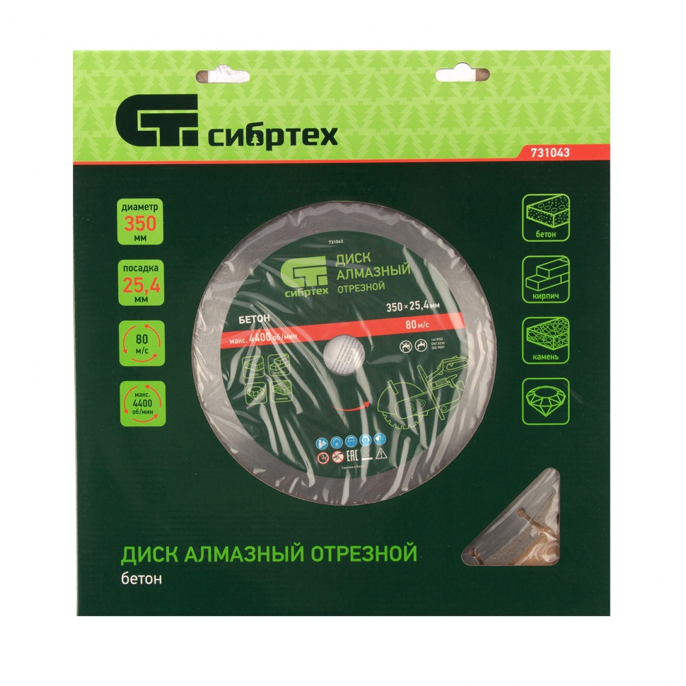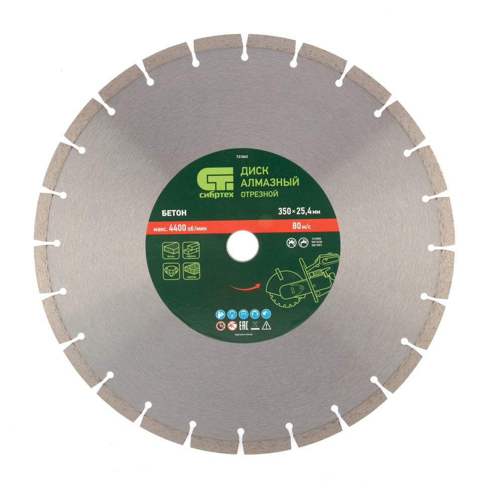 Диск алмазный Сибртех «Бетон» 731043, ф350 х 25,4 мм, сухой/мокрый рез, является расходным инструментом для ручных бензорезов и швонарезчиков. Используется при проведении работ по бетону, кирпичу, камню, тротуарной плитке и другим твердым материалам. Диск пригодится на стройплощадке или при проведении дорожного ремонта. Благодаря высокому рабочему ресурсу он подходит для интенсивного применения.ПреимуществаВысокая производительность - рабочая часть разделена на сегменты, что обеспечивает эффективное охлаждение и отвод шлама.Диск может использоваться как с водяным охлаждением, так и без него, что расширяет возможности его применения.Рабочая часть шириной 10 мм способствует ускорению работы без снижения качества реза.Алмазные сегменты закреплены методом пайки.