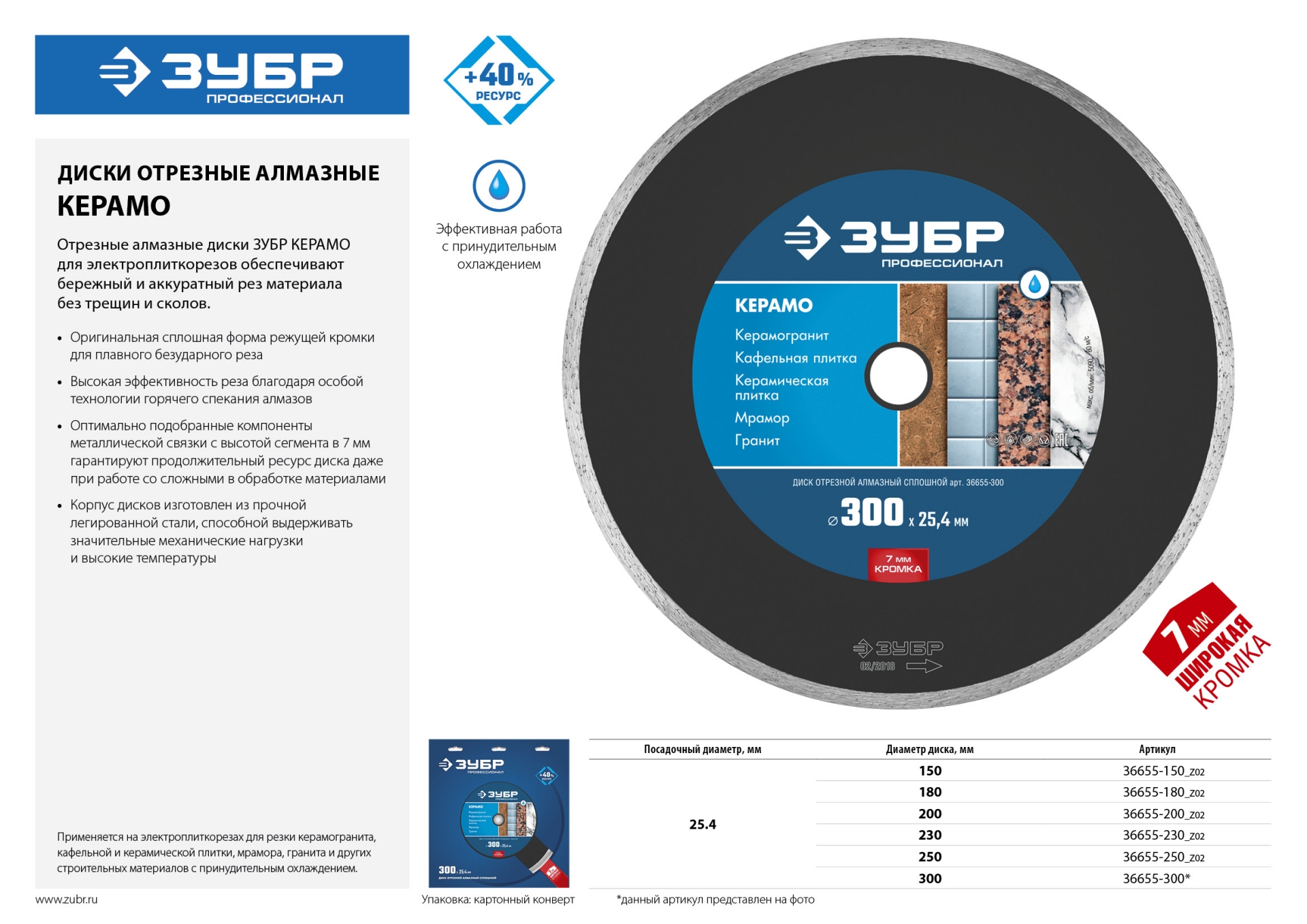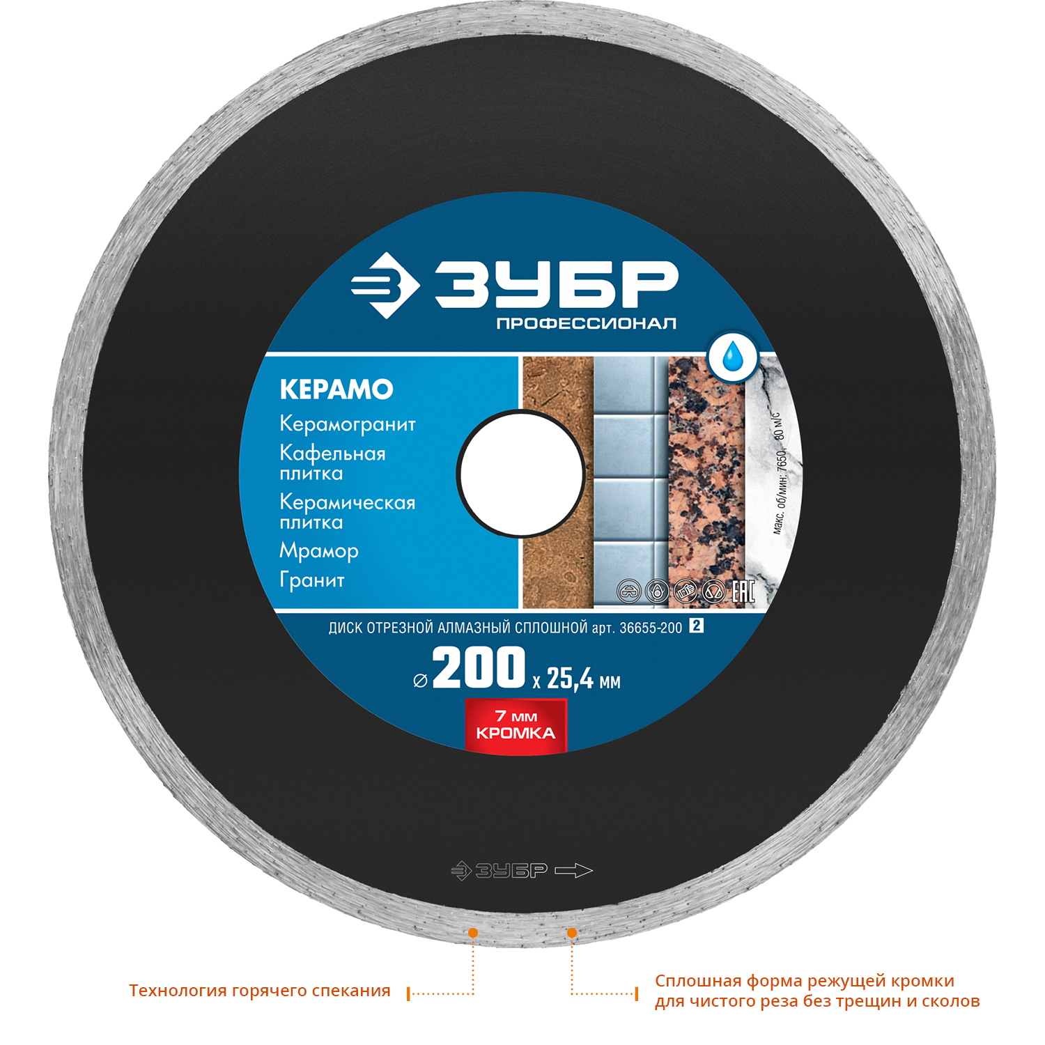 —ЗУБР Керамо-25, d 200 мм, (25.4 мм, 7 х 2.2 мм), сплошной алмазный диск, Профессионал (36655-200)