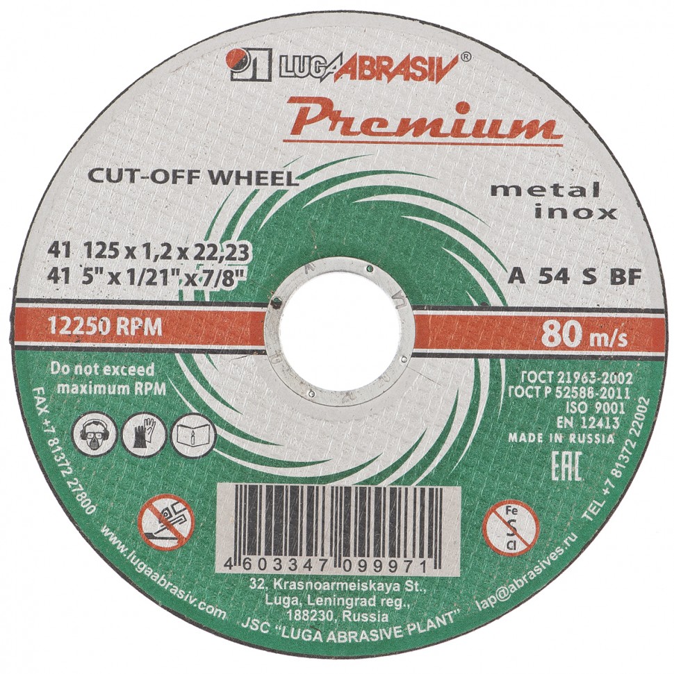Круг отрезной Луга Премиум 73713, 125 х 1,2 х 22,2 мм, предназначен для сухого реза по металлу и нержавеющей стали. Он устанавливается в качестве оснастки на УШМ с посадочным диаметром 22,2 мм. Круг подходит как для бытового, так и для профессионального использования при проведении строительных/ремонтных работ.ПреимуществаАбразивные зерна из твердого электрокорунда обеспечивает высокую режущую способность круга.2-слойная стеклосетка придает кругу прочность на разрыв и высокий рабочий ресурс.Твердая бакелитовая связка с упрочняющими элементами надежно удерживает крупицы абразива и обеспечивает их самозатачиваемость в процессе эксплуатации.