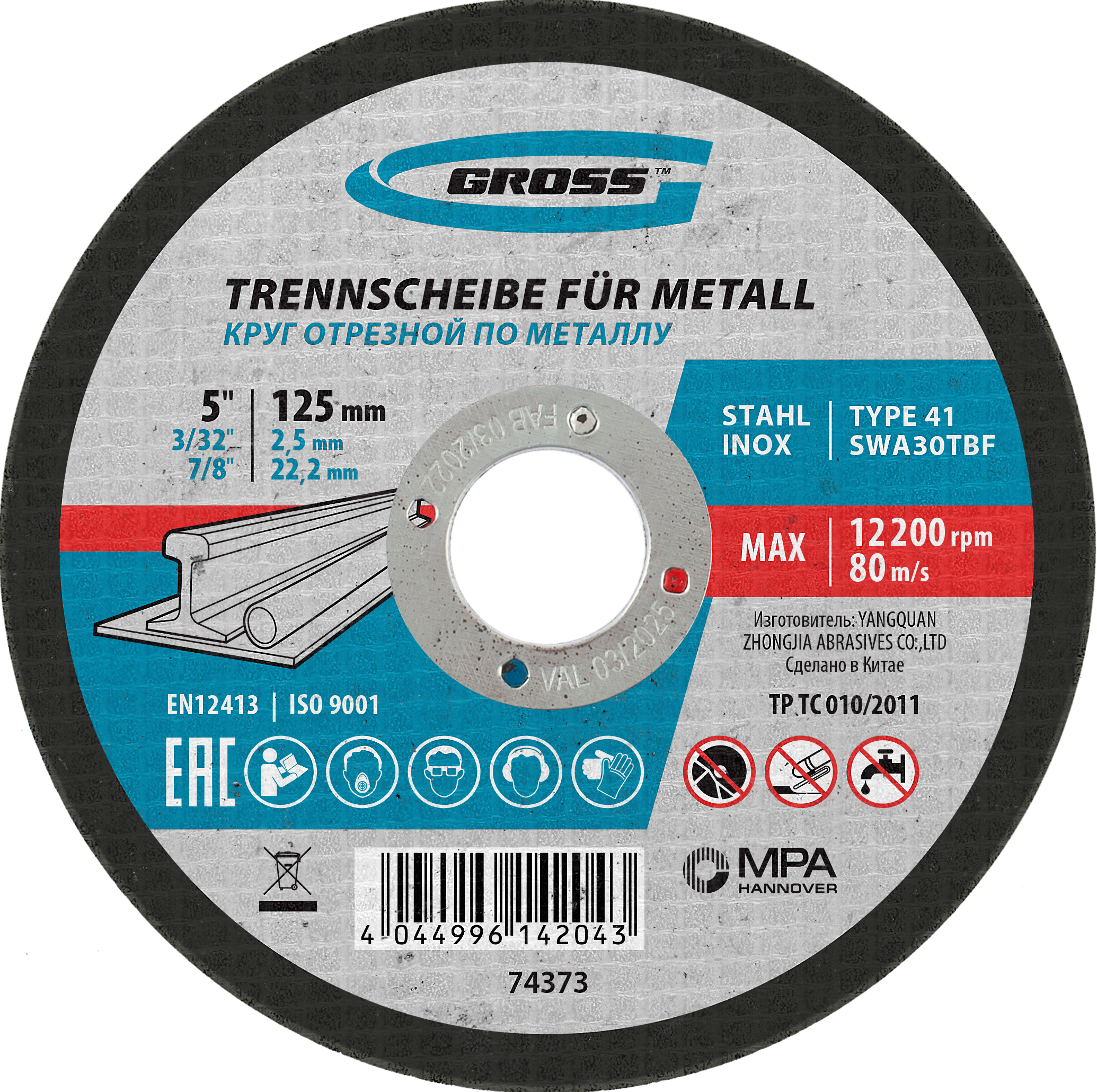 Отрезной круг по металлу Gross SWA30TBF 74373, 125 х 2,5 х 22,2 мм, рассчитан на интенсивный сухой рез нержавеющих легированных и углеродистых сталей. Устанавливается на УШМ соответствующего типоразмера. Надежный и производительный, круг подходит для профессиональной эксплуатации с высокими нагрузками.ПреимуществаАбразив из монокорунда с добавками - зерно обладает высокой твердостью и прочностью, подтачивается в процессе работы, поэтому эффективность реза не снижается.Очень высокий ресурс - в бакелитовую связку и абразив включены специальные добавки.Безопасность работы - высококачественная двухслойная стеклосетка защищает круг от перегрузок, предотвращая его разлет в случае зажатия в материале.Специальный состав - круг слабо нагревается в процессе реза, износ происходит медленно и равномерно, поэтому образуется минимальное количество пыли и искр.Толщина 2,5 мм и крупный абразив F30 - износостойкий круг легко выдерживает интенсивное использование.Плотная равномерная структура - круг прошел дополнительное тестирование на дисбаланс, это обеспечивает стабильность и точность работы.Проверенное качество - круг прошел контроль на всех этапах производства, что подтверждено ганноверским и российским сертификатами безопасности.