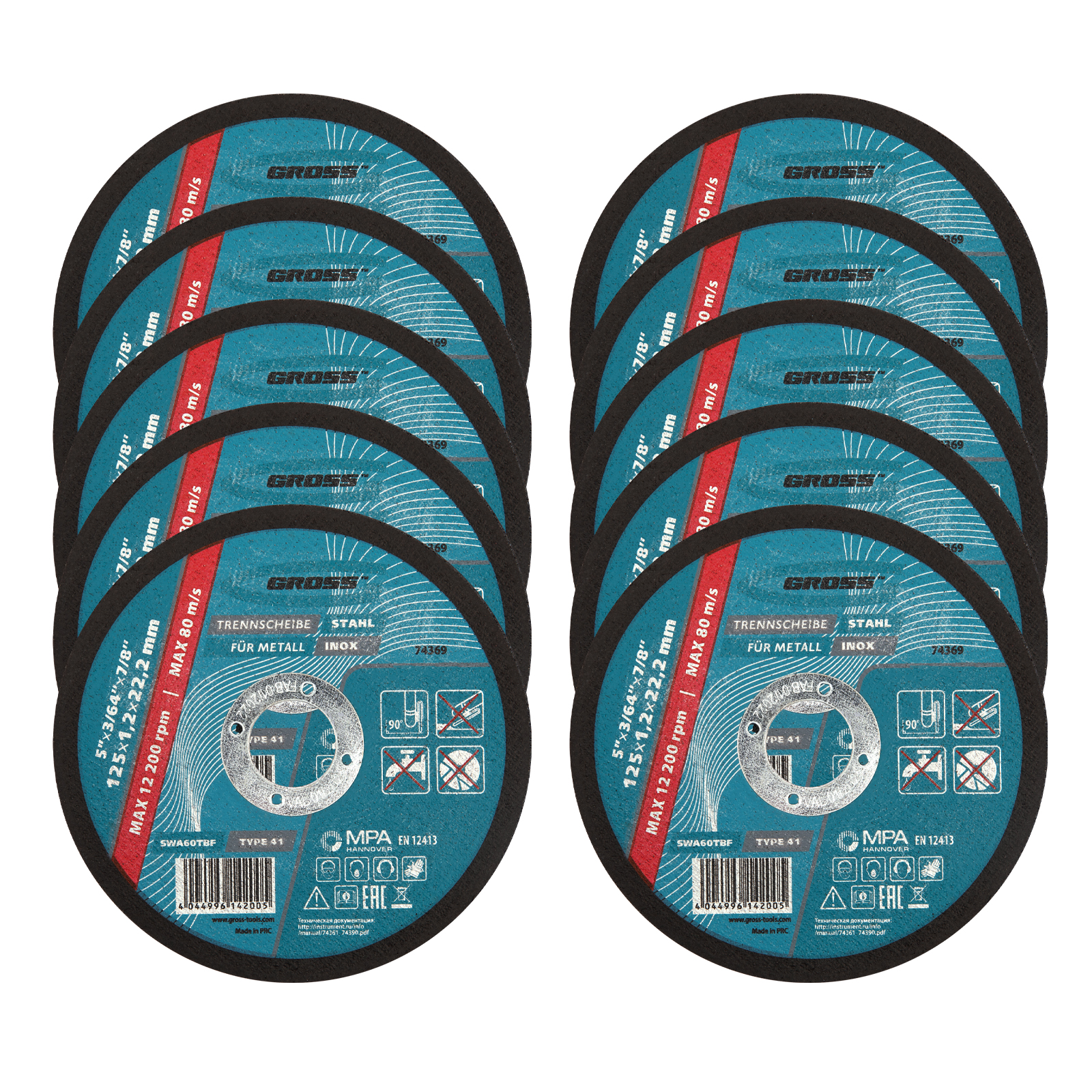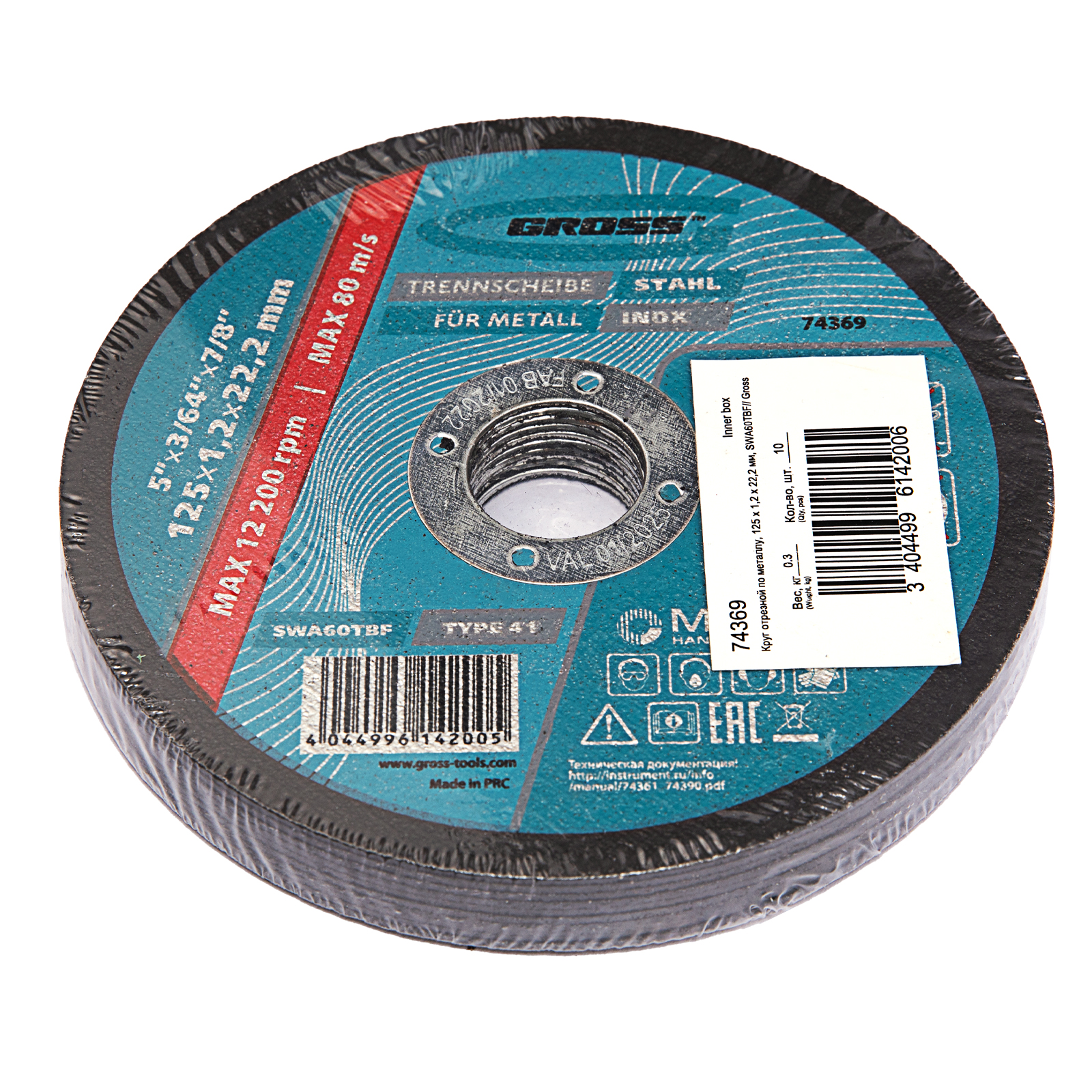 Отрезной круг по металлу Gross SWA60TBF 74369, 125 х 1,2 х 22,2 мм, рассчитан на интенсивный сухой рез нержавеющих легированных и углеродистых сталей. Устанавливается на УШМ соответствующего типоразмера. Надежный и производительный, круг подходит для профессиональной эксплуатации с высокими нагрузками.ПреимуществаАбразив из монокорунда с добавками - зерно обладает высокой твердостью и прочностью, подтачивается в процессе работы, поэтому эффективность реза не снижается.Очень высокий ресурс - в бакелитовую связку и абразив включены специальные добавки.Безопасность работы - высококачественная двухслойная стеклосетка защищает круг от перегрузок, предотвращая его разлет в случае зажатия в материале.Специальный состав - круг слабо нагревается в процессе реза, износ происходит медленно и равномерно, поэтому образуется минимальное количество пыли и искр.Толщина 1,2 мм и крупный абразив F60 - круг обеспечивает высокую скорость и точность реза.Плотная равномерная структура - круг прошел дополнительное тестирование на дисбаланс, это обеспечивает стабильность и точность работы.Проверенное качество - круг прошел контроль на всех этапах производства, что подтверждено ганноверским и российским сертификатами безопасности.