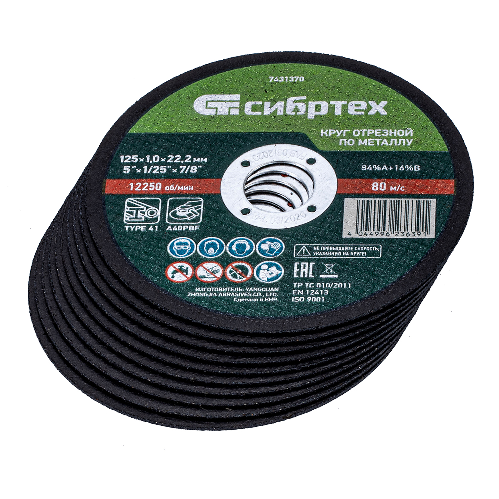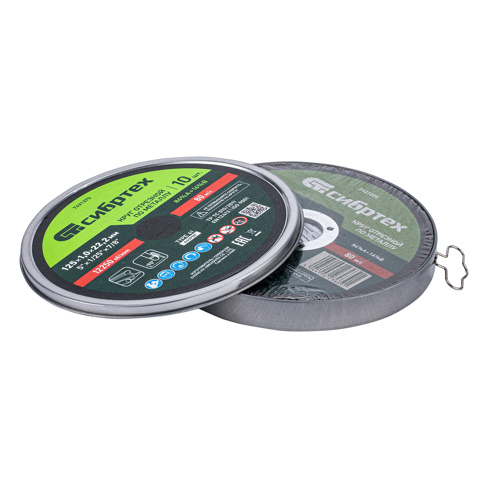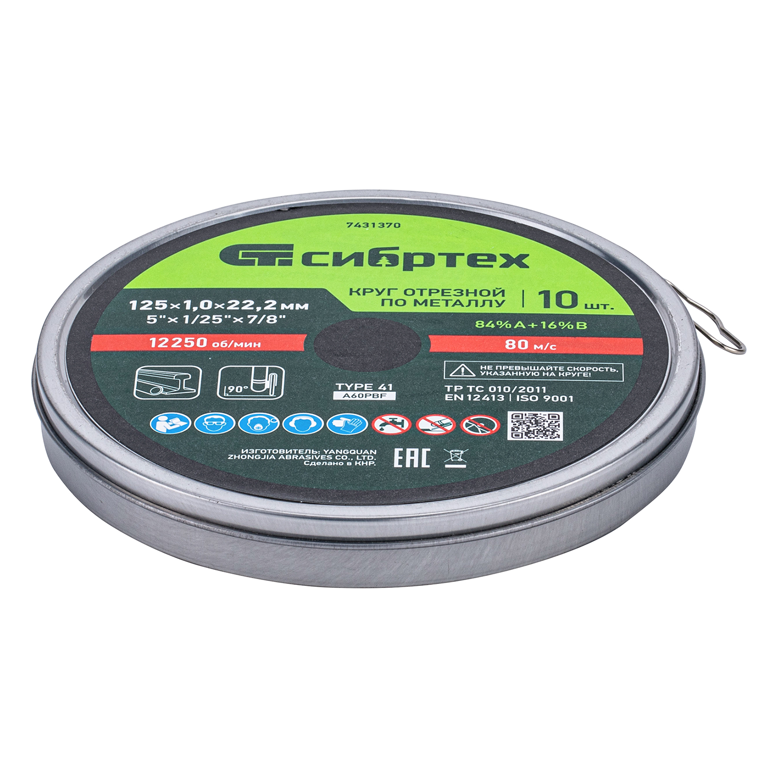 Круг отрезной по металлу Сибртех 84%A+16%B 7431370 диаметром 125 мм и толщиной 1,0 мм, 10 шт. в металлической банке, устанавливается на УШМ с посадочным размером 22,2 мм. Предназначен для сухой резки углеродистых сталей. Набор пригодится частному мастеру для проведения ремонтных работ дома или в гараже, также подойдет для профессионального применения.ПреимуществаБезопасная эксплуатация — двухслойная усиленная сетка повышает устойчивость кругов к разрыву.Увеличенный ресурс — круги изготовлены из электрокорунда нормального и бакелитовой связки средней твердости со специальными добавками.Аккуратная работа — оснастка толщиной 1 мм быстро режет сталь (при низкой нагрузке на УШМ).Выгодное приобретение — стоимость набора сопоставима с популярными аналогами российского производства.Надежная упаковка и большой запас — в набор входит 10 отрезных кругов, упакованных в металлическую банку.