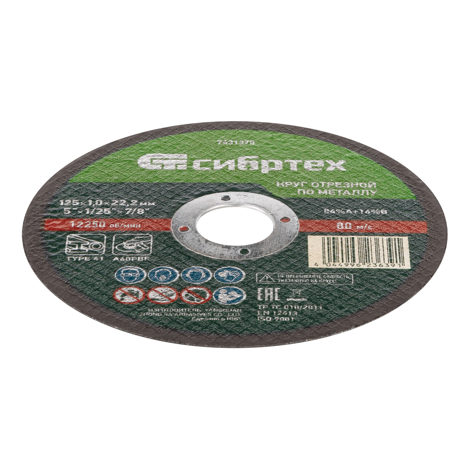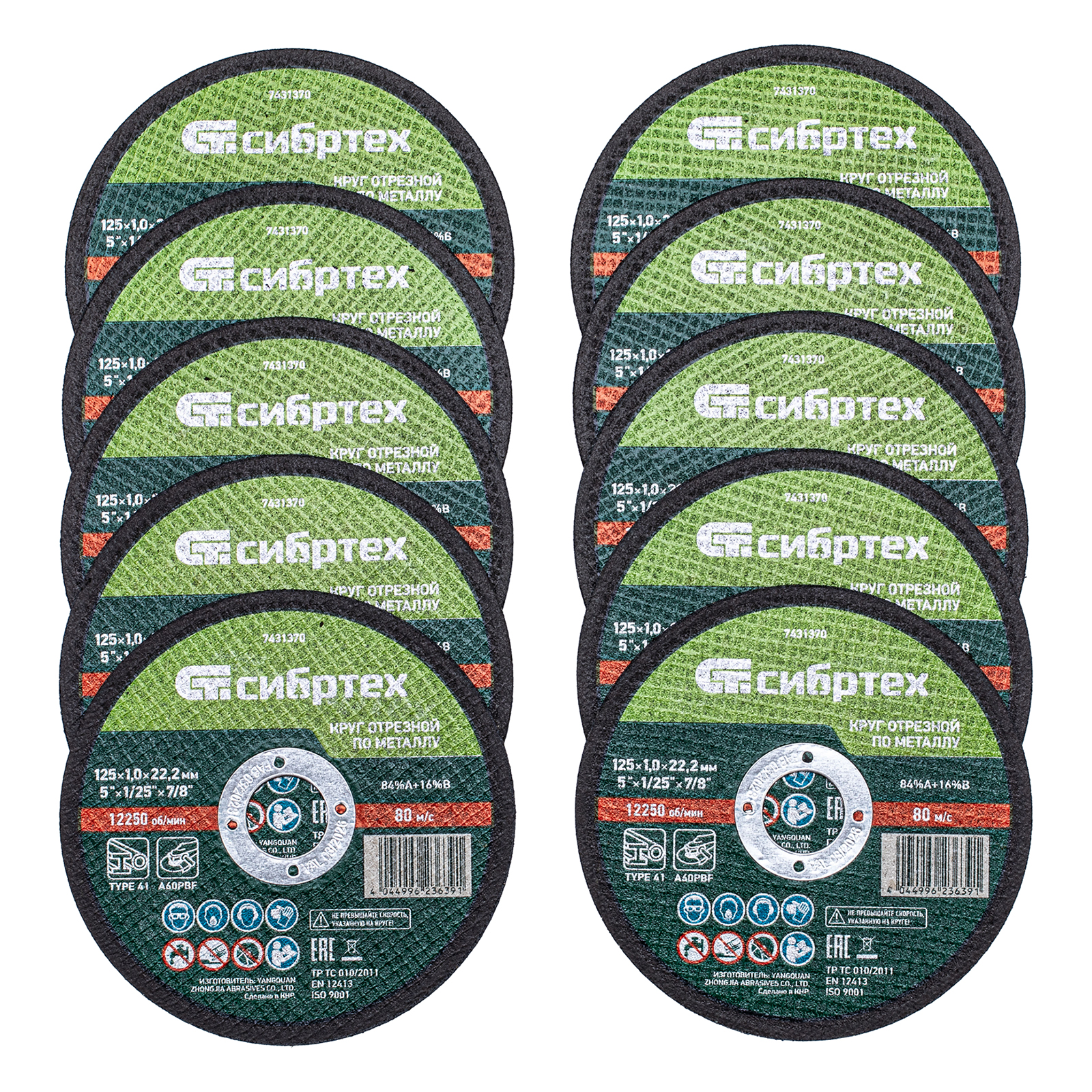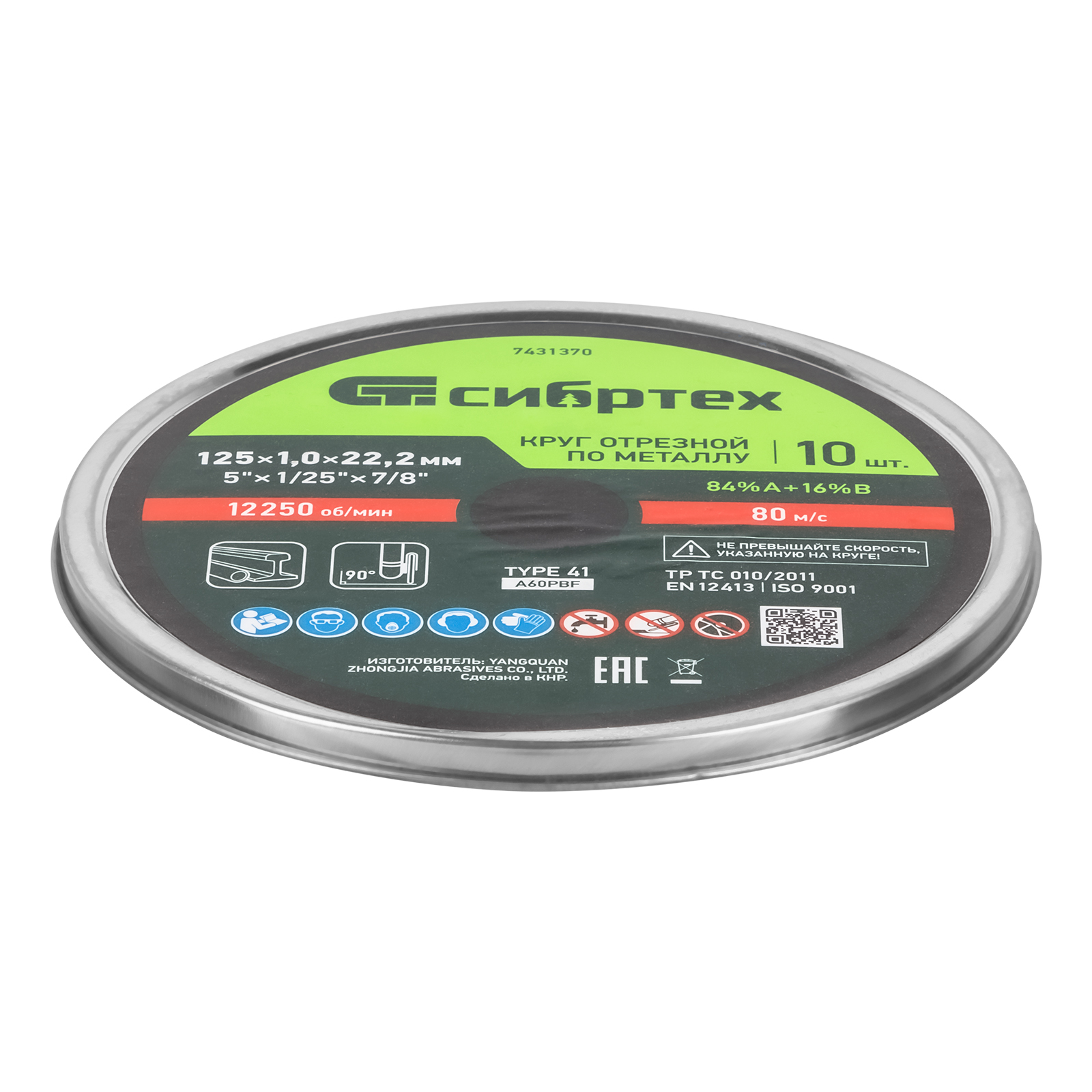 Круг отрезной по металлу Сибртех 84%A+16%B 7431370 диаметром 125 мм и толщиной 1,0 мм, 10 шт. в металлической банке, устанавливается на УШМ с посадочным размером 22,2 мм. Предназначен для сухой резки углеродистых сталей. Набор пригодится частному мастеру для проведения ремонтных работ дома или в гараже, также подойдет для профессионального применения.ПреимуществаБезопасная эксплуатация — двухслойная усиленная сетка повышает устойчивость кругов к разрыву.Увеличенный ресурс — круги изготовлены из электрокорунда нормального и бакелитовой связки средней твердости со специальными добавками.Аккуратная работа — оснастка толщиной 1 мм быстро режет сталь (при низкой нагрузке на УШМ).Выгодное приобретение — стоимость набора сопоставима с популярными аналогами российского производства.Надежная упаковка и большой запас — в набор входит 10 отрезных кругов, упакованных в металлическую банку.