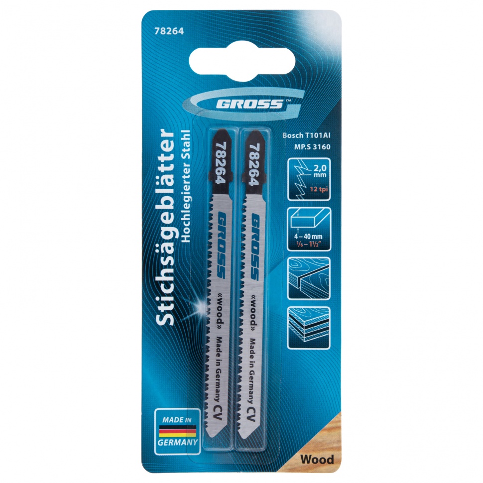 Полотна для электролобзика по дереву Gross 78264, 2 шт. (3160 - T101AI), используются для работы с древесиной мягких и твердых пород, ДСП, ДВП и композитных материалов на основе древесины. Они рассчитаны на профессиональное применение, пригодятся при проведении строительных и ремонтных работ. За счет рабочей длины 75 мм и толщины 1,45 мм полотна способны распилить заготовки толщиной 3-60 мм.ПреимуществаДолгий срок службы — полотна из хромованадиевой стали отличаются высокой твердостью и износостойкостью.Высокая точность работ — отшлифованные под конус боковые поверхности полотен и зубья с шагом 2 мм повышают качество реза, оставляя на месте распила ровную кромку.Удобное и безопасное хранение — полотна упакованы в жесткий блистер.