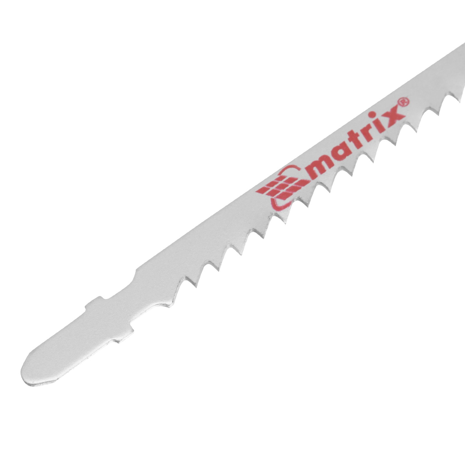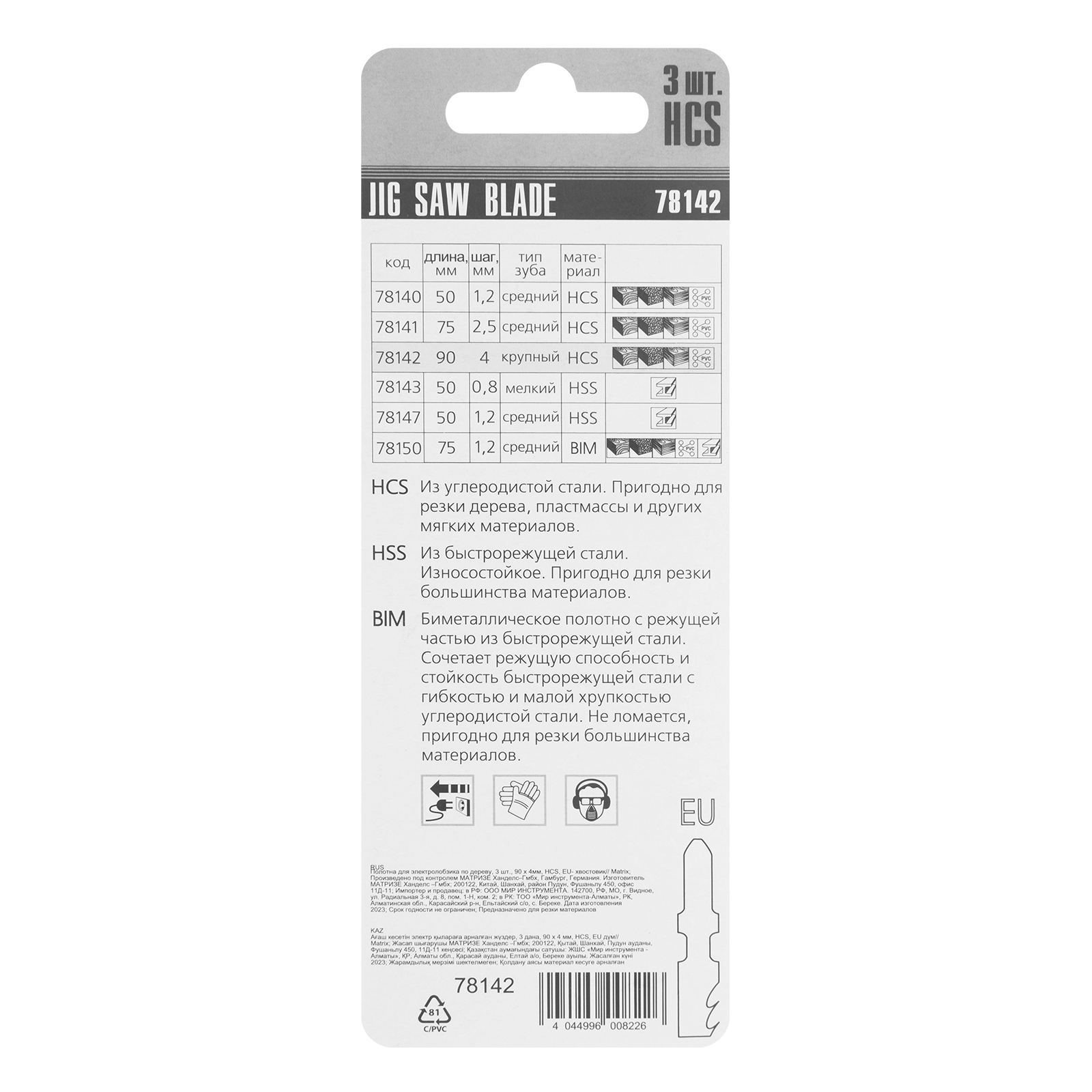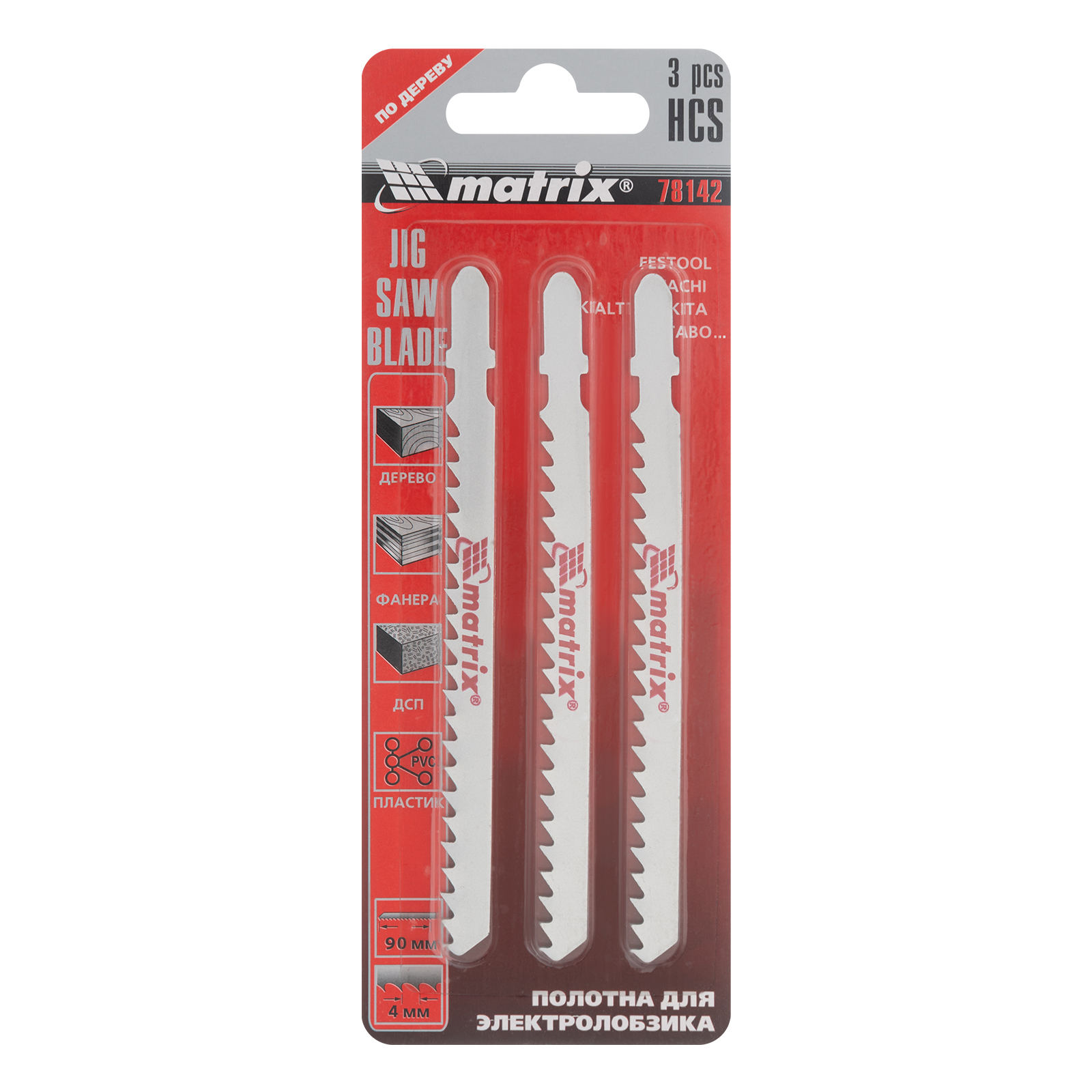 Полотна для электролобзика по дереву Matrix 78142 с рабочей длиной 90 мм и шагом зубьев 4 мм, из стали HCS, с EU-хвостовиком, 3 шт. в упаковке, — элементы оснастки электрического пильного инструмента. Применяются для распила древесины, фанеры, ДСП и пластика. Классическая разводка зубьев позволяет уменьшить нагрев полотен и повысить скорость пиления. Полотна подходят для профессионального использования и применения в домашних условиях. Преимущества Прочность и износостойкость — пилки изготовлены из высокоуглеродистой стали. Высокая производительность — шлифованный корпус и остро заточенные зубья с шагом 4 мм обеспечивают быстрый рез. Универсальность — полотна с EU-хвостовиком совместимы с большинством современных моделей электролобзиков. Удобная комплектация — в наборе 3 штуки, которых хватит надолго.