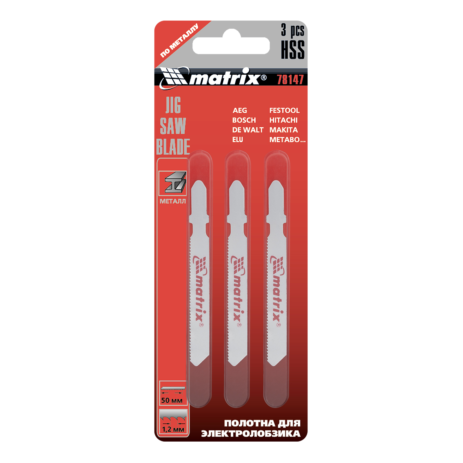 Полотна для электролобзика Matrix 78147 с шагом зубьев 1,2 мм, из стали HSS, с EU-хвостовиком, 3 шт. в упаковке, имеют рабочую длину 50 мм и предназначены для работ по металлу. Имеют стандартный Т-образный хвостовик и могут быть установлены на большинство современных моделей электролобзиков. Используются в слесарном деле, будут также полезны в быту. Преимущества Износостойкость — полотна изготовлены из быстрорежущей стали и отличаются высокой твердостью. Высокая скорость распиловки — волнообразная разводка зубьев позволяет эффективно удалять продукты пиления. Аккуратная работа — зубья с шагом 1,2 мм обеспечивают гладкий и точный рез. Удобная комплектация — 3 пилок достаточно для выполнения большого объема работ.