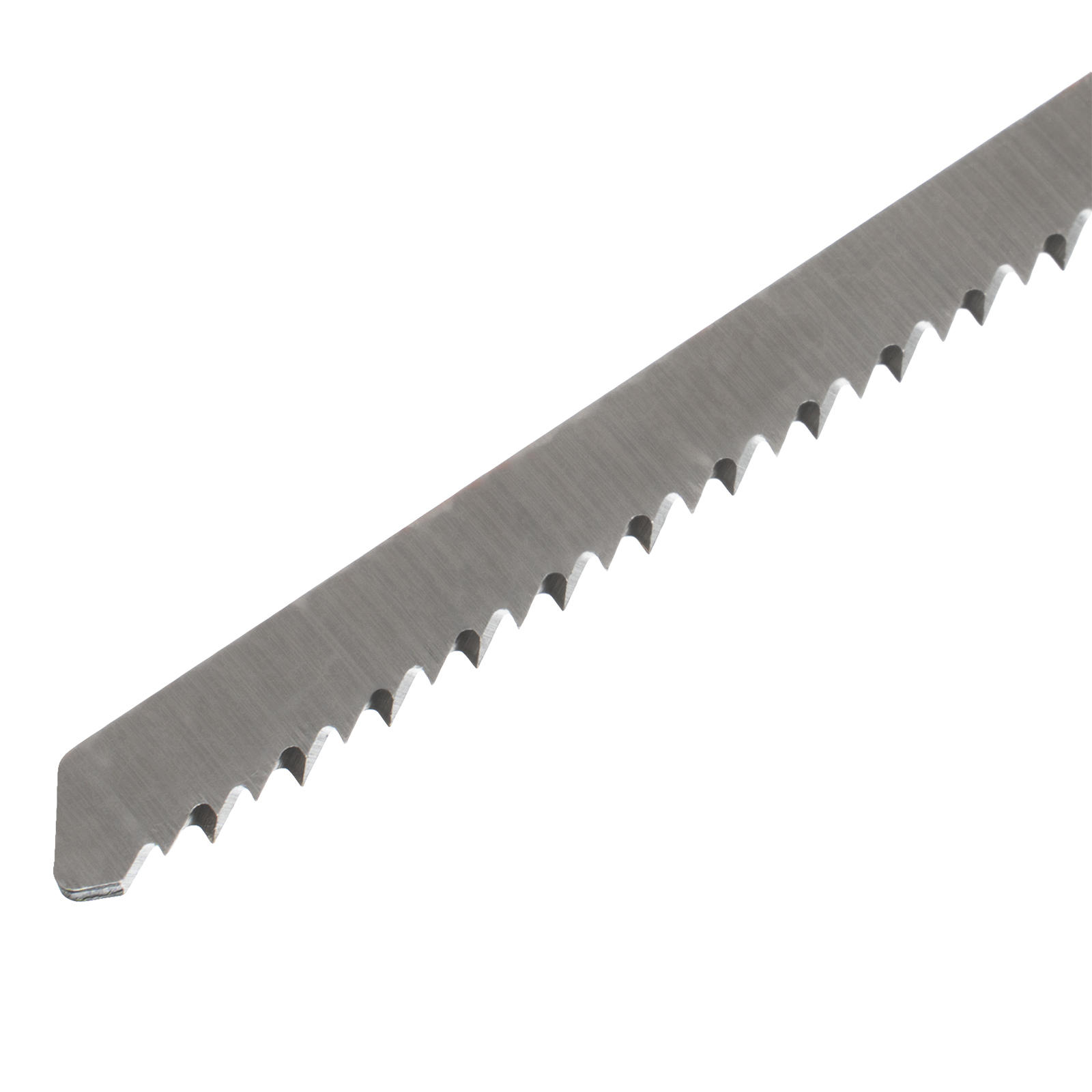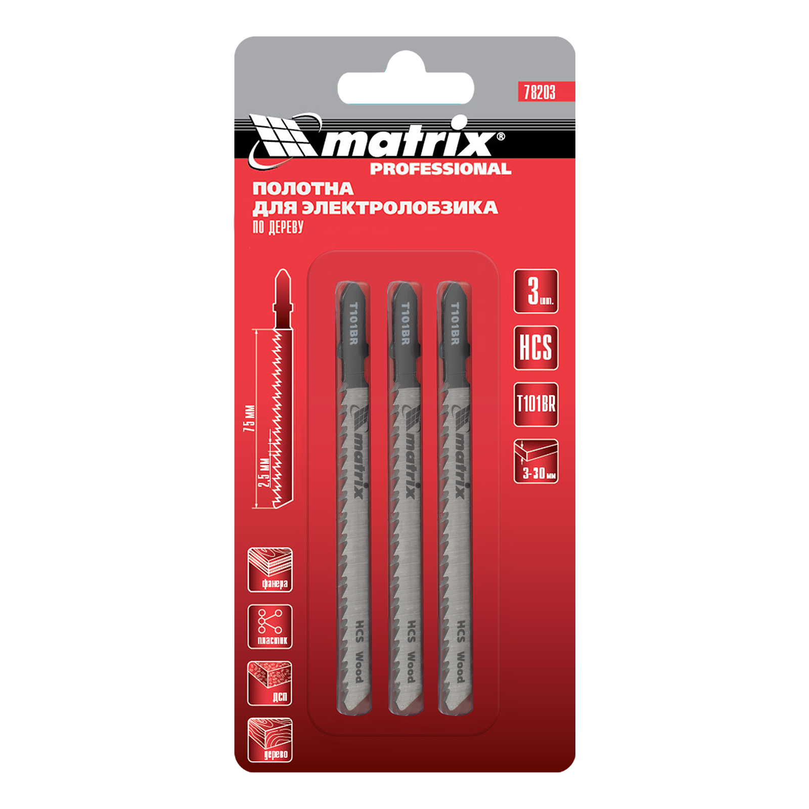 Полотна по дереву Matrix 78203, T101BR, 75 х 2,5 мм, с обратным зубом, HCS, — комплект оснасток для электролобзика из 3 шт. Предназначены для прямого реза фанеры, древесины, ДСП, ДВП и пластика толщиной от 3 до 30 мм. Имеют стандартный Т-образный хвостовик, совместимый с держателями большинства современных моделей электролобзиков. Обратное направление зубьев позволяет чисто распиливать заготовки с лицевой стороны. Полотна используются при проведении профессиональных столярных работ, а также будут полезны в быту. Преимущества Пилки из высокоуглеродистой стали У8 характеризуются прочностью и износостойкостью. Режущие кромки, закаленные в вакуумной печи до твердости 48-52 HRC, устойчивы к истиранию и обладают высоким ресурсом. Зубья с шагом 2.5 мм обеспечивают тонкий и чистый распил. Полотна, изготовленные на узкоспециальном оборудовании с применением новейших технологий, отличаются высоким качеством. Упаковки из 3 шт. хватит надолго.