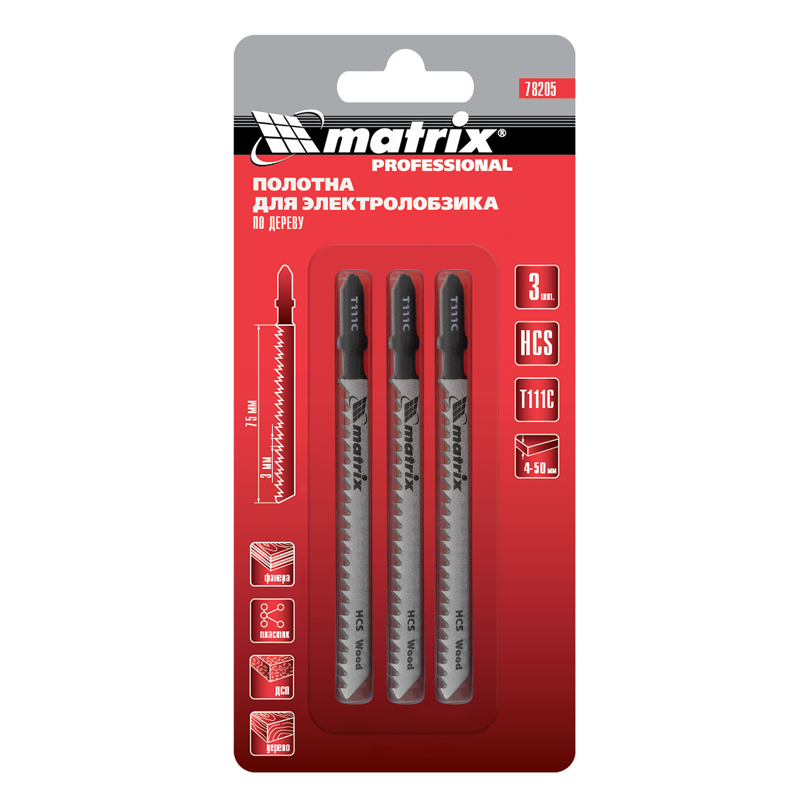 Полотна по дереву Matrix 78205, T111C, 75 х 3 мм, HCS, — комплект оснасток для электролобзика из 3 шт. Предназначены для прямого реза фанеры, древесины, ДСП, ДВП и пластика толщиной от 4 до 50 мм. Имеют стандартный Т-образный хвостовик, совместимый с держателями большинства современных моделей электролобзиков. Полотна используются при проведении профессиональных столярных работ, а также будут полезны в быту. Преимущества Пилки из высокоуглеродистой стали У8 характеризуются прочностью и износостойкостью. Режущие кромки, закаленные в вакуумной печи до твердости 48-52 HRC, устойчивы к истиранию и обладают высоким ресурсом. Зубья с шагом 3 мм обеспечивают быстрый и чистый распил. Полотна, изготовленные на узкоспециальном оборудовании с применением новейших технологий, отличаются высоким качеством. Упаковки из 3 шт. хватит надолго.