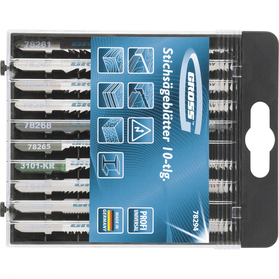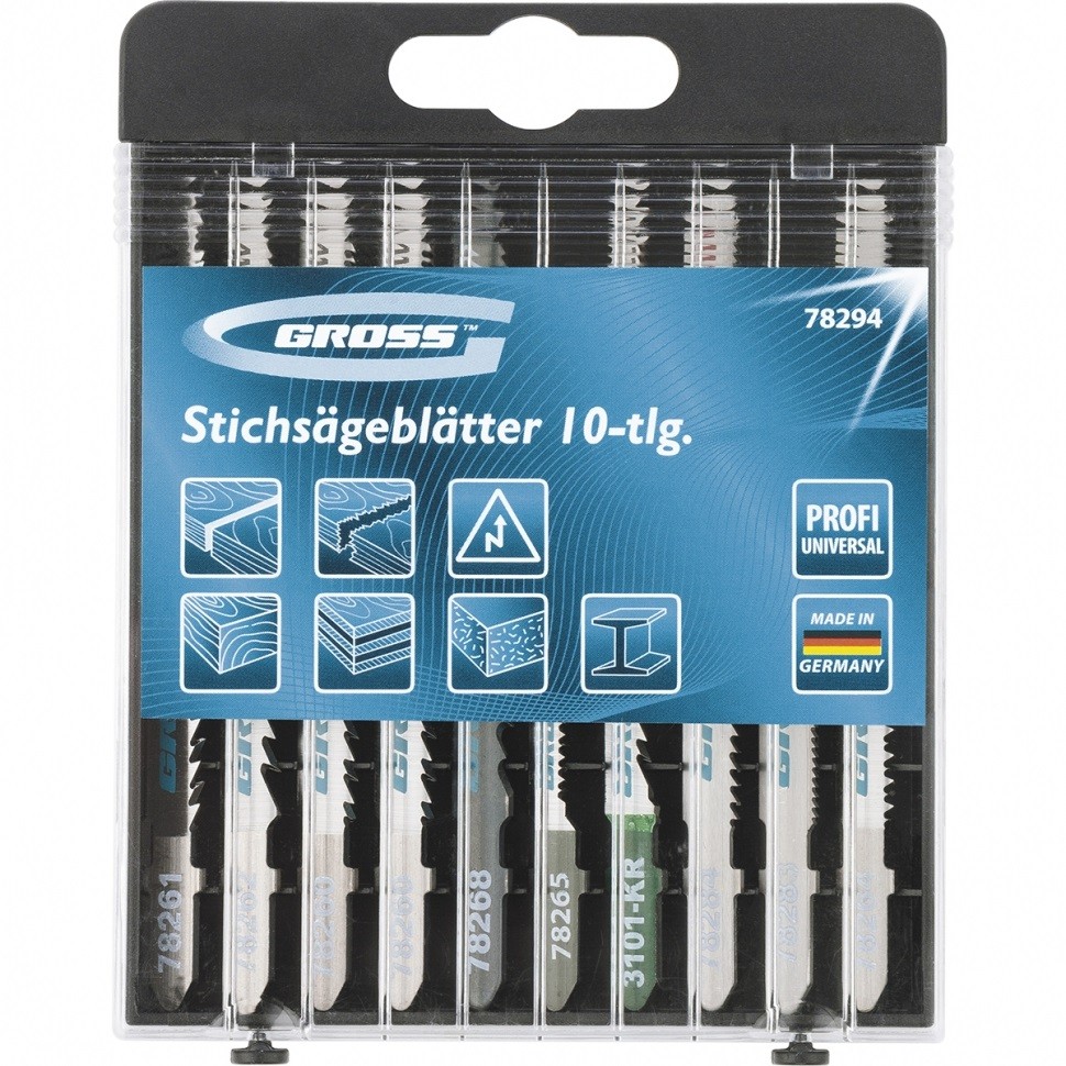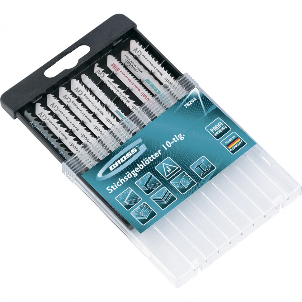 Универсальный набор полотен для электролобзика Gross Profi 78294, 10 шт. в пластиковом кейсе, предназначен для чистого и быстрого прямолинейного распила деревянных и металлических материалов. Каждое полотно отличается высоким качеством, поэтому набор прослужит долгое время даже в условиях интенсивной эксплуатации.ПреимуществаВысокая твердость и износостойкость — все полотна в наборе выполнены из немецкой хромованадиевой стали.Чистый рез без сколов — боковая поверхность полотен отшлифована под конус.Высокое качество исполнения — полотна сделаны по технологии лазерного раскроя, заточены и отшлифованы на автоматизированном оборудовании.Универсальность — набор включает 10 полотен, которые позволяют выполнить самые распространенные работы по дереву и листовому металлу.Пластиковый кейс — набор удобно хранить и транспортировать.