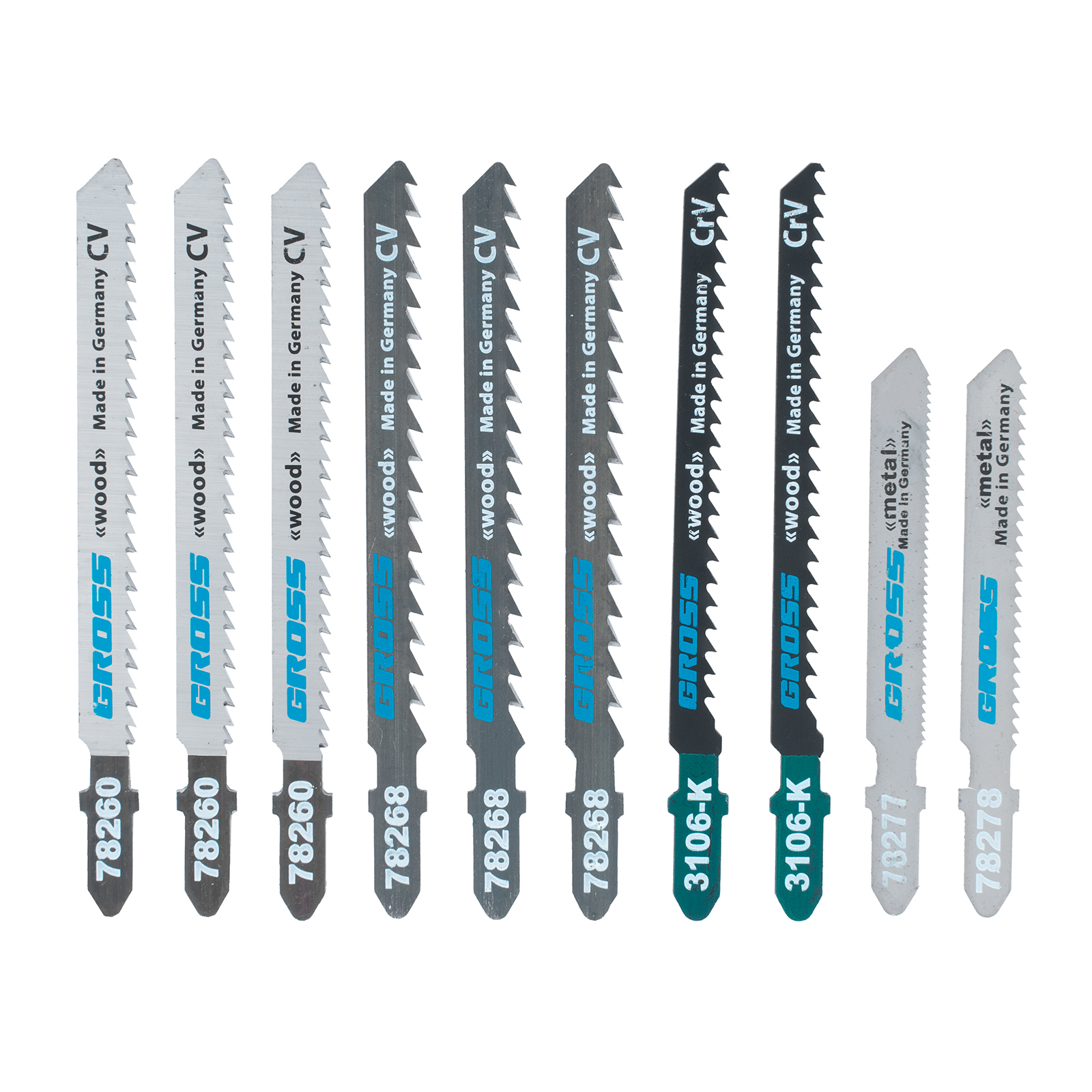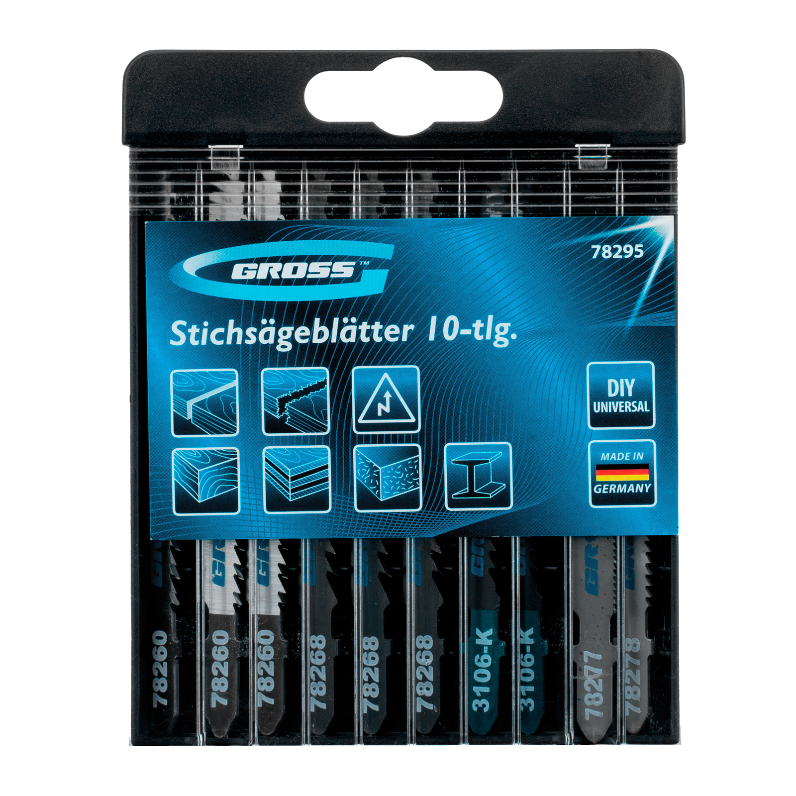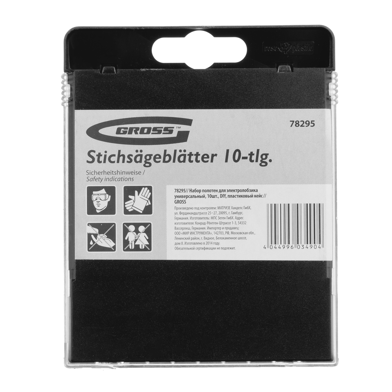 Универсальный набор полотен для электролобзика Gross DIY 78295, 10 шт. в в пластиковом кейсе, предназначен для чистого и быстрого прямолинейного распила деревянных и металлических материалов. Каждое полотно отличается высоким качеством, поэтому набор прослужит долгое время даже в условиях интенсивной эксплуатации.ПреимуществаВысокая твердость и износостойкость — все полотна в наборе выполнены из немецкой хромованадиевой стали.Чистый рез без сколов — боковая поверхность полотен отшлифована под конус.Высокое качество исполнения — полотна изготовлены с применением лазерного раскроя, заточены и отшлифованы на автоматизированном оборудовании.Универсальность — набор включает 10 полотен для выполнения самых распространенных работ по дереву и листовому металлу.Удобство хранения и транспортировки — набор поставляется в пластиковом кейсе.