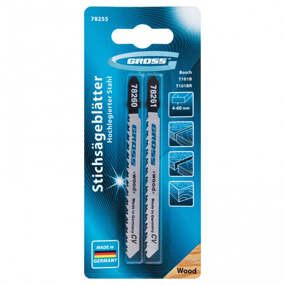 Набор полотен для электролобзика Gross 78255, 2шт. (T101B, T101BR), — это профессиональный инструмент для работ по дереву. Он рассчитан на распил древесины любых пород, а также фанеры, ДВП и пластика. Полотна позволяют осуществить чистый и быстрый рез. Благодаря длине 100 мм они справляются с распилом материалов толщиной 4-60 мм.ПреимуществаИзносостойкость и высокая твердость — полотна выполнены из прочной немецкой хромованадиевой стали.Технологичное производство — лазерная раскройка профиля, автоматизированная шлифовка и заточка позволили добиться высокого качества полотен.Универсальность — благодаря Т-образному хвостовику полотна подходят для большинства существующих электролобзиков.Удобное и безопасное хранение — набор поставляется в жесткой термоформованной пленочной коробке.