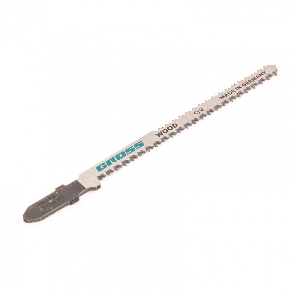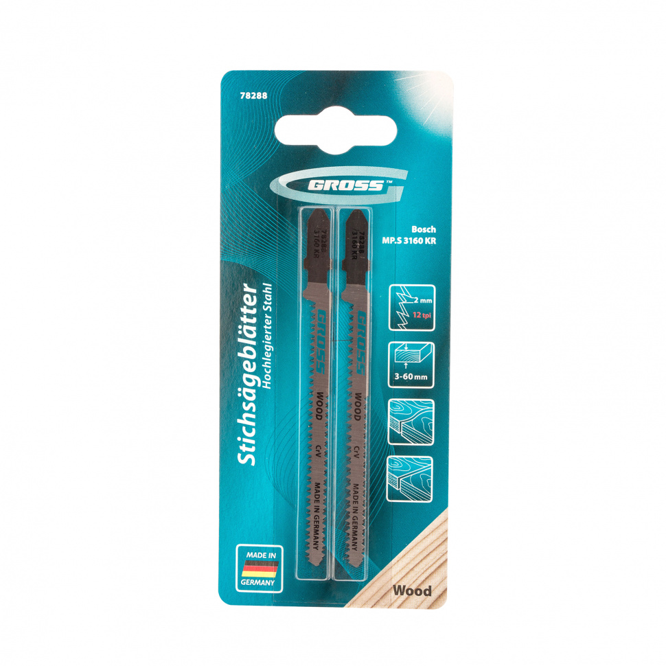 Двухсторонние полотна для электролобзика по дереву Gross 78288, 2 шт. (3160 KR), подходят для прямого и чистого фигурного реза материалов. Могут применяться для обработки древесины, фанеры, ДСП, ДВП, а также пластика толщиной 3-60 мм. Двухсторонний профиль обеспечивает качественный гладкий распил, полотна рассчитаны на профессиональное применение.ПреимуществаИзносостойкость и прочность — полотна выполнены из инструментальной хромованадиевой стали с высоким содержанием углерода.Закалка в вакуумных печах — полотна обладают высокой твердостью, способны выдерживать длительную эксплуатацию без риска перегрева и поломки зубьев.Точность работы — шаг зубьев полотен составляет 2 мм, кромка получается аккуратной и чистой.