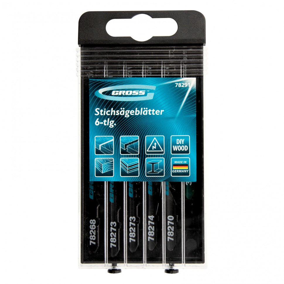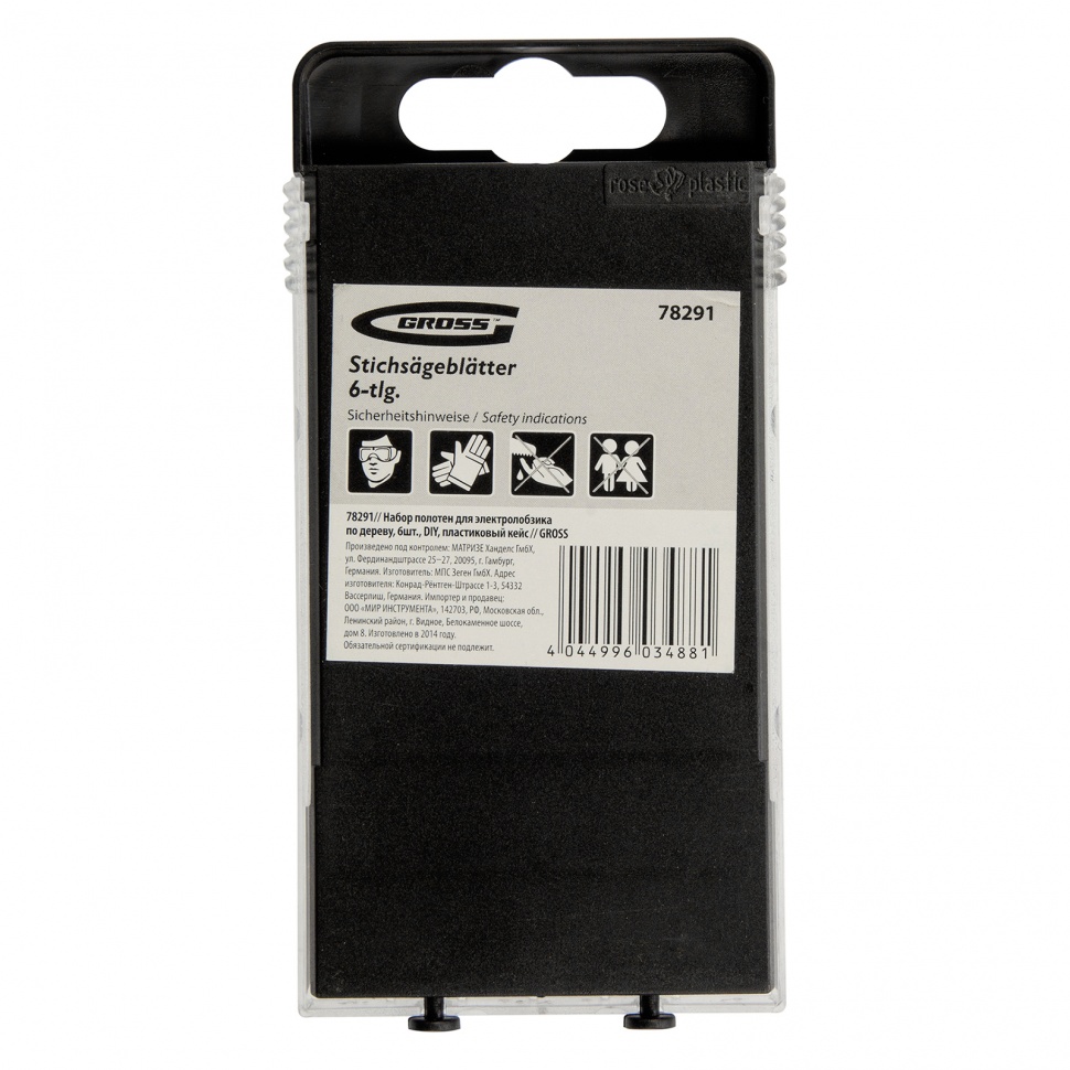 Набор полотен для электролобзика Gross DIY 78291, 6 шт., в пластиковом кейсе, — это универсальное решение для работы с деревянными изделиями и заготовками. Позволяет осуществить чистый и быстрый прямолинейный рез. Благодаря высокому качеству полотна выдерживают интенсивные нагрузки и подходят для профессионального применения.ПреимуществаВсе полотна в наборе выполнены из немецкой хромованадиевой стали, это придает им высокую твердость и износостойкость.Боковая поверхность полотен отшлифована под конус, посредством чего достигается ровная кромка в месте распила.Полотна изготовлены с применением уникальной техники лазерного раскроя, прошли автоматизированную заточку и шлифовку, что гарантирует их высокое качество.Пластиковый кейс позволяет с удобством хранить и транспортировать набор.