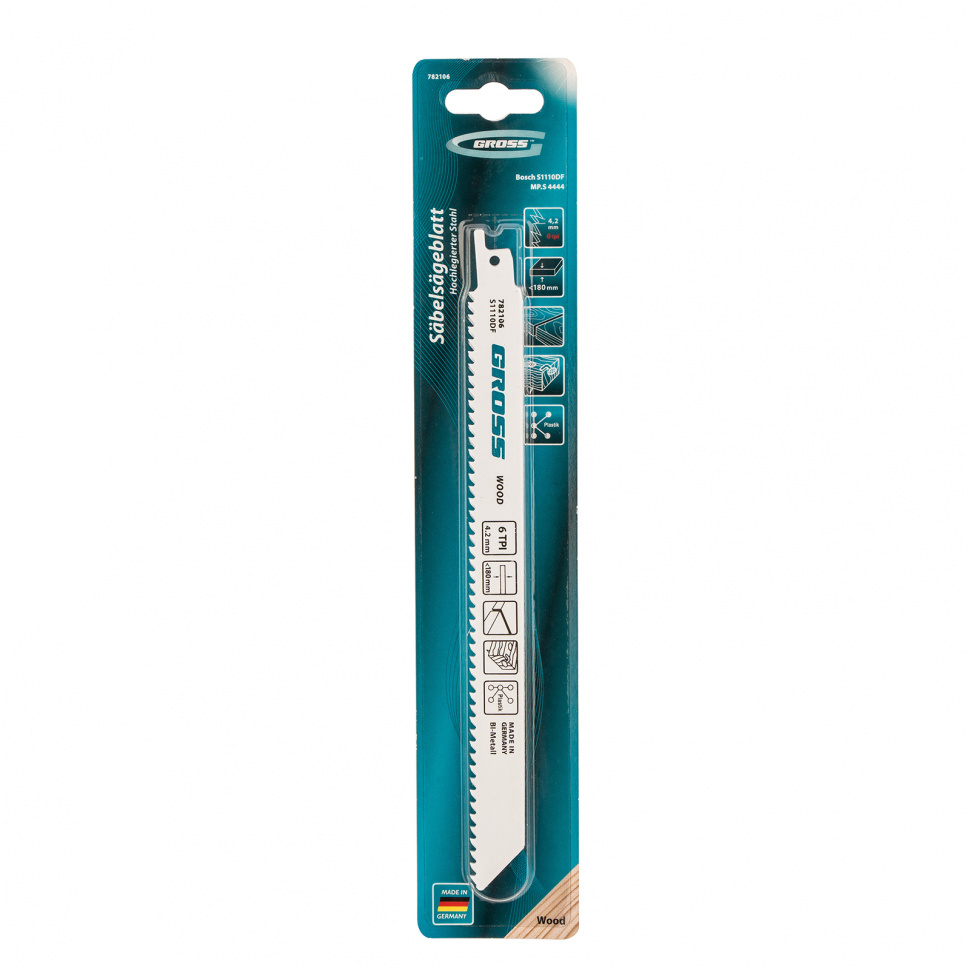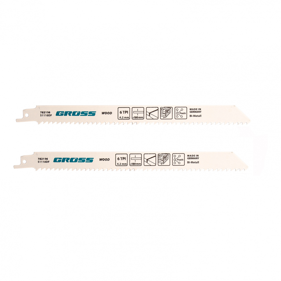 Полотна по дереву Gross 782106, 4444 - S1110DF, 210 x 4,2 мм, 2 шт., предназначены для установки на сабельную пилу. Они оптимальны для демонтажа изделий из дерева: мебели, окон, ограждений и различных конструкций. Увеличенная толщина 1,57 мм обеспечивает высокую надежность полотен, поэтому они рассчитаны на профессиональное применение.ПреимуществаБиметаллические полотна характеризуются упругостью и стойкостью к износу, что гарантирует их долговечность.Шаг зубьев полотен составляет 4,2 мм, посредством чего достигается их отличная режущая способность и эффективность работы.Высококачественные зубья не теряют своих свойств при нагреве, за счет чего они легко выдерживают интенсивную эксплуатацию.Полотна произведены в Германии с многоступенчатой проверкой качества.Комплект состоит из двух полотен, которых хватит на долгое использование.