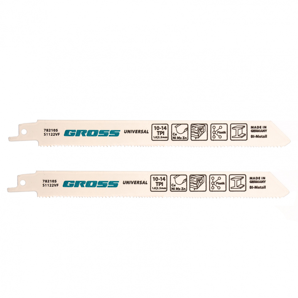 Полотна универсальные для сабельной пилы Gross 782105, 4431 VP - S1122VF, размером 180 x 1,8-2,5 мм, 2 шт., подходят для демонтажа конструкций, содержащих мелкие металлические детали: окон, мебели, перегородок, а также пригодятся при осуществлении ремонтных и строительных работ. Увеличенная длина 180 мм и шаг зубьев 1,8-2,5 мм позволяют выполнять распил любых материалов: древесины, ДСП и ламината толщиной 5-150 мм, металла 3-10 мм, пластика и оргстекла 3-150 мм. Они будут полезны для профессиональных мастеров.ПреимуществаПолотна выполнены из биметалла, поэтому обладают оптимальным соотношением гибкости, прочности и износостойкости.Производство находится в Германии, на каждом этапе изделия были проверены на качество и соответствие действующим стандартам.Переменный шаг зубьев 1,8 и 2,5 мм обеспечивает универсальность полотен, позволяя резать материалы любой толщины.Закаленные зубья обладают высокой режущей способностью даже при нагреве, поэтому полотна выдерживают высокие нагрузки.Комплекта из двух полотен хватит на долгое использование.