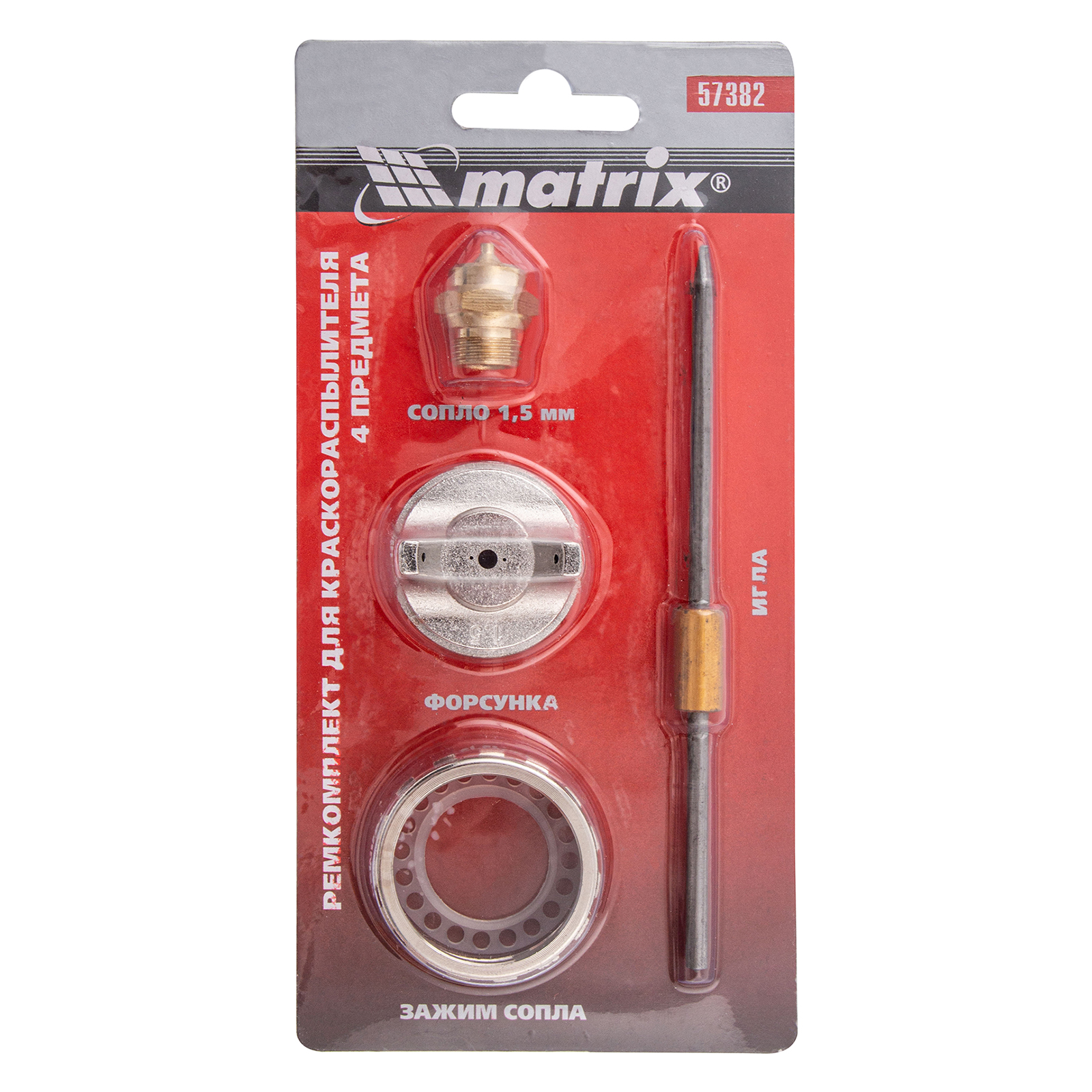 Ремкомплект Matrix 57382 предназначен для замены деталей на краскораспылителях Matrix 57314, 57315, 57316, 57317 и состоит из 4 предметов: сопла диаметром 1,5 мм, иглы, форсунки, зажима. Сопло, надежно фиксируемое зажимом, позволяет работать с густыми красками, грунтовками и шпаклевками.ПреимуществаНадежность — все предметы в наборе выполнены из стали и устойчивы к воздействию сжатого воздуха.Управление подачей краски — игла позволяет мгновенно открывать и закрывать сопло.Диаметр форсунки 33 мм — подача узкой струи раствора удобна для окрашивания небольших деталей.