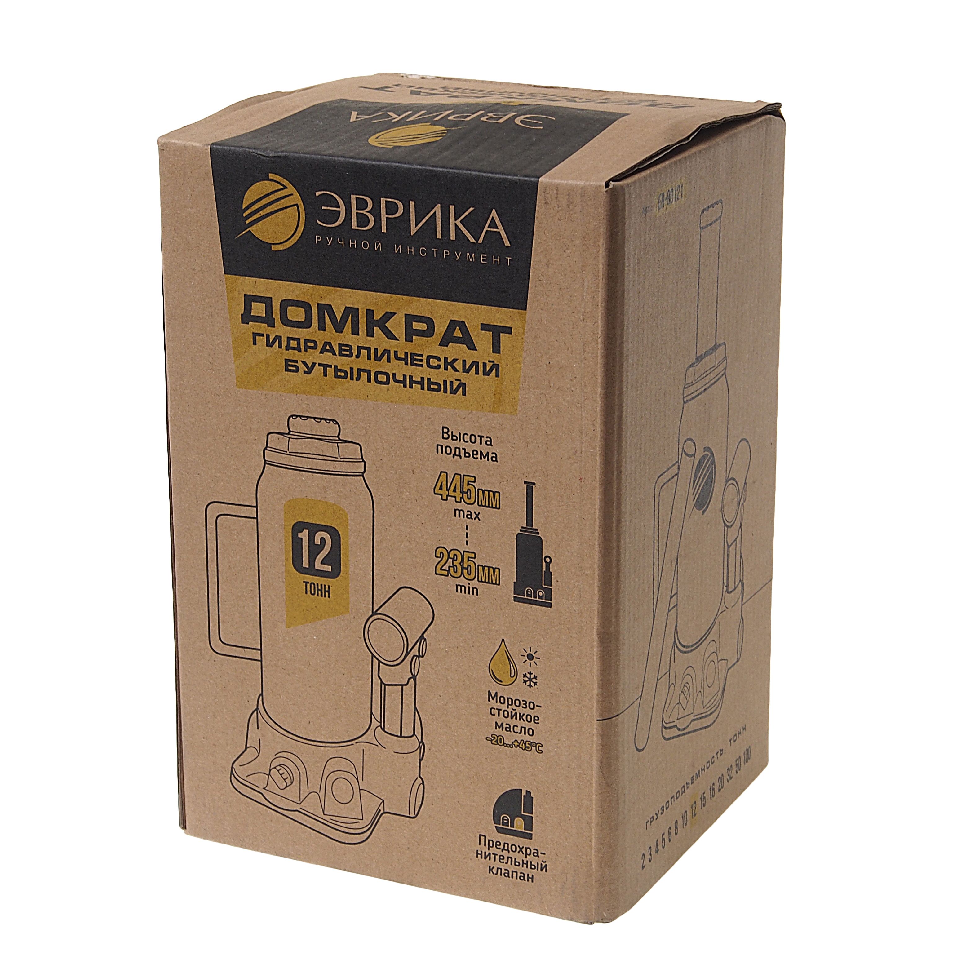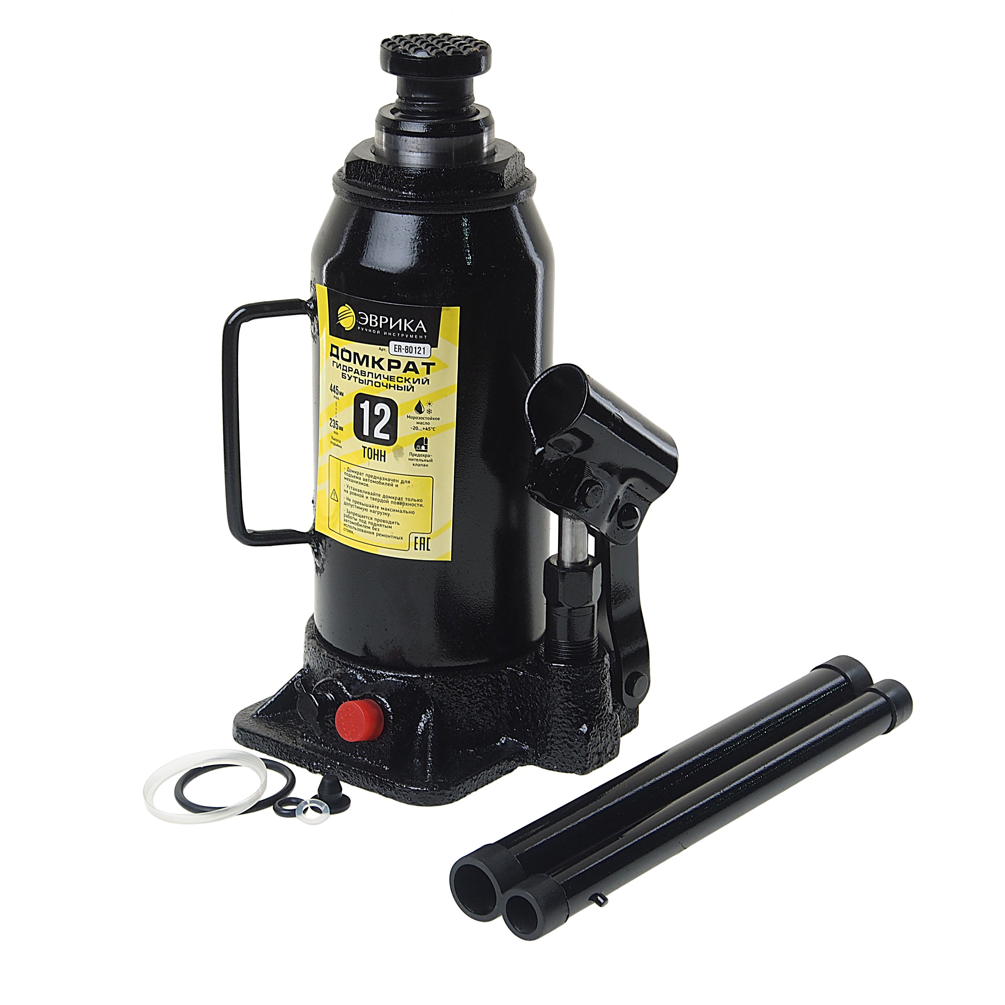 Домкрат 12т гидравлический ER-80121 бутылочный с клапаном, ремкомплект с диапазоном подъема 235-445мм ЭВРИКА используется для поднятия транспорта при проведении шиномонтажных и ремонтных работ.