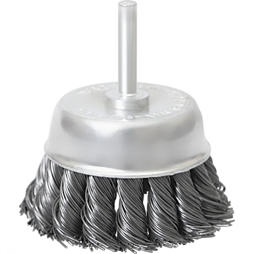 Щетка для дрели «чашка» Matrix 74470 со шпилькой, 75 мм, с щетиной из крученой металлической проволоки, — оснастка для электродрелей с патроном под хвостовик диаметром 6 мм. Рекомендуемая скорость вращения 12500 об/мин. Насадку используют для зачистки сварных швов и черновой обработки металлических, деревянных, бетонных поверхностей. Щетка эффективно удаляет толстый слой загрязнений, ржавчины, ЛКМ. Благодаря форме «чашка» насадка оптимальна для обработки значительных по площади поверхностей. Ее применяют в строительстве, машиностроении, а также в быту. Во время работы необходимо использовать средства индивидуальной защиты.ПреимуществаЩетина состоит из пучков, скрученных из высококачественной стальной проволоки, поэтому устойчива к повышенным нагрузкам.Диаметр проволоки составляет 0,5 мм, поэтому щетка подходит для работы с различными видами загрязнений.Цинковое покрытие корпуса и техническое масло, нанесенное на щетину, защищают оснастку от коррозии.Щетка изготовлена на крупном заводе с соблюдением все технологических норм, что гарантирует ее высокое качество.
