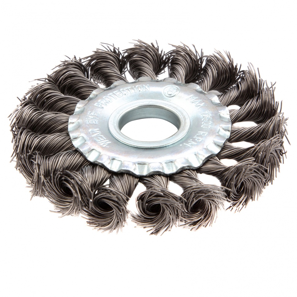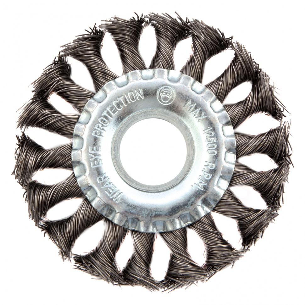 Плоская щетка Matrix 74630 диаметром 100 мм и посадкой 22,2 мм, с щетиной из крученой проволоки толщиной 0,5 мм, устанавливается на вал УШМ, поддерживающей скорость вращения не более 12500 об/мин. Эффективно удаляет загрязнения, толстый слой ржавчины и лакокрасочных материалов с поверхностей, поэтому используется для проведения грубой (черновой) обработки. Плоской щеткой удобно очищать труднодоступные места, в том числе углы и изгибы.ПреимуществаДолговечность — щетина из высококачественной стальной проволоки устойчива к износу.Универсальность — щетка подходит для обработки любых твердых поверхностей: из металла, древесины, цветных металлов, пластика и т. д.Стойкость к разрушению — корпус оцинкован, а щетина покрыта техническим маслом для защиты от коррозии.