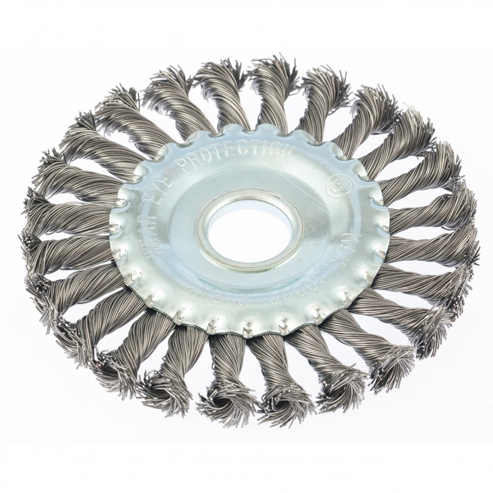 Плоская щетка Matrix 74632 диаметром 125 мм и посадкой 22,2 мм, с щетиной из крученой проволоки толщиной 0,5 мм, устанавливается на вал УШМ, поддерживающей скорость вращения не более 10000 об/мин. Эффективно удаляет загрязнения, толстый слой ржавчины и лакокрасочных материалов с поверхностей, поэтому используется для проведения грубой (черновой) обработки. Плоской щеткой удобно очищать труднодоступные места, в том числе углы и изгибы.ПреимуществаДолговечность — щетина из высококачественной стальной проволоки устойчива к износу.Универсальность — щетка подходит для обработки любых твердых поверхностей: из металла, древесины, цветных металлов, пластика и т. д.Стойкость к разрушению — корпус оцинкован, а щетина покрыта техническим маслом для защиты от коррозии.