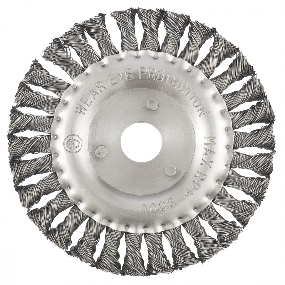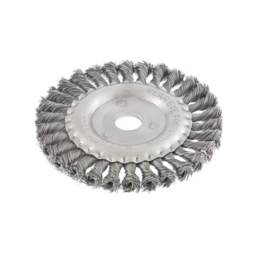 Плоская щетка Matrix 74634 диаметром 150 мм и посадкой 22,2 мм, с щетиной из крученой проволоки толщиной 0,5 мм, устанавливается на вал УШМ, поддерживающей скорость вращения не более 9000 об/мин. Эффективно удаляет загрязнения, толстый слой ржавчины и лакокрасочных материалов с поверхностей, поэтому используется для проведения грубой (черновой) обработки. Плоской щеткой удобно очищать труднодоступные места, в том числе углы и изгибы.ПреимуществаДолговечность — щетина из высококачественной стальной проволоки устойчива к износу.Универсальность — щетка подходит для обработки любых твердых поверхностей: из металла, древесины, цветных металлов, пластика и т. д.Стойкость к разрушению — корпус оцинкован, а щетина покрыта техническим маслом для защиты от коррозии.