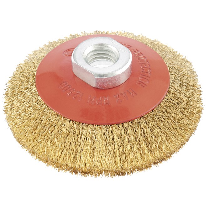 Щетка Matrix «тарелка» 74612 диаметром 115 мм, с щетиной из латунированной витой проволокой и гайкой М14, — насадка для УШМ, использующаяся для удаления с поверхностей ржавчины и загрязнений, старого слоя ЛКМ. Рекомендованная скорость вращения — не более 12500 об/мин. Щетка является универсальным инструментом, позволяющим обрабатывать как большие плоские поверхности, так и углы.ПреимуществаВысокий ресурс — щетина выполнена из прочной стальной проволоки.Универсальность — щетка подходит для обработки древесины, металла, пластика и других твердых поверхностей.Аккуратная работа — витая щетина снимает тонкий слой материала.Коррозионная стойкость — корпус щетки покрыт защитной эмалью, щетина латунирована.