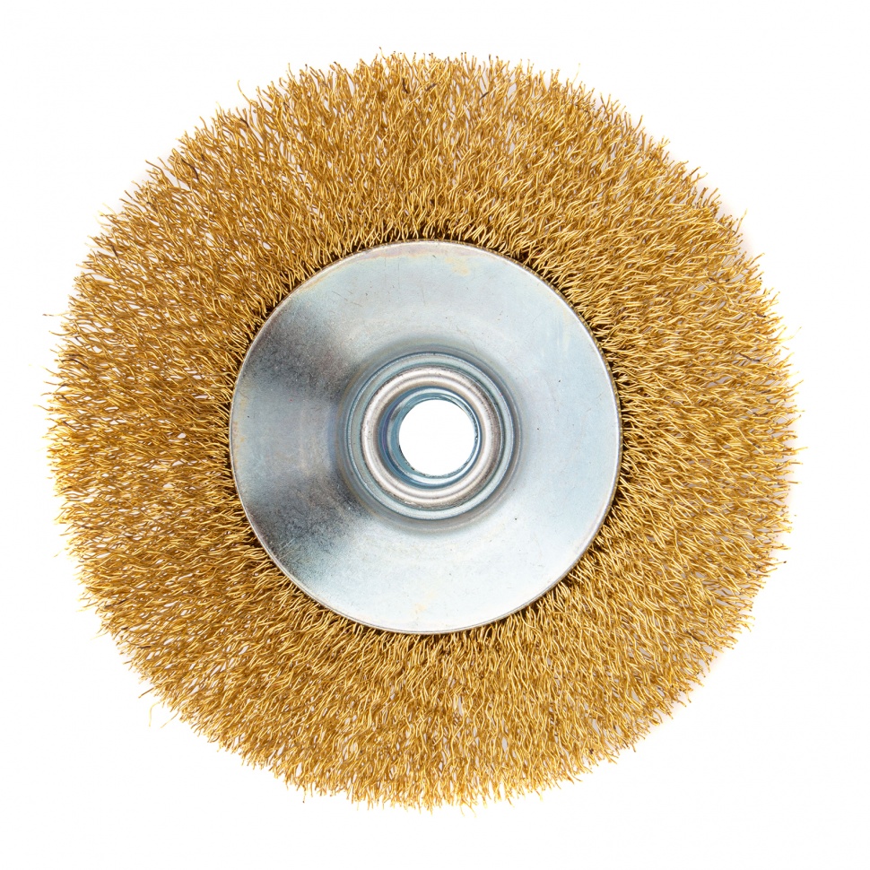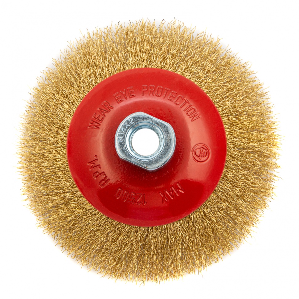 Щетка Matrix «тарелка» 74616 диаметром 125 мм, с щетиной из витой проволоки, с резьбой М14, устанавливается на вал УШМ, поддерживающей скорость вращения 12500 об/мин. Подходит для щадящей обработки поверхностей, снятия тонкого слоя ржавчины, лакокрасочных покрытий и загрязнений. Универсальная форма «тарелка» позволяет использовать щетку для зачистки углов и плоскостей.ПреимуществаВысокий ресурс — щетина из высококачественной стальной проволоки отличается износостойкостью.Универсальность — можно обрабатывать любые твердые материалы: металл, древесину, цветные металлы, пластик и т.д.Защита от разрушения — латунированная щетина и покрытый эмалью корпус устойчивы к коррозии.
