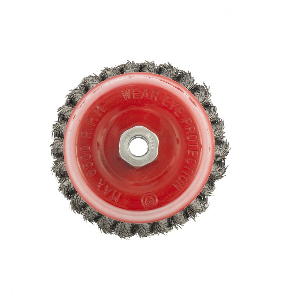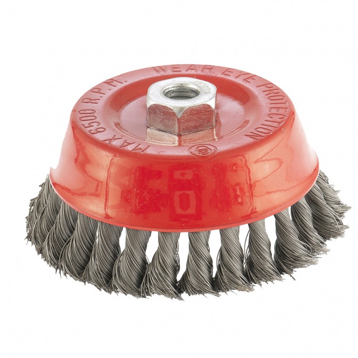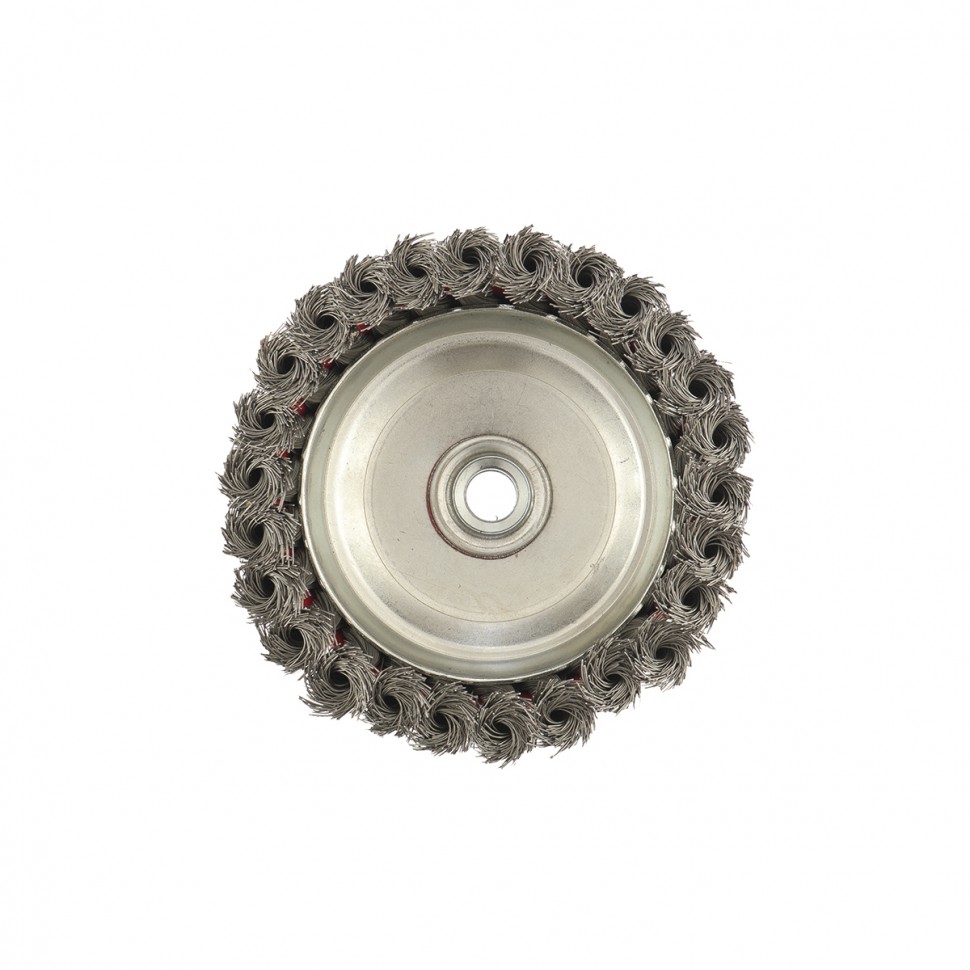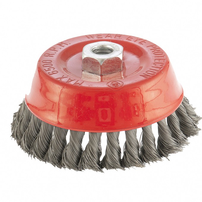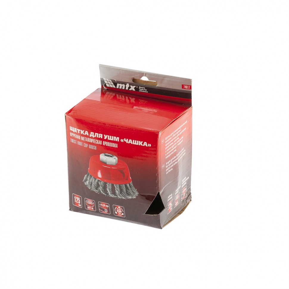 Щетка Matrix «Чашка» 74617 диаметром 125 мм, с присоединительной резьбой М14, с щетиной из крученой проволоки диаметром 0,35 мм, устанавливается на УШМ, поддерживающую работу со скоростью 6500 об/мин. Щетина предназначена для грубой (черновой) обработки поверхностей, менее агрессивной по сравнению с щетиной 0,5 мм. Изделие подходит для удаления загрязнений, снятия толстого слоя ржавчины, ЛКМ, зачистки сварных швов.ПреимуществаПрочность и долговечность — щетина из крученой стальной проволоки выдерживает значительные нагрузки.Высокая производительность — насадка формы «чашка» оптимальна для зачистки больших поверхностей.Универсальность — щетка подходит для обработки любых твердых материалов: металла, древесины, цветных металлов, пластика и т. д.Устойчивость к разрушению — корпус покрыт эмалью, а щетина —техническим маслом.